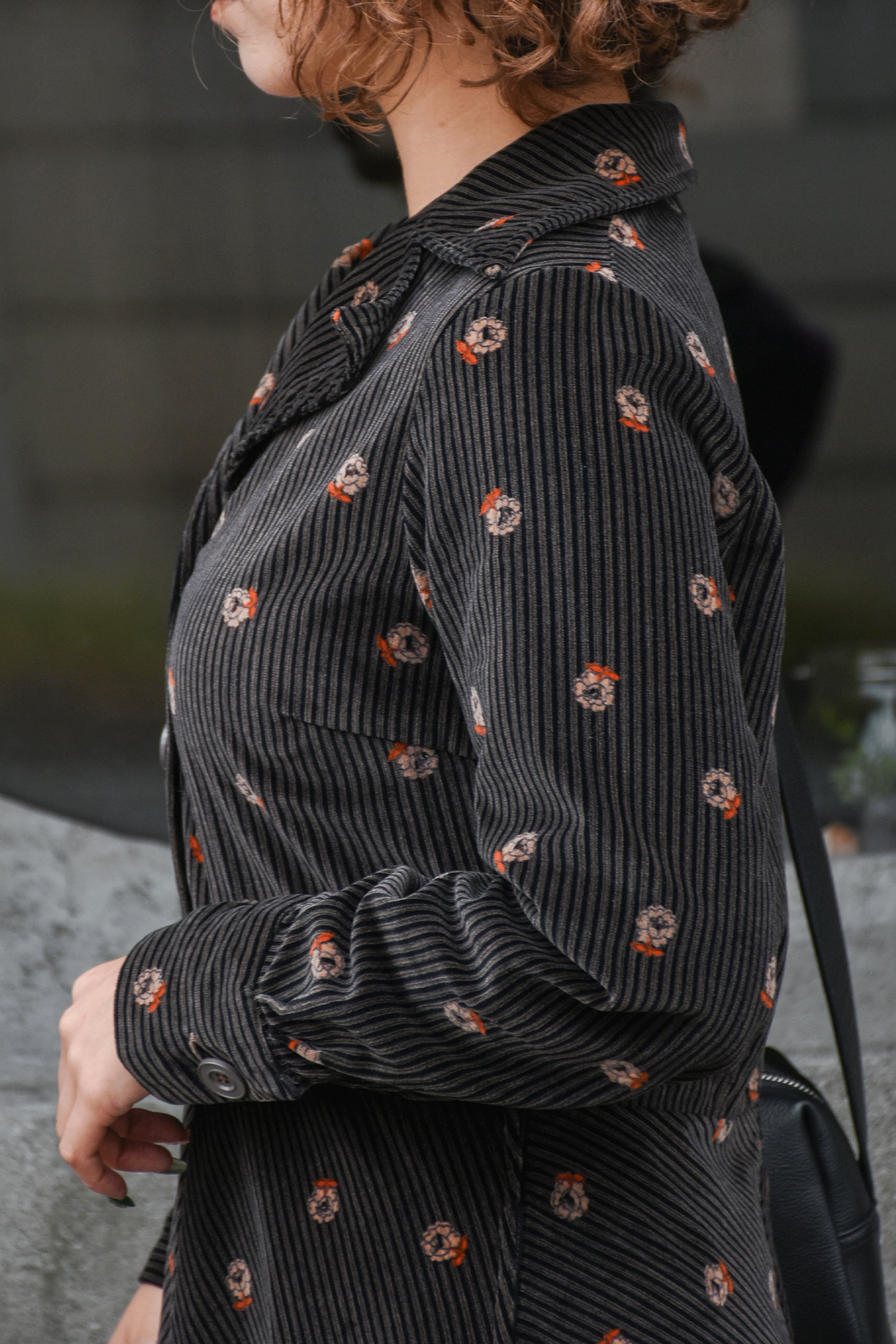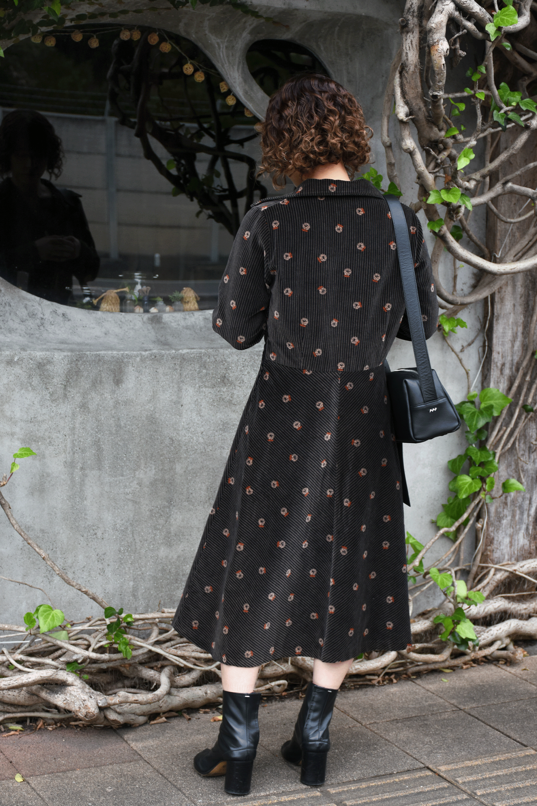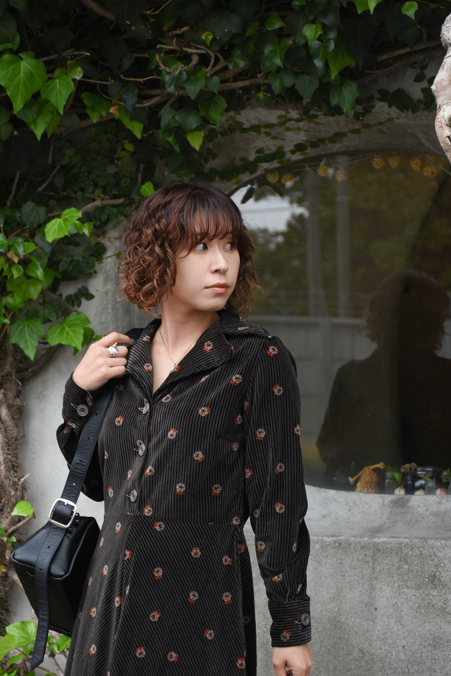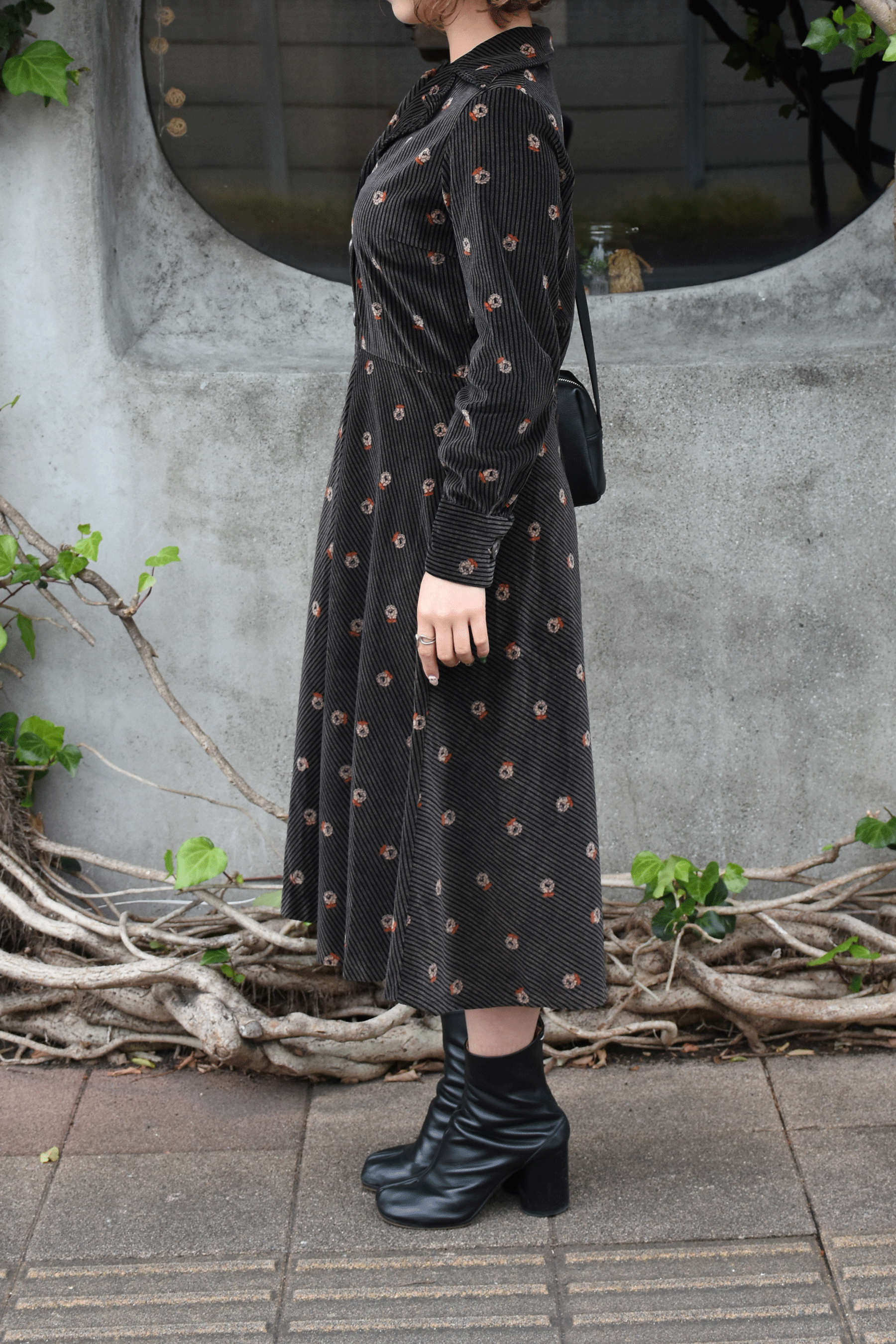 70sフランスのベルベット素材のシックな花柄ワンピース。ノスタルジーな柄、素材、デザイン全て揃っています。今では珍しいECLAIR/エクレア社製ジップ使用。