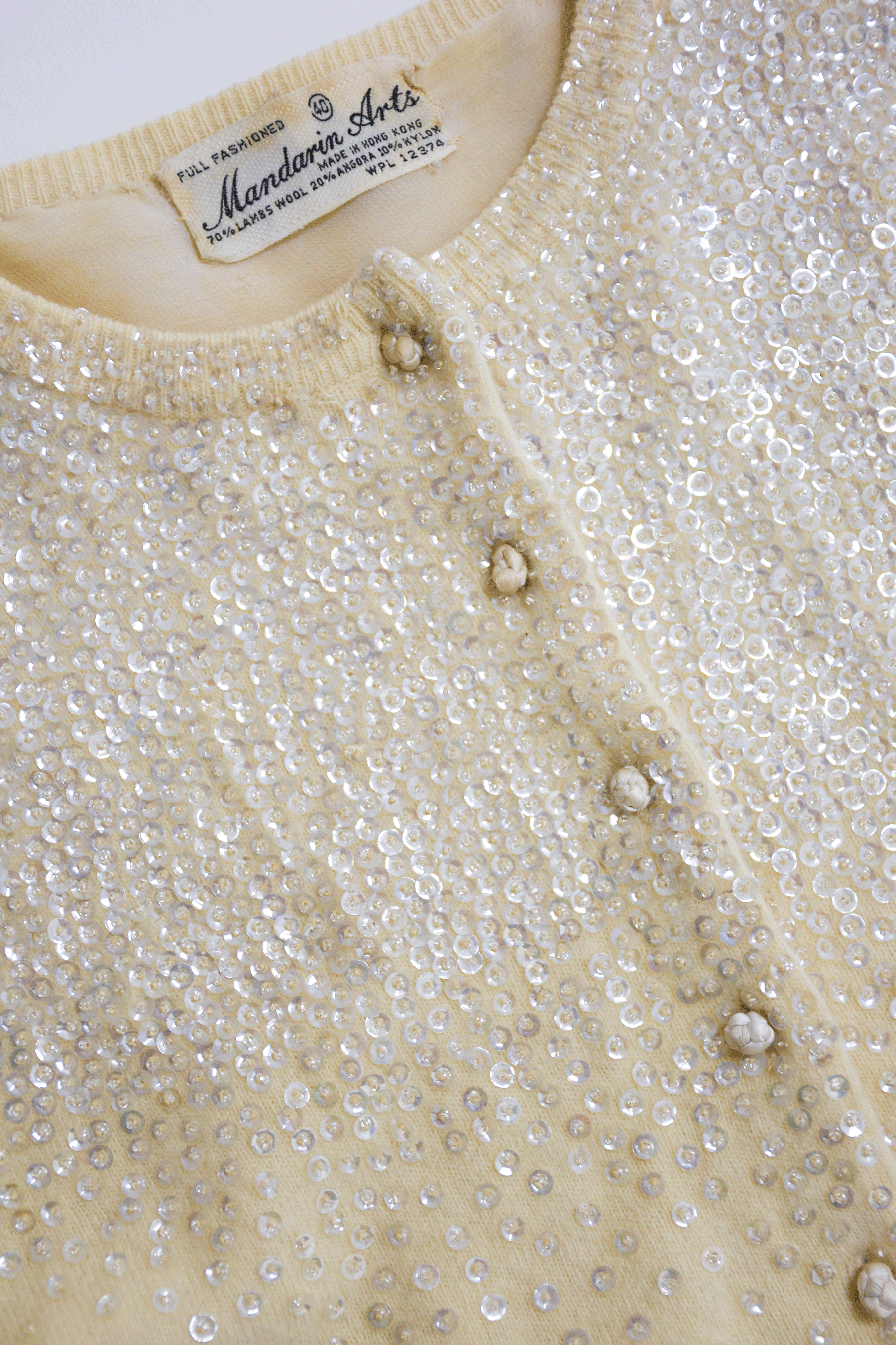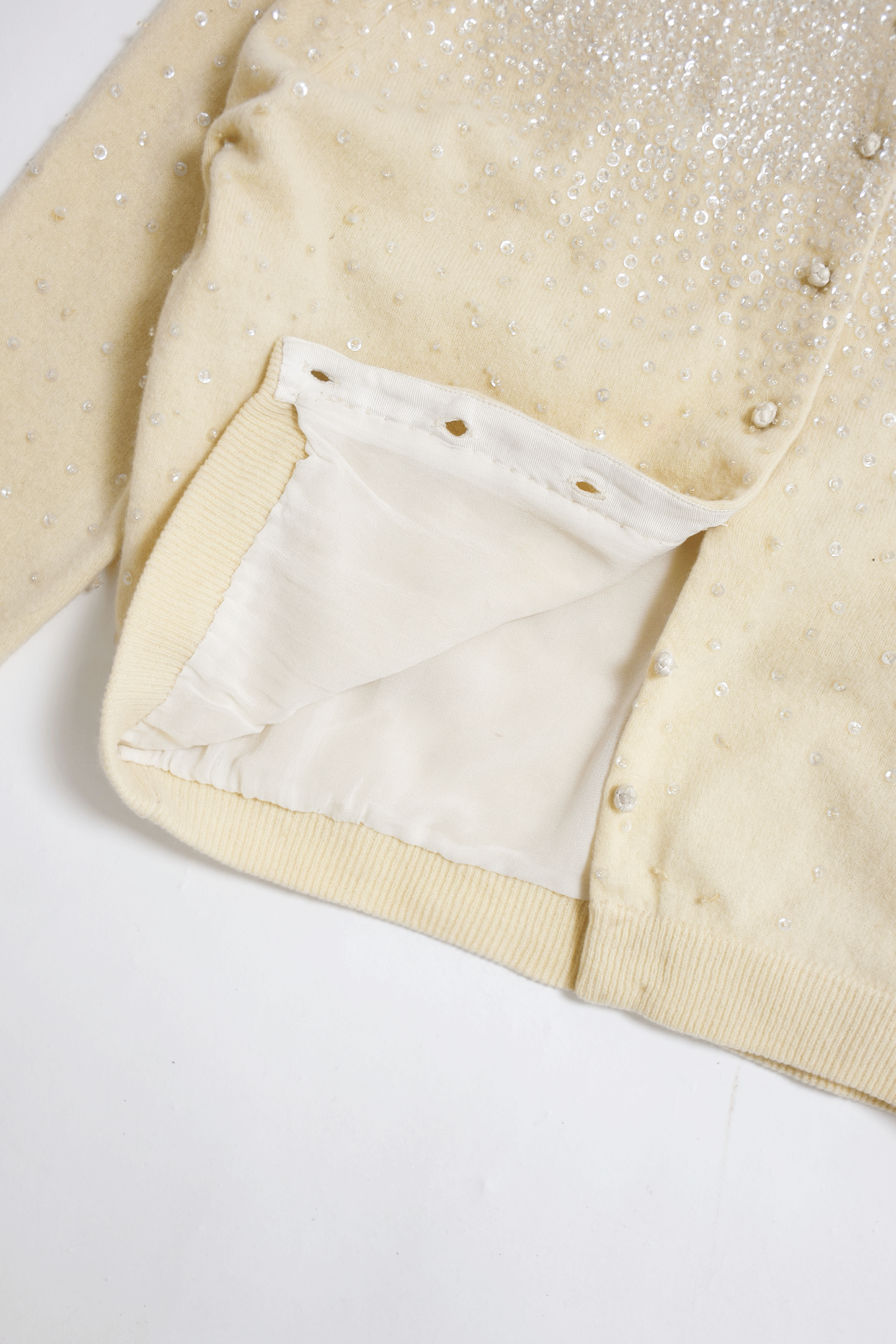 50,60年代の繊細なビーズが煌めくアンティークのカーディガン。 素材はそれぞれアンゴラやウール、コットンなど、デザインとアンティークホワイトのカラーも同様に、当時のナチュラルで奥ゆかしさがとプラスできます。