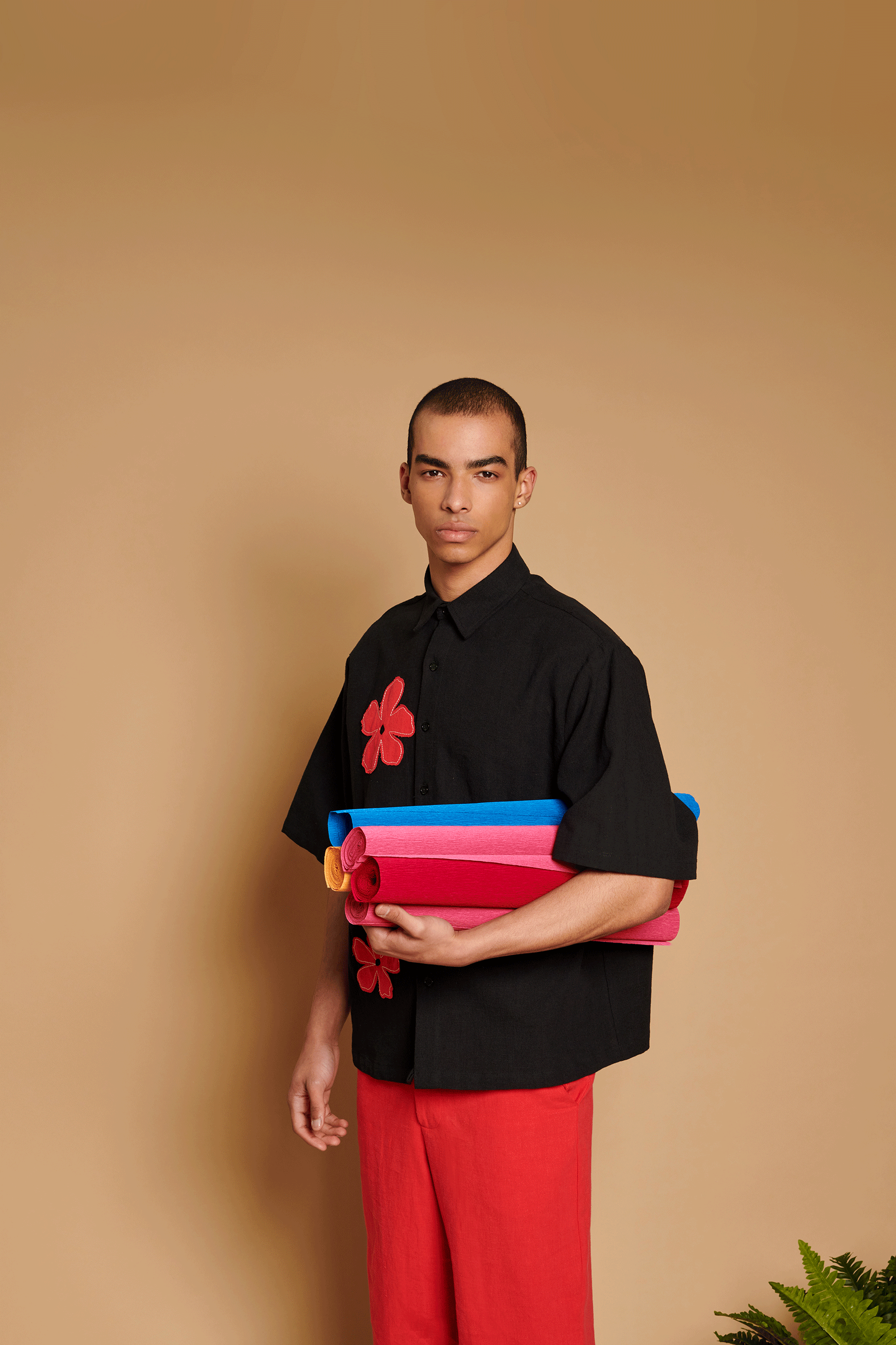 存在感のある鮮やかな花のアップリケが施されたボクシーシャツ。
