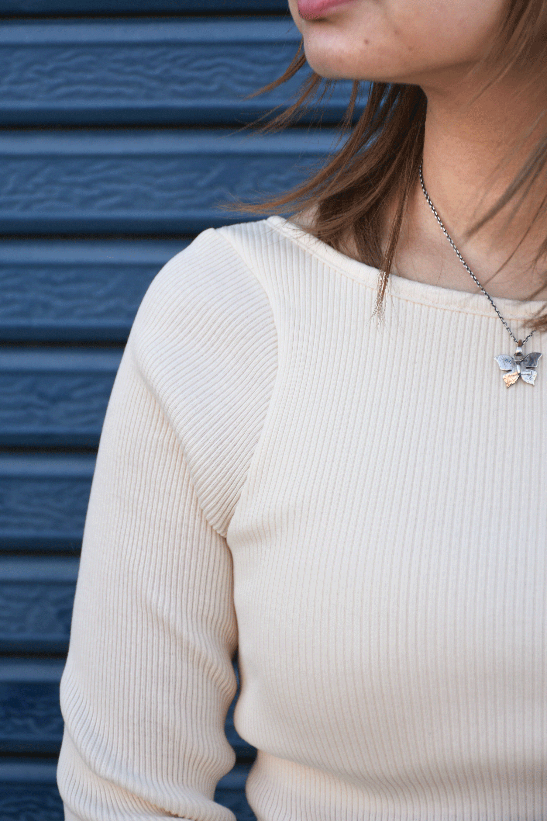 フロントはボートネックで背中の開きが広くとってあり首元がスッキリするデザインです。胴回りはストレスフリーなフィット感、腕周りは袖が長いので程よいゆったり感。 胸のホールド力が抜群なのに、生地の気持ちよさとブラなしの1枚で完成する緩さがあります。