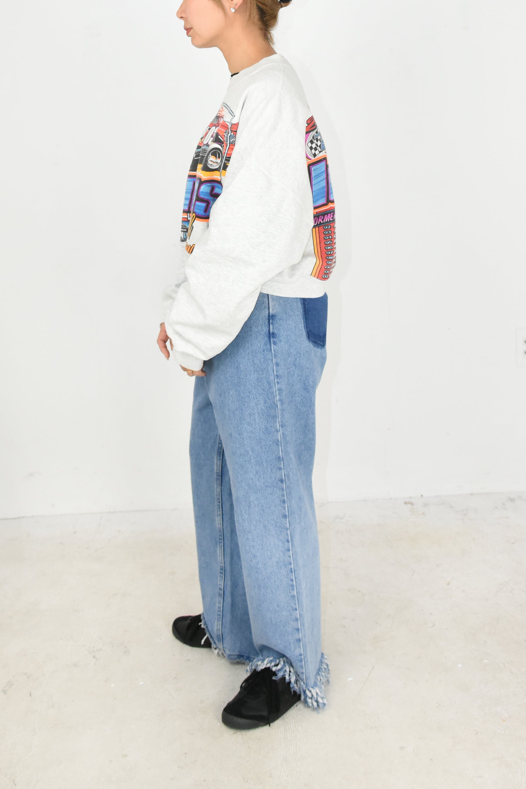 2本のUsedのデニムを、トップボタンから股下までをカットしつなぎ合わせてフロントジップ仕様になっています。裾にはアシンメトリーにダメージ加工とフリンジ加工が入っています。サイズとカラーが一致すると、履くだけで間違いない雰囲気が出ます。