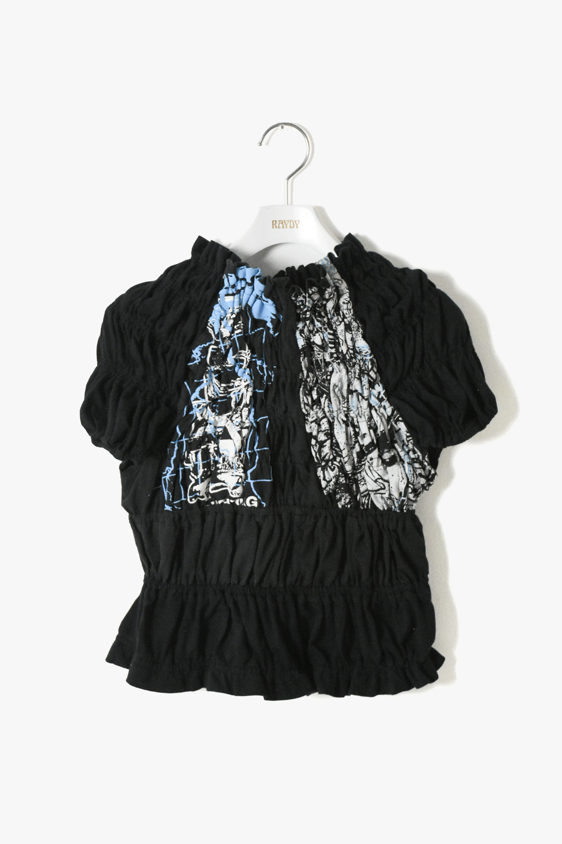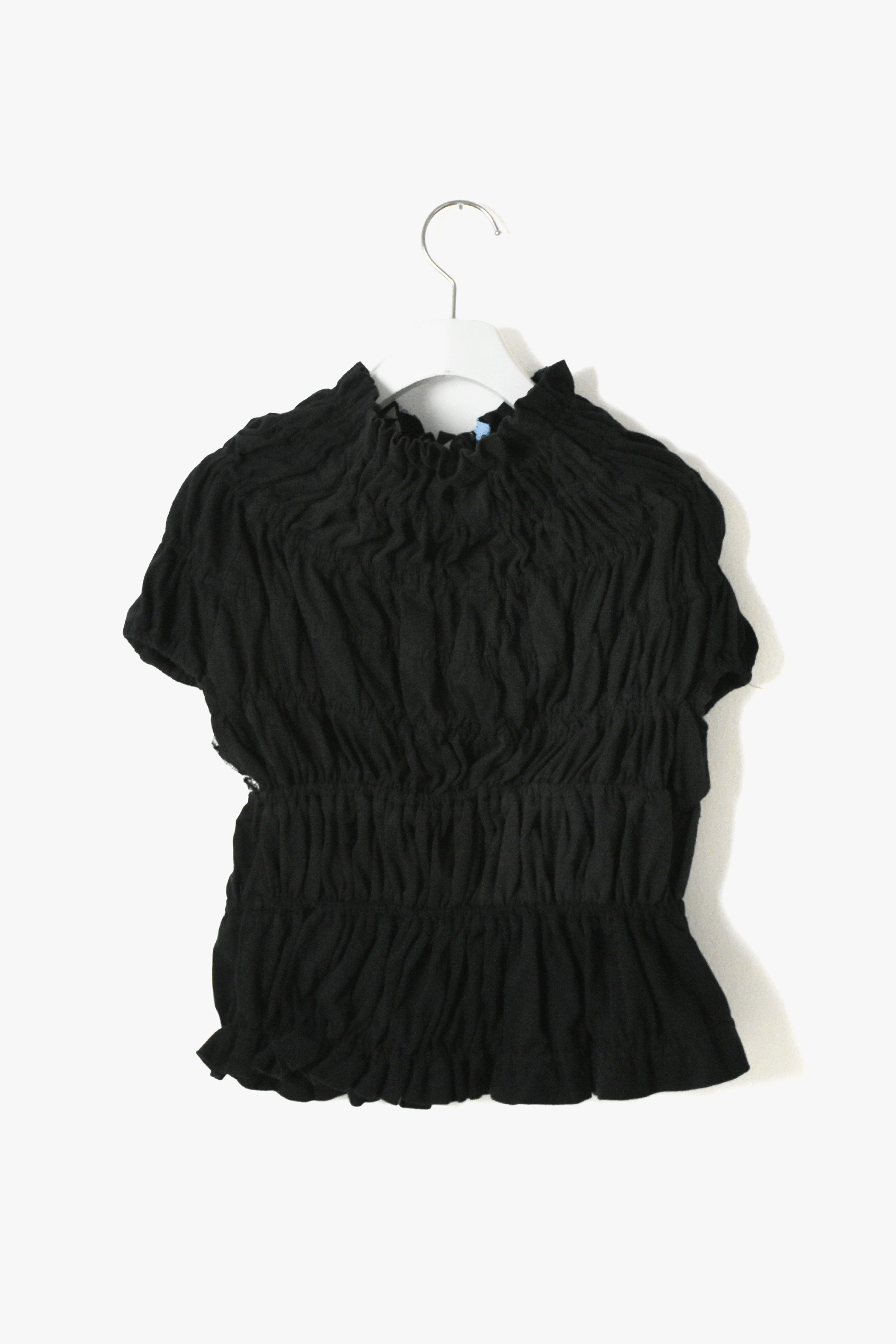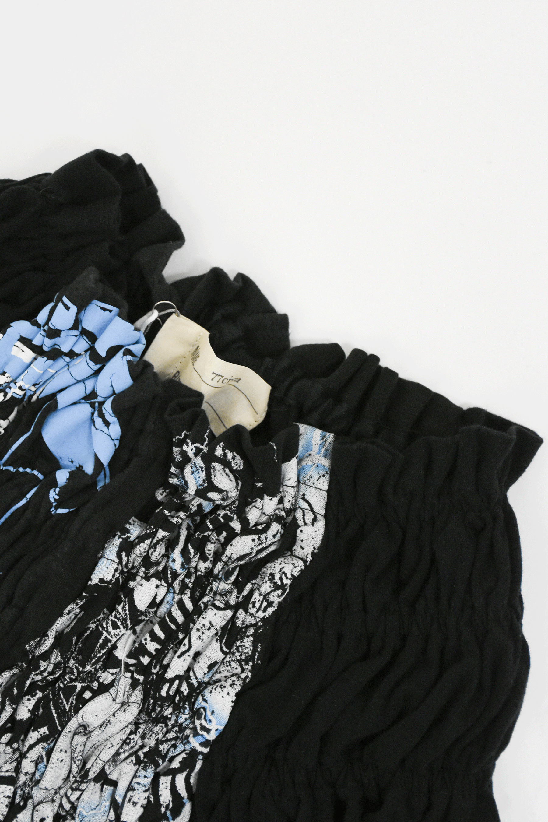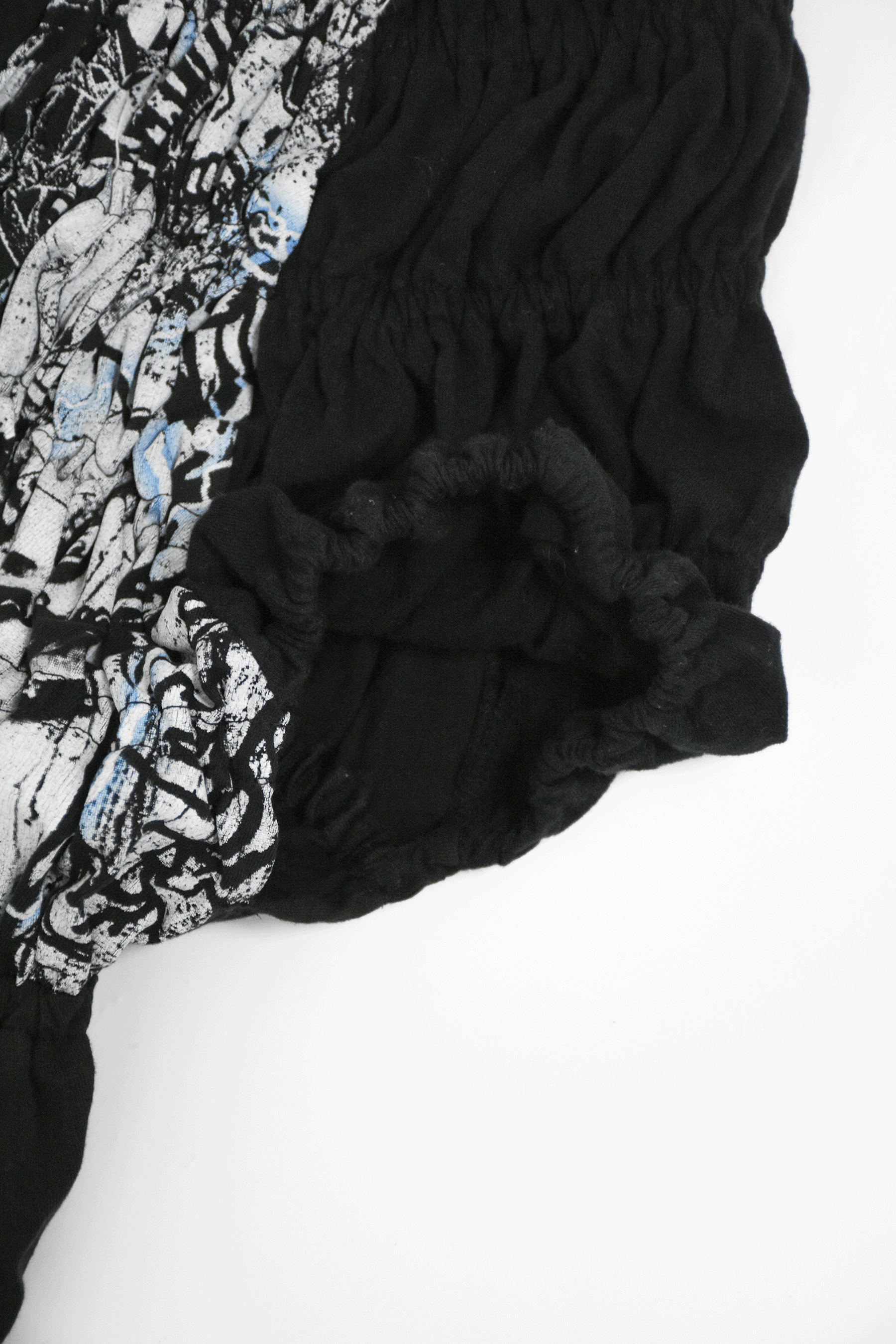 2着を組み合わせ、3段切り返し縫製し、全体にシャーリングを入れ前後どちらでも着用可能なデザイン。袖、裾は製品生地が使用されています。