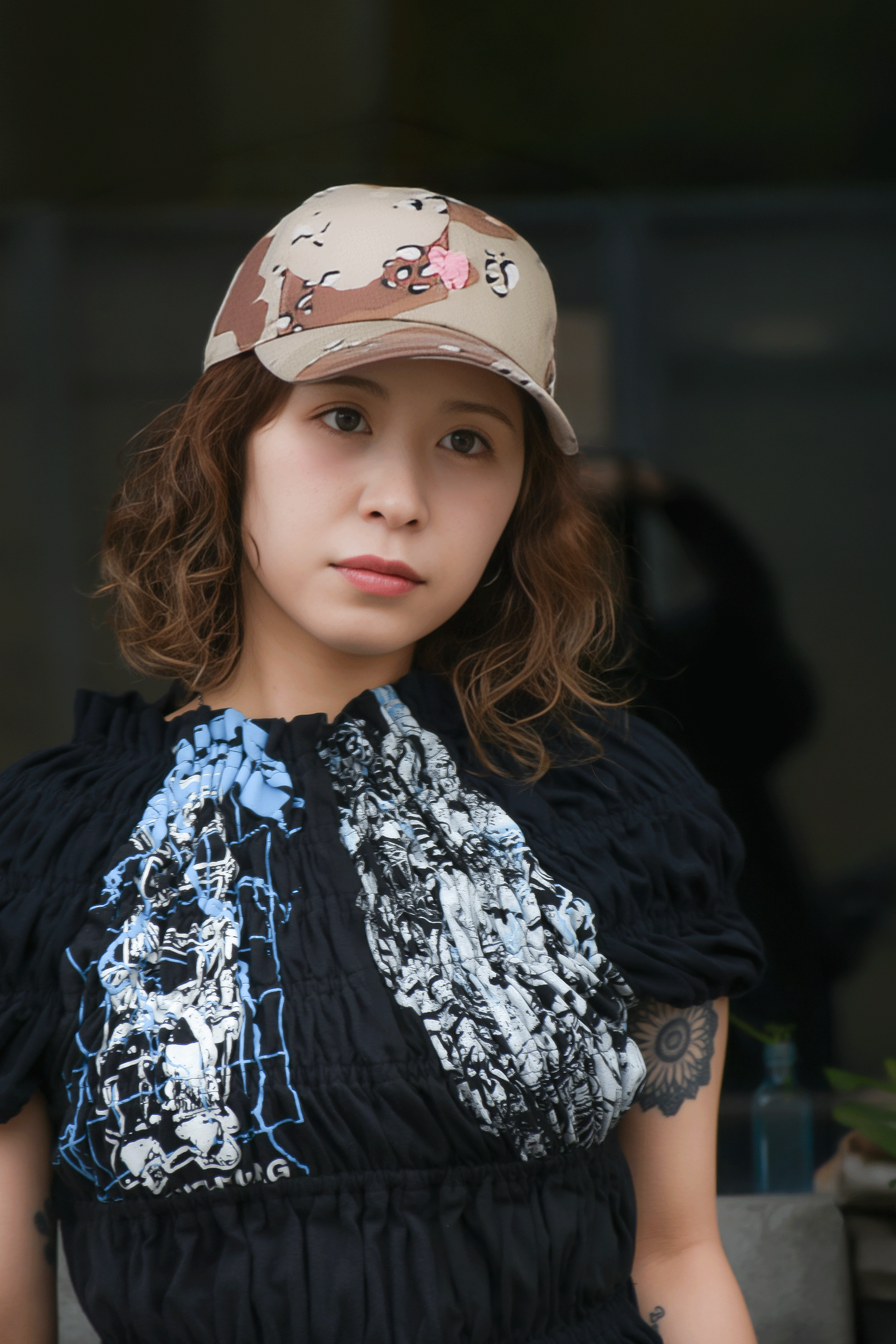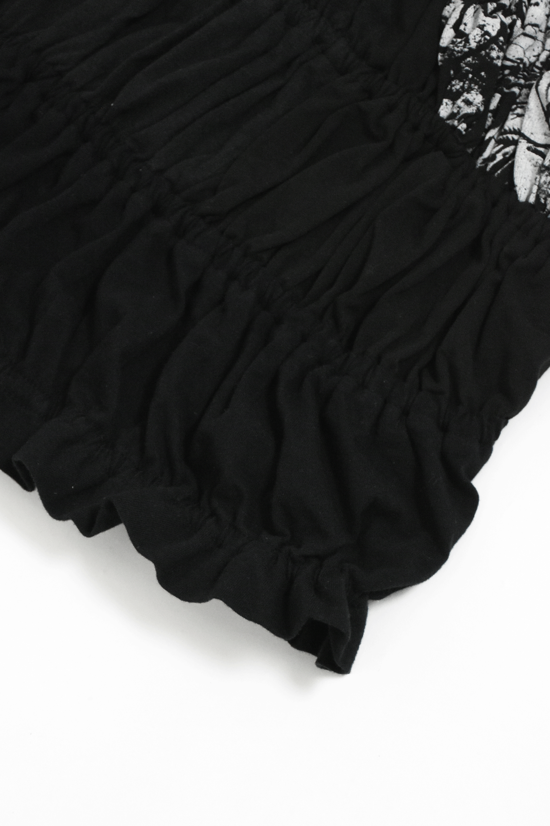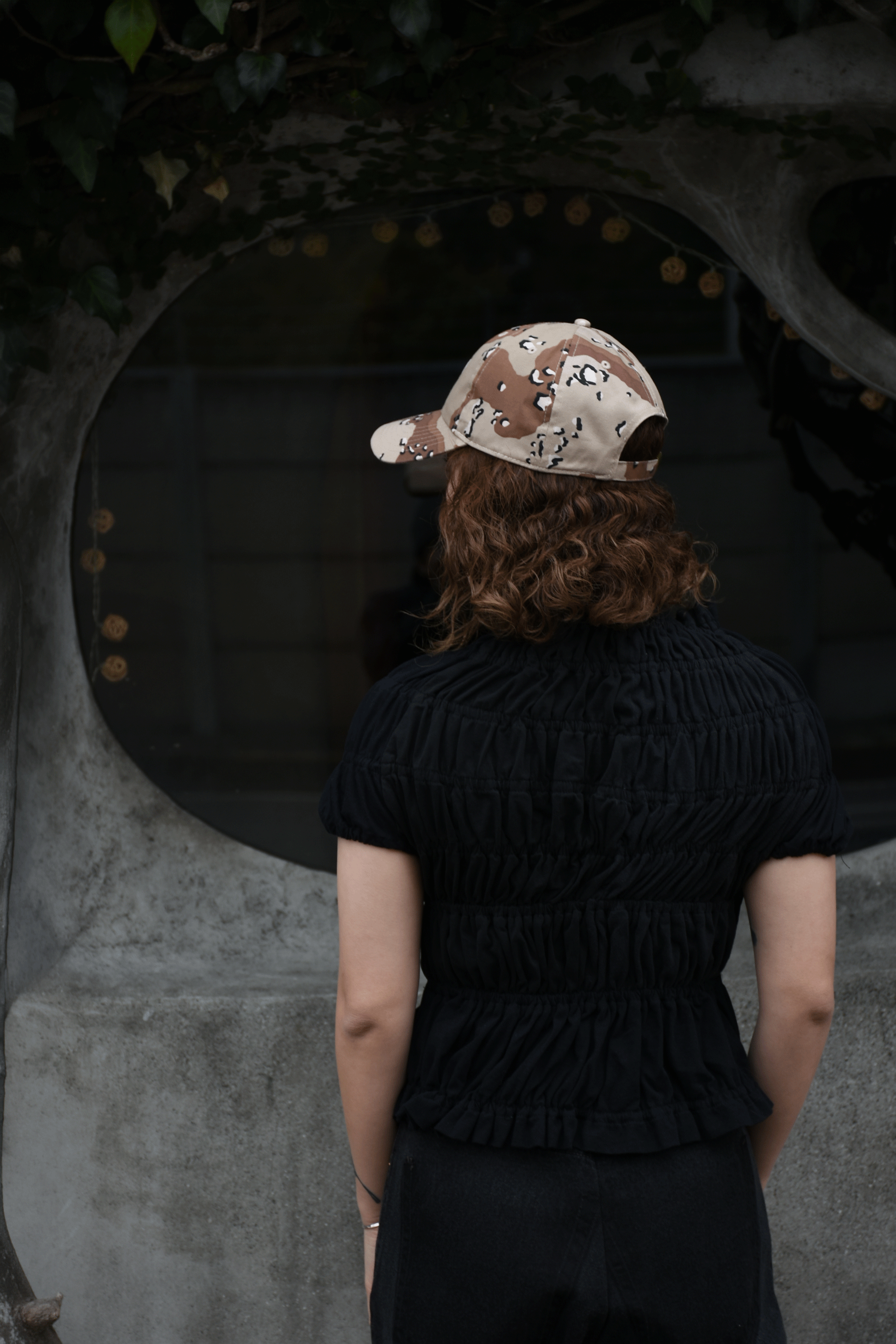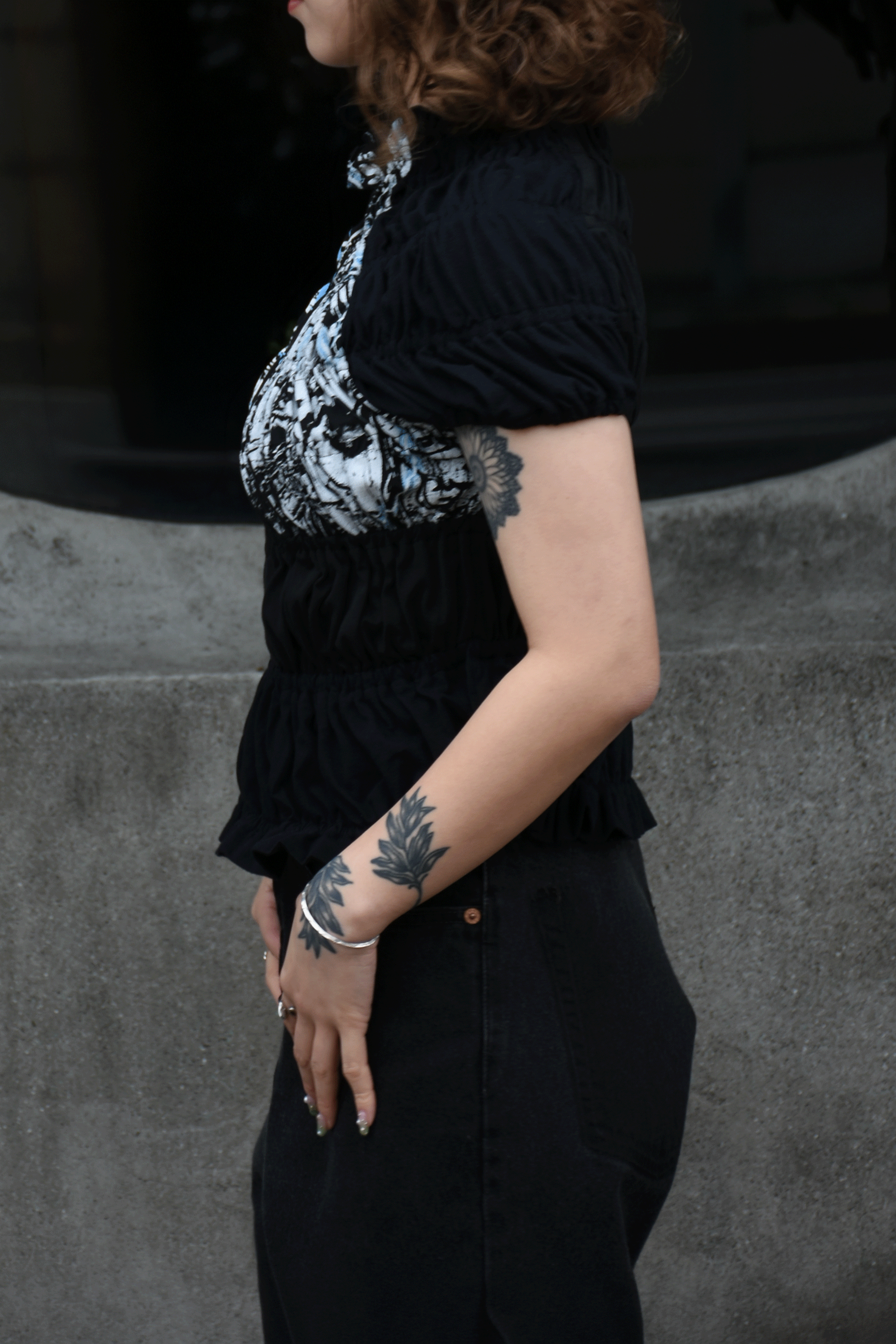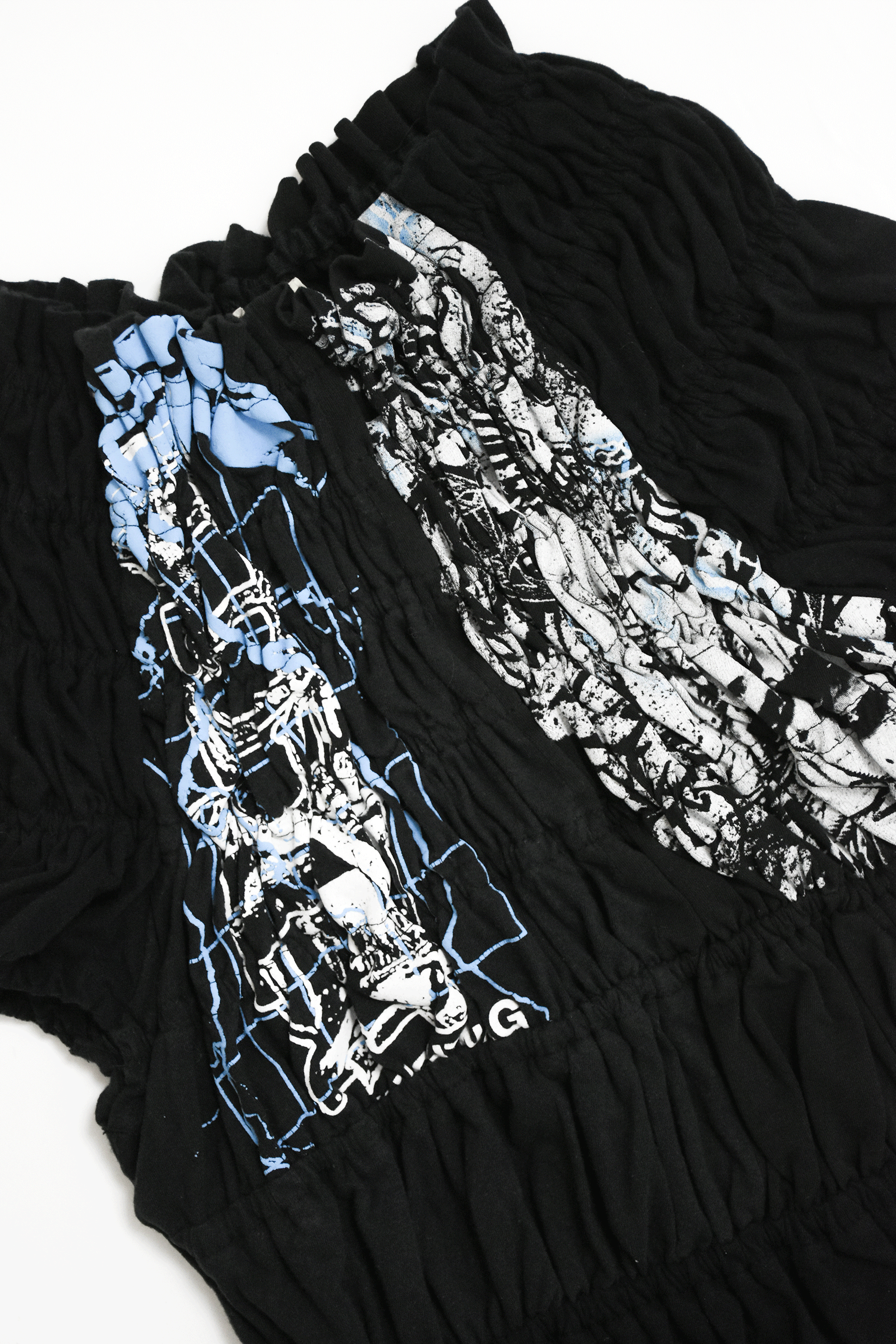 2着を組み合わせ、3段切り返し縫製し、全体にシャーリングを入れ前後どちらでも着用可能なデザイン。袖、裾は製品生地が使用されています。