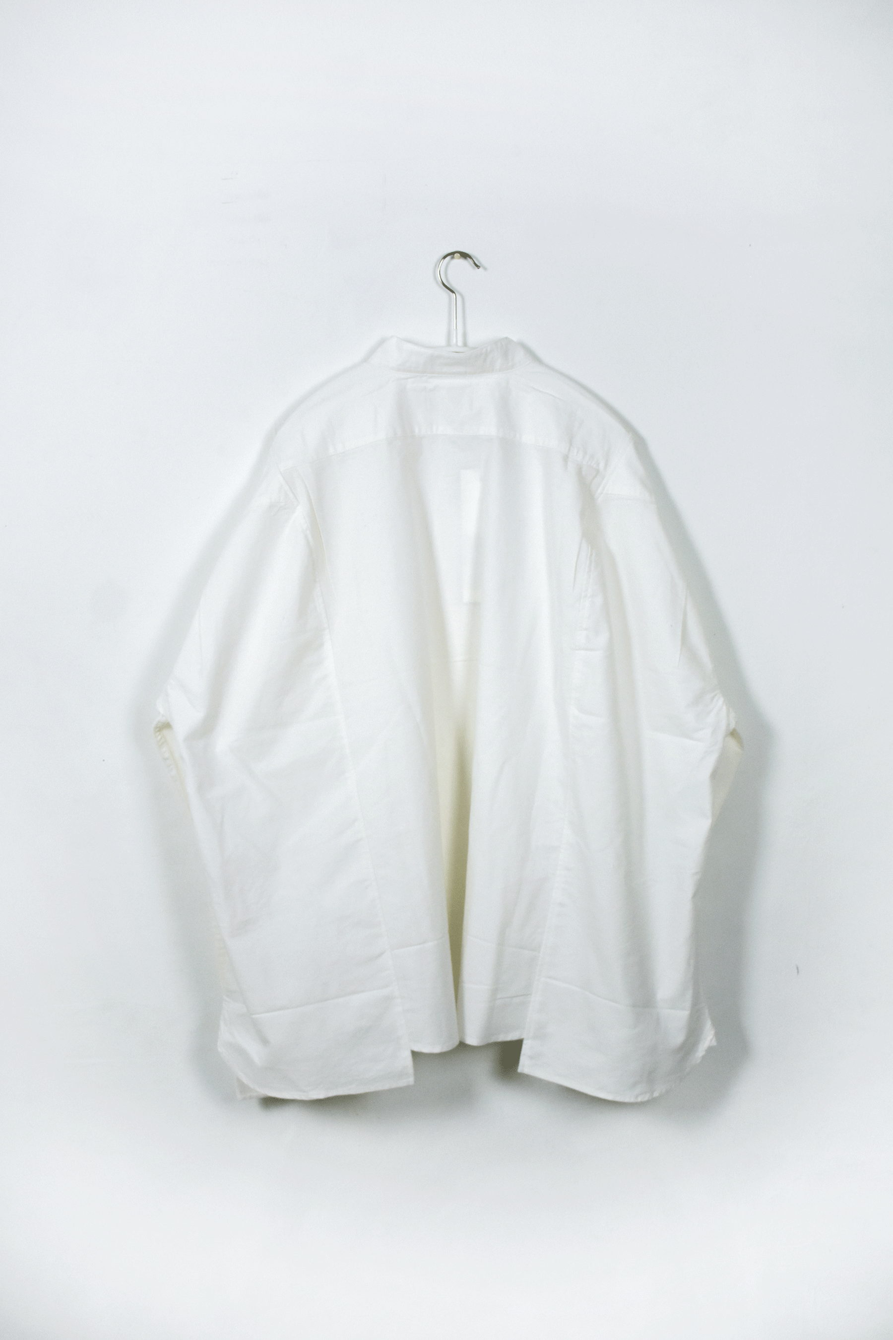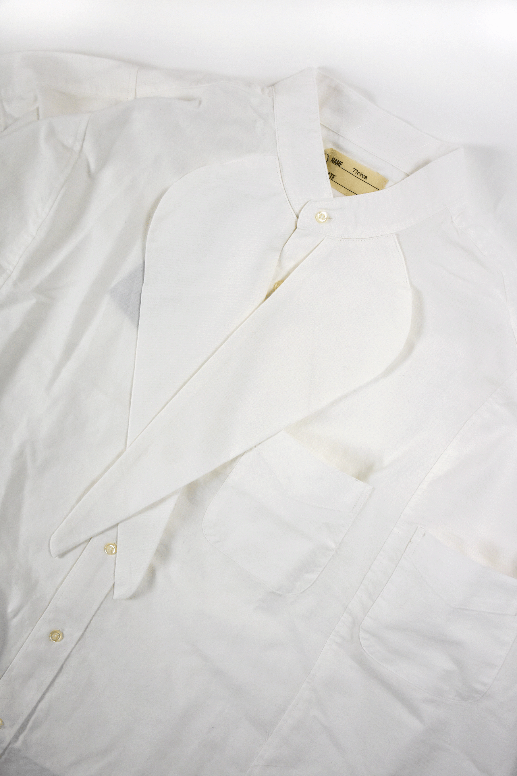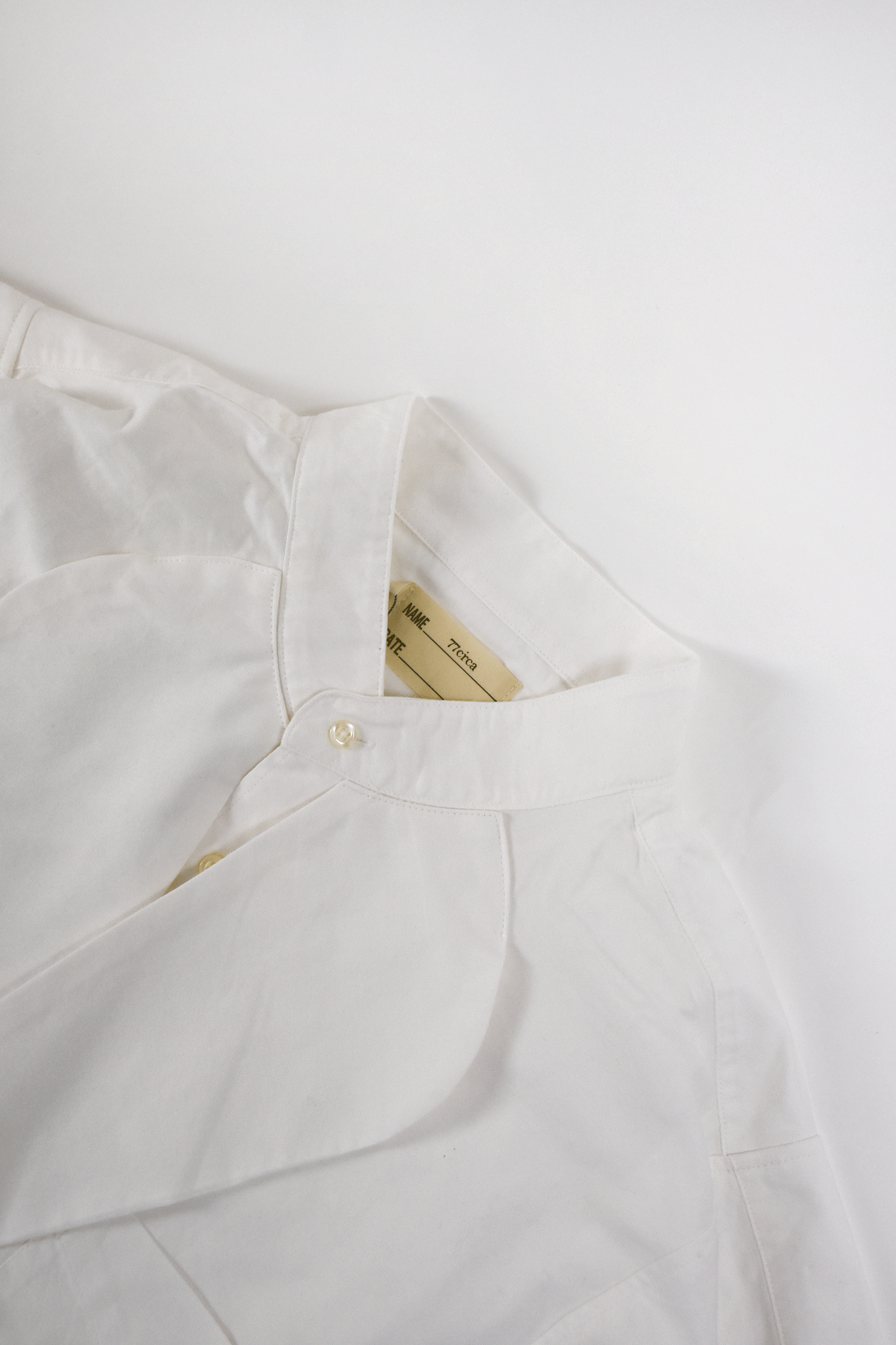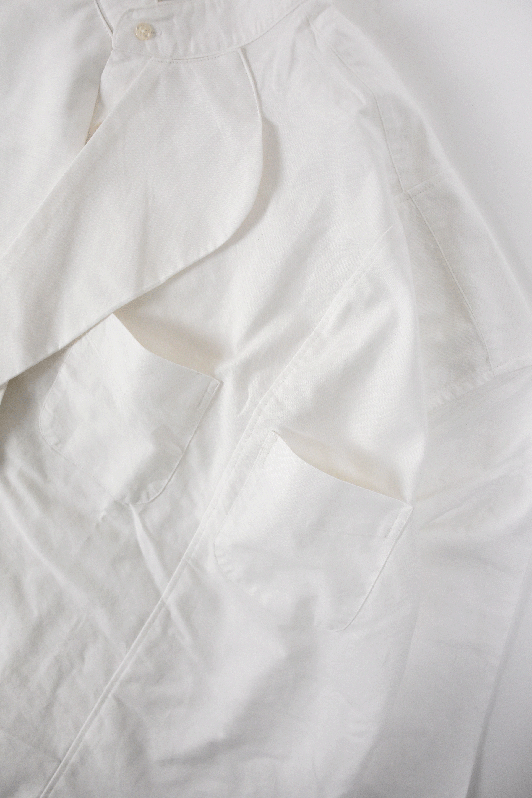 身頃中央外側が裁断され別BODYを繋ぎ合わせてつくられたワイドシルエットになっています。元の襟は取り外しスタンドカラーに再構築されています。
