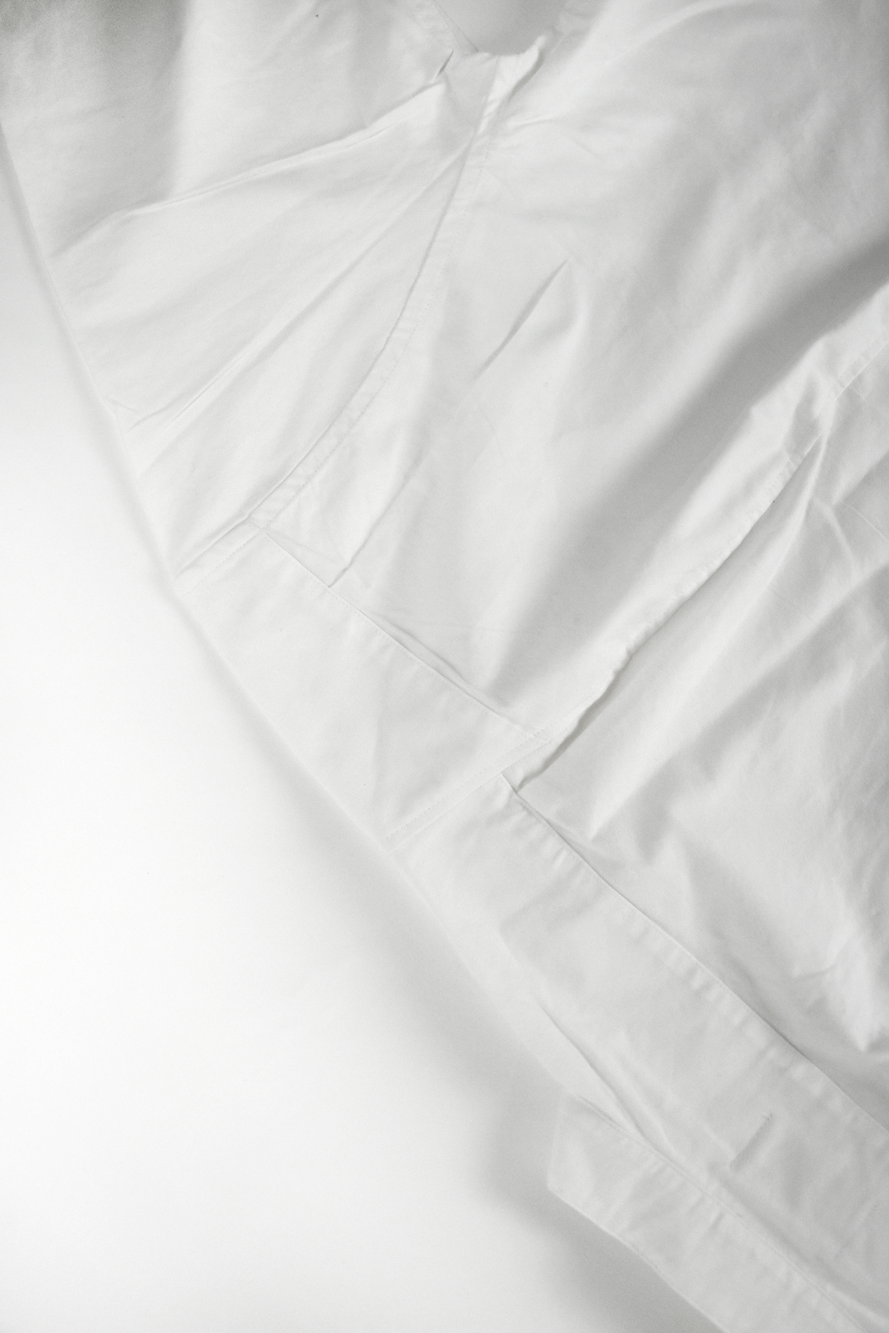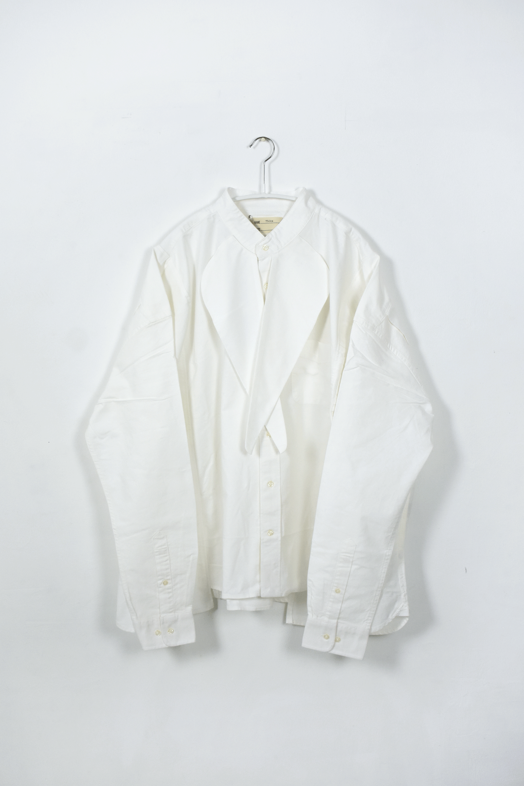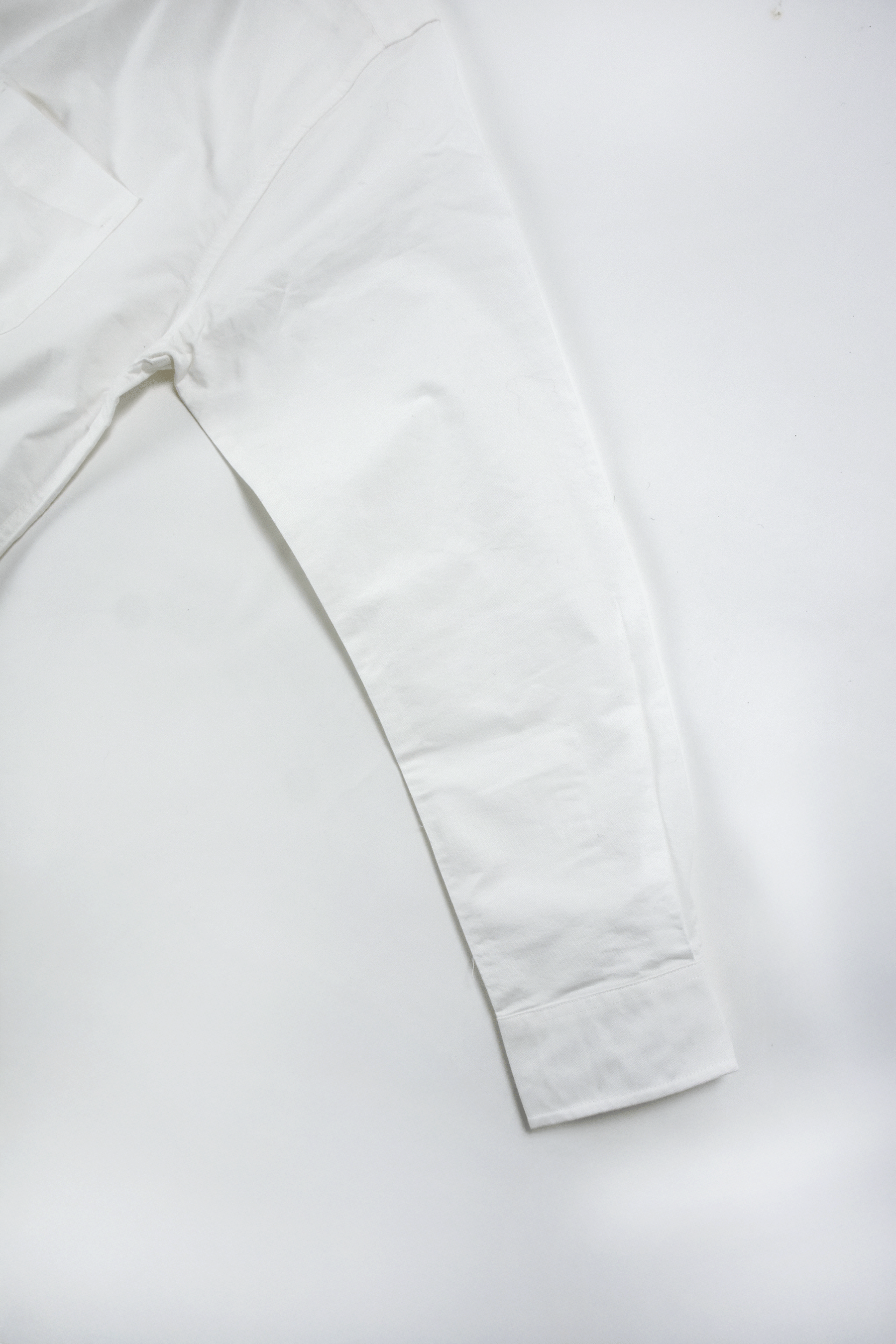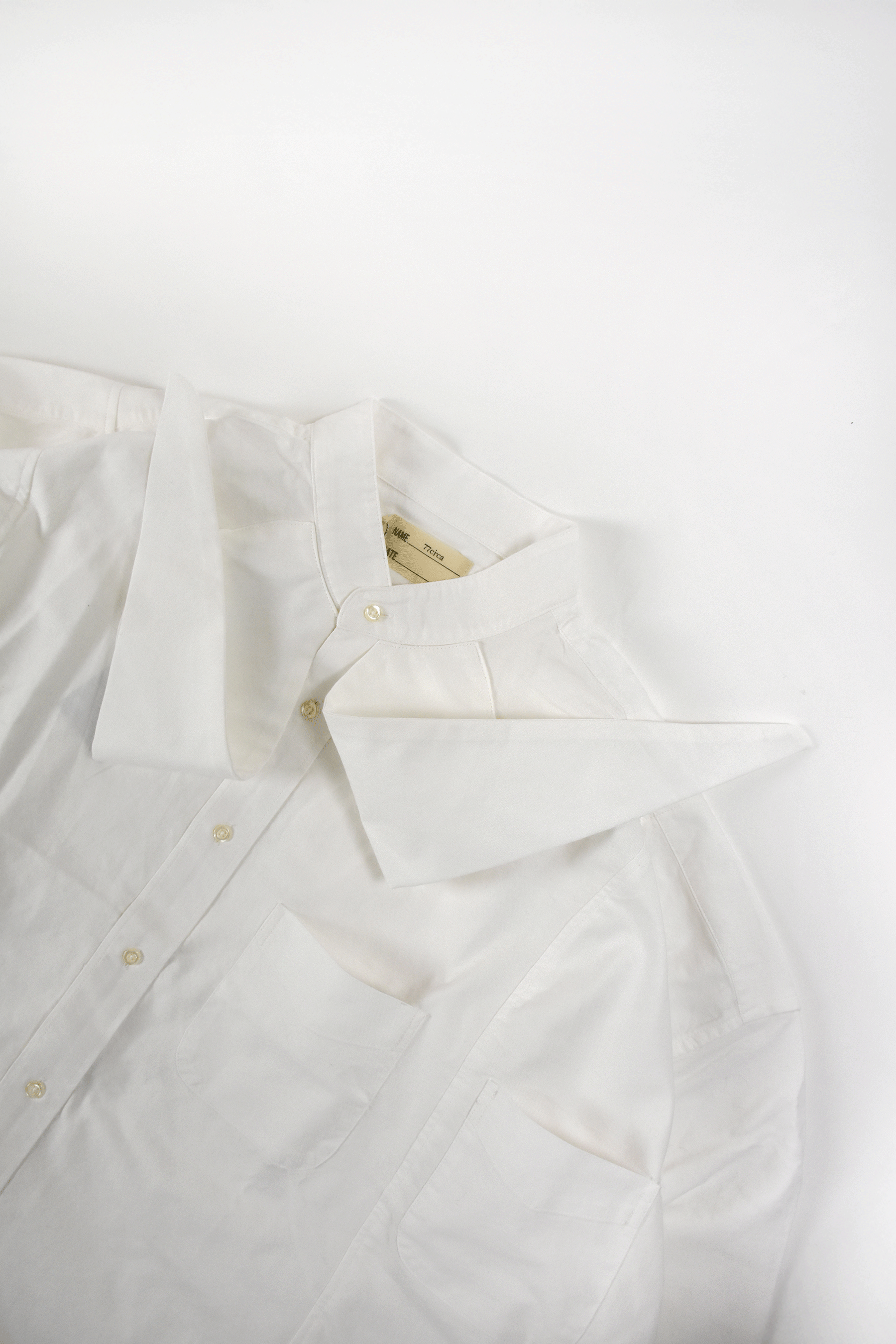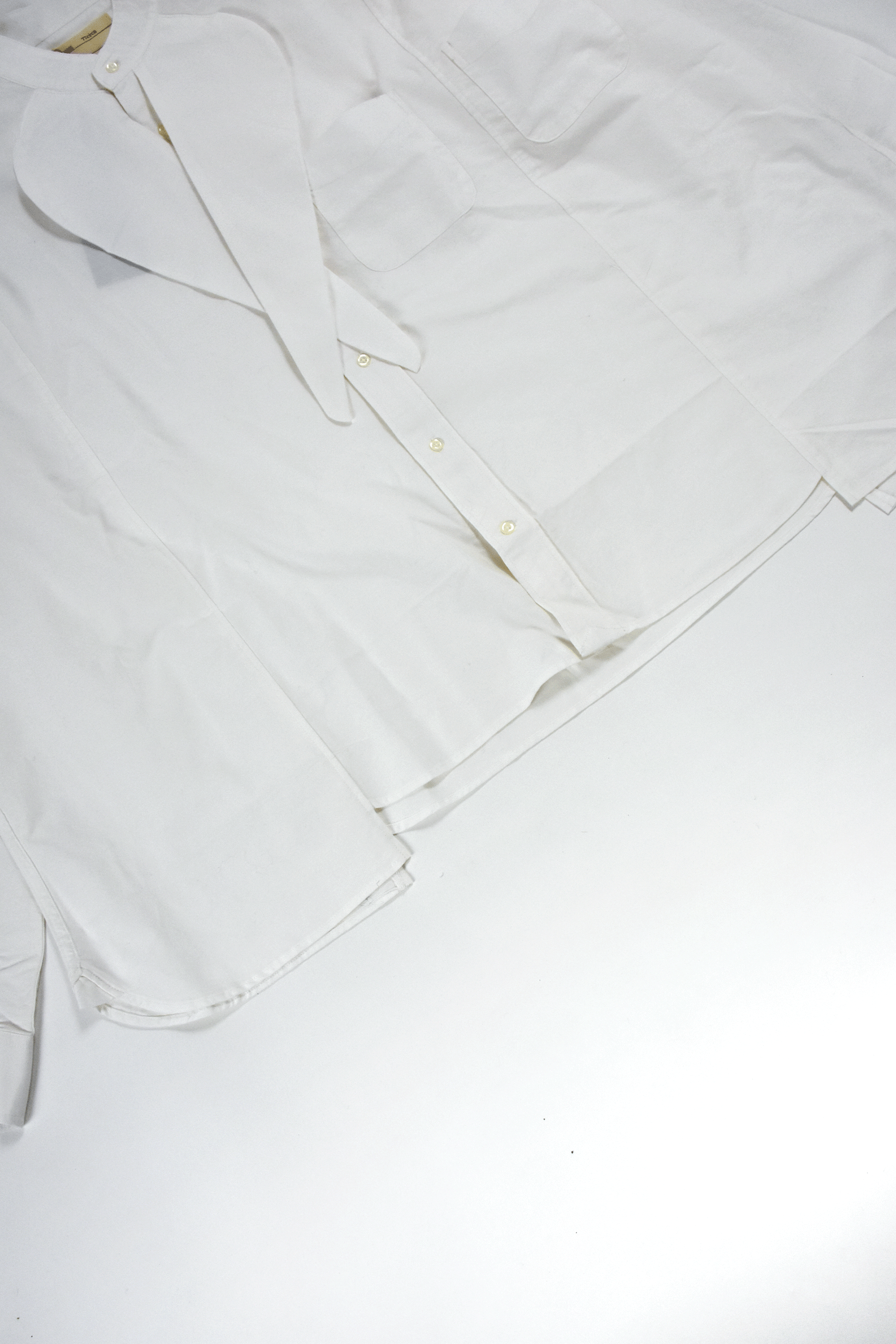 身頃中央外側が裁断され別BODYを繋ぎ合わせてつくられたワイドシルエットになっています。元の襟は取り外しスタンドカラーに再構築されています。