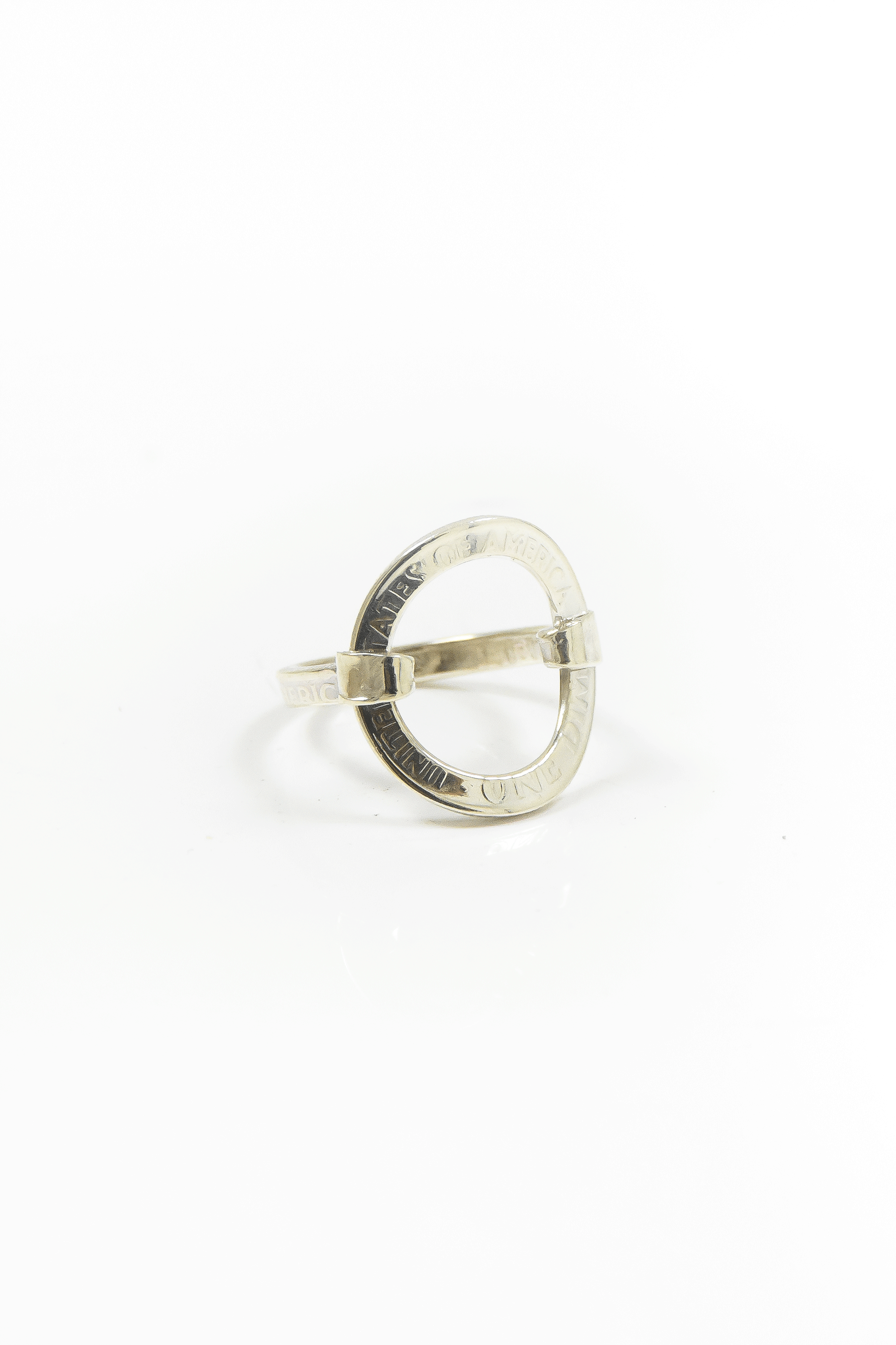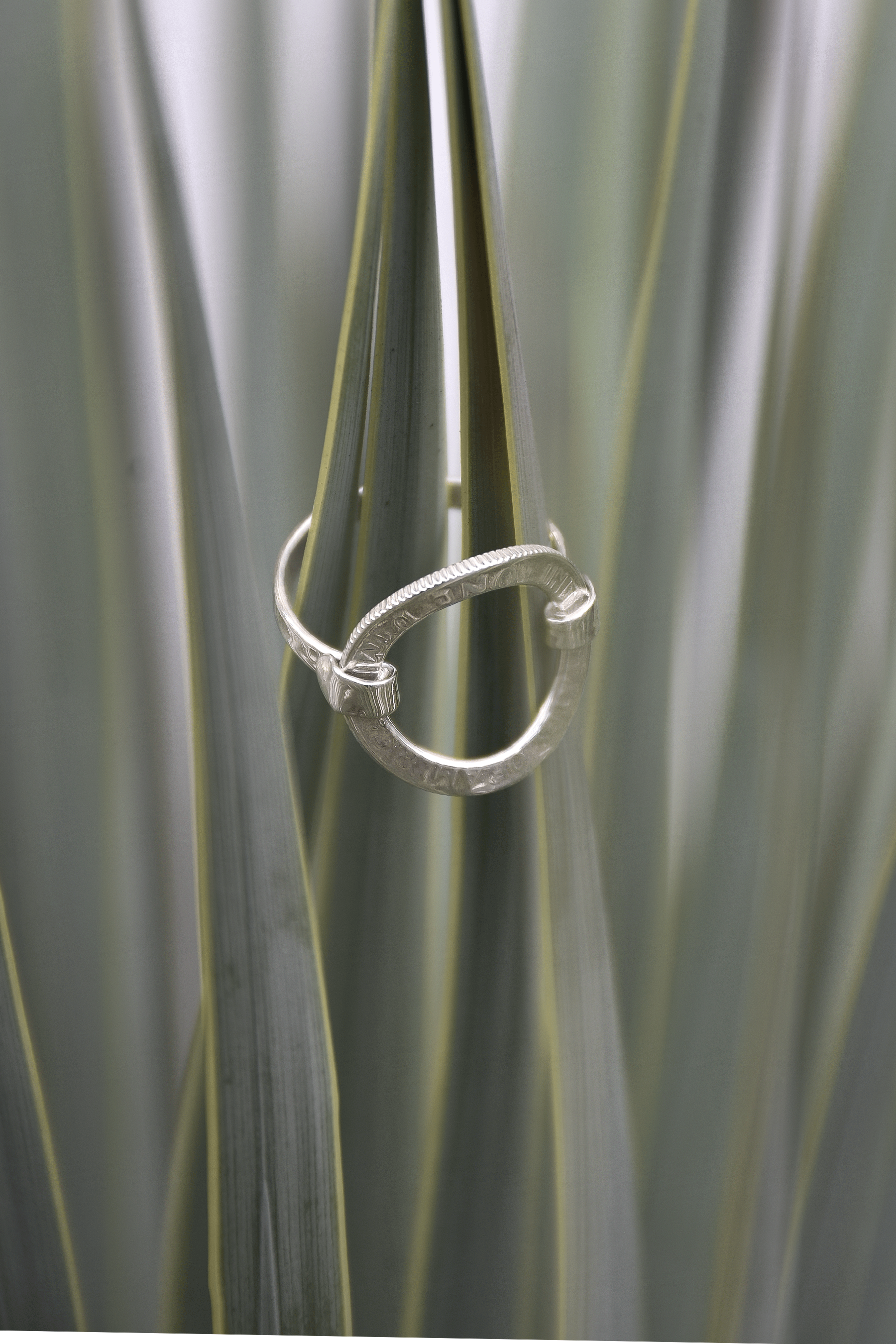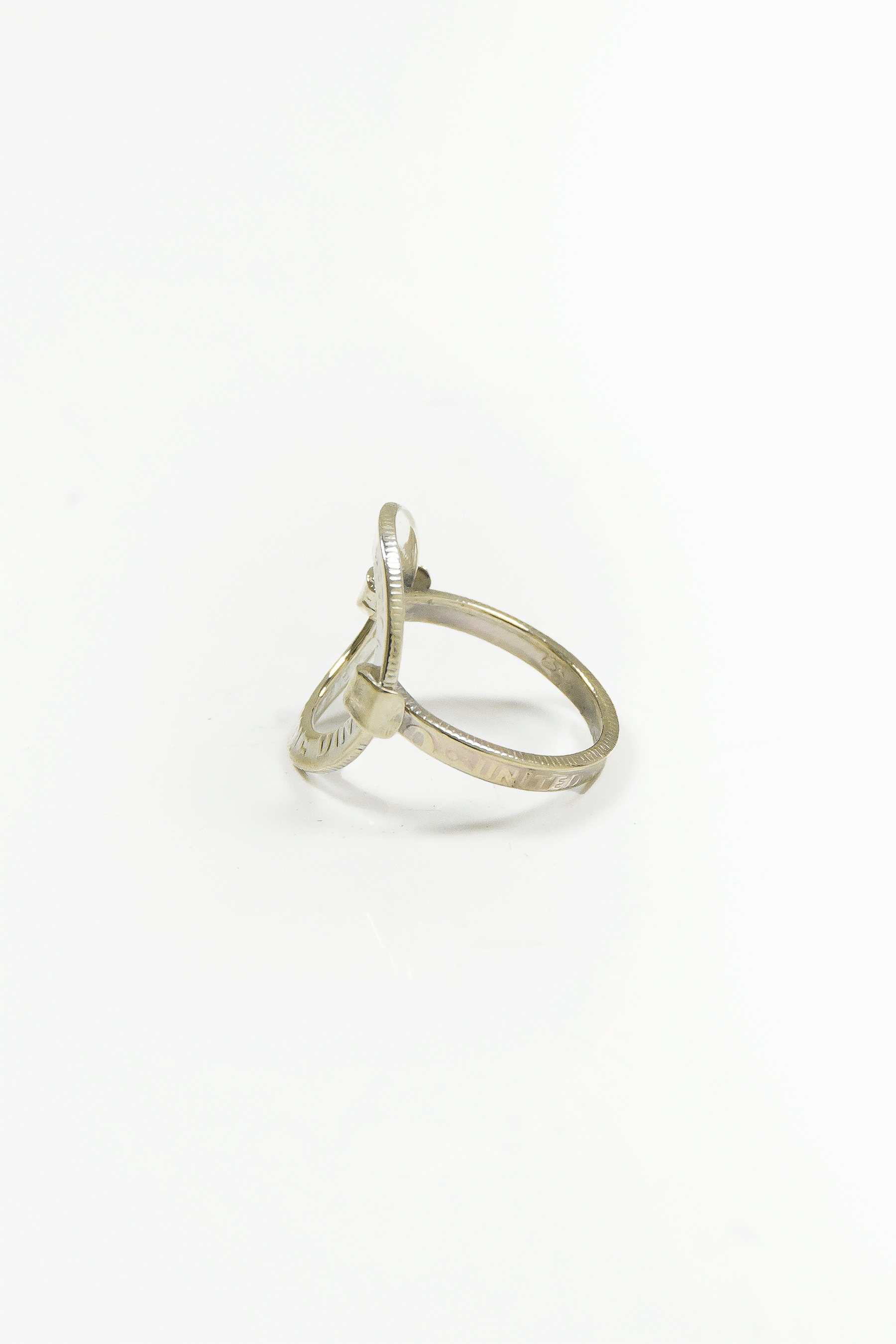 ヴィンテージコインの真ん中がくりかえされ周りの文字が残されたデザインのリング