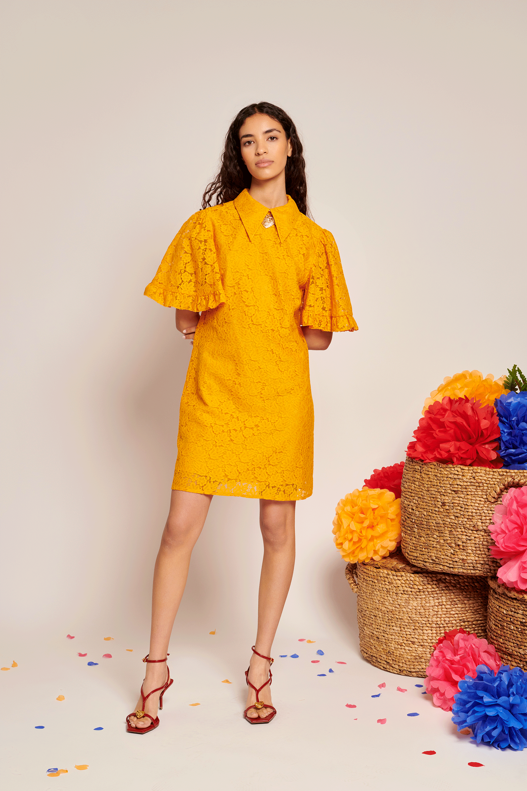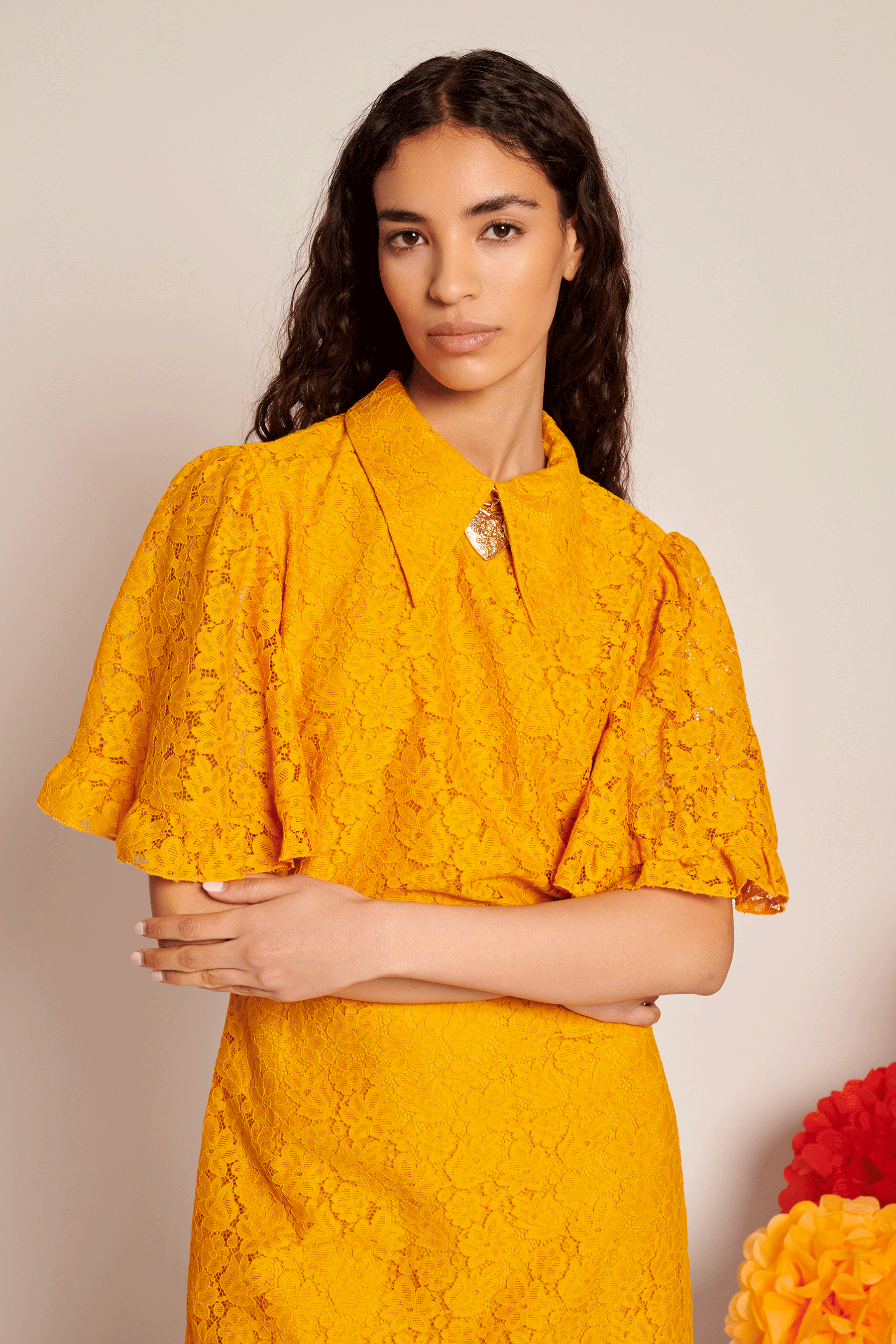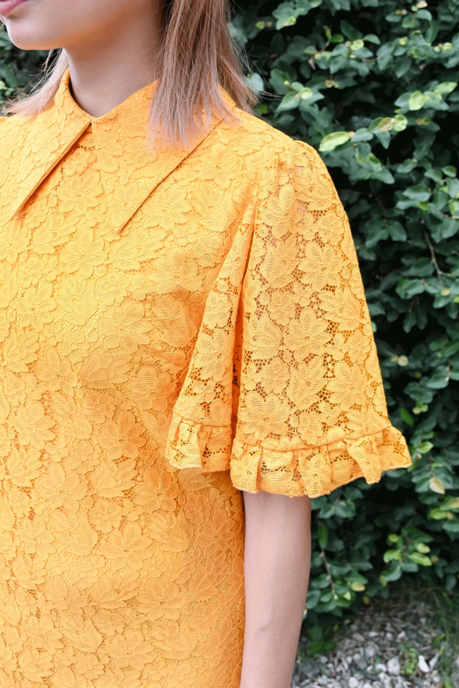 ふんわり広がるショートスリーブにはレースフリルがあしらわれ、透け感があって魅力的です。身体部分には裏地が施されていて、広がらずすっきりとしたシルエットで着れます。