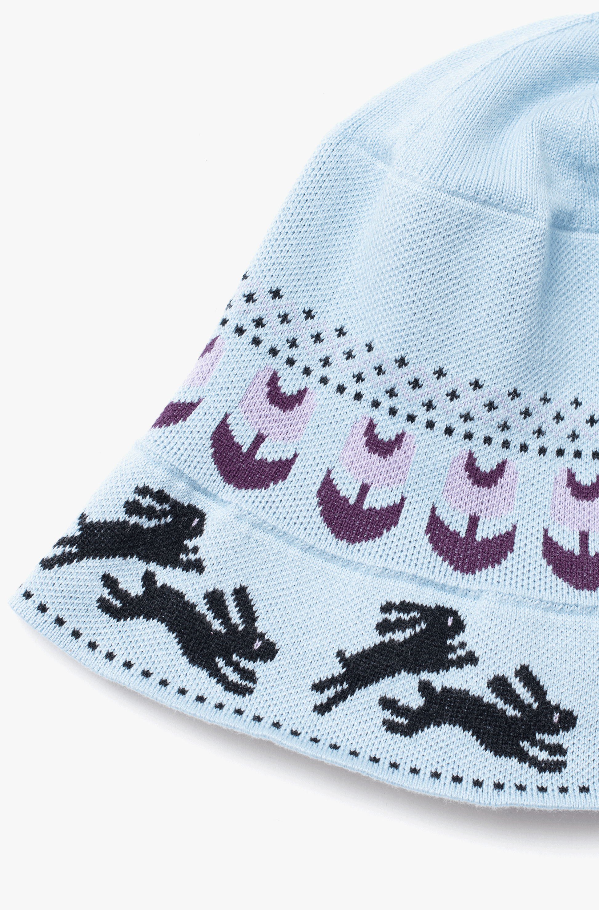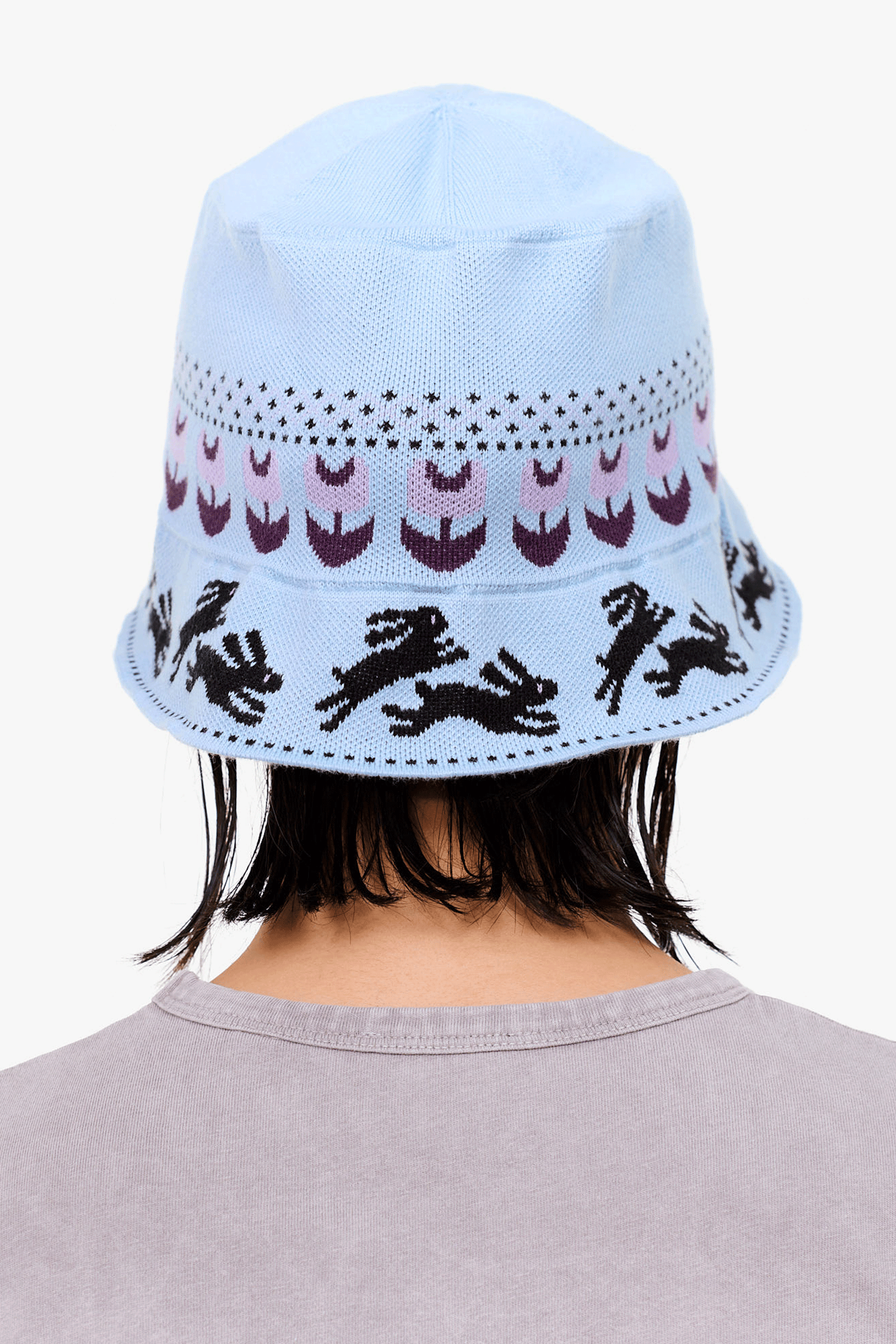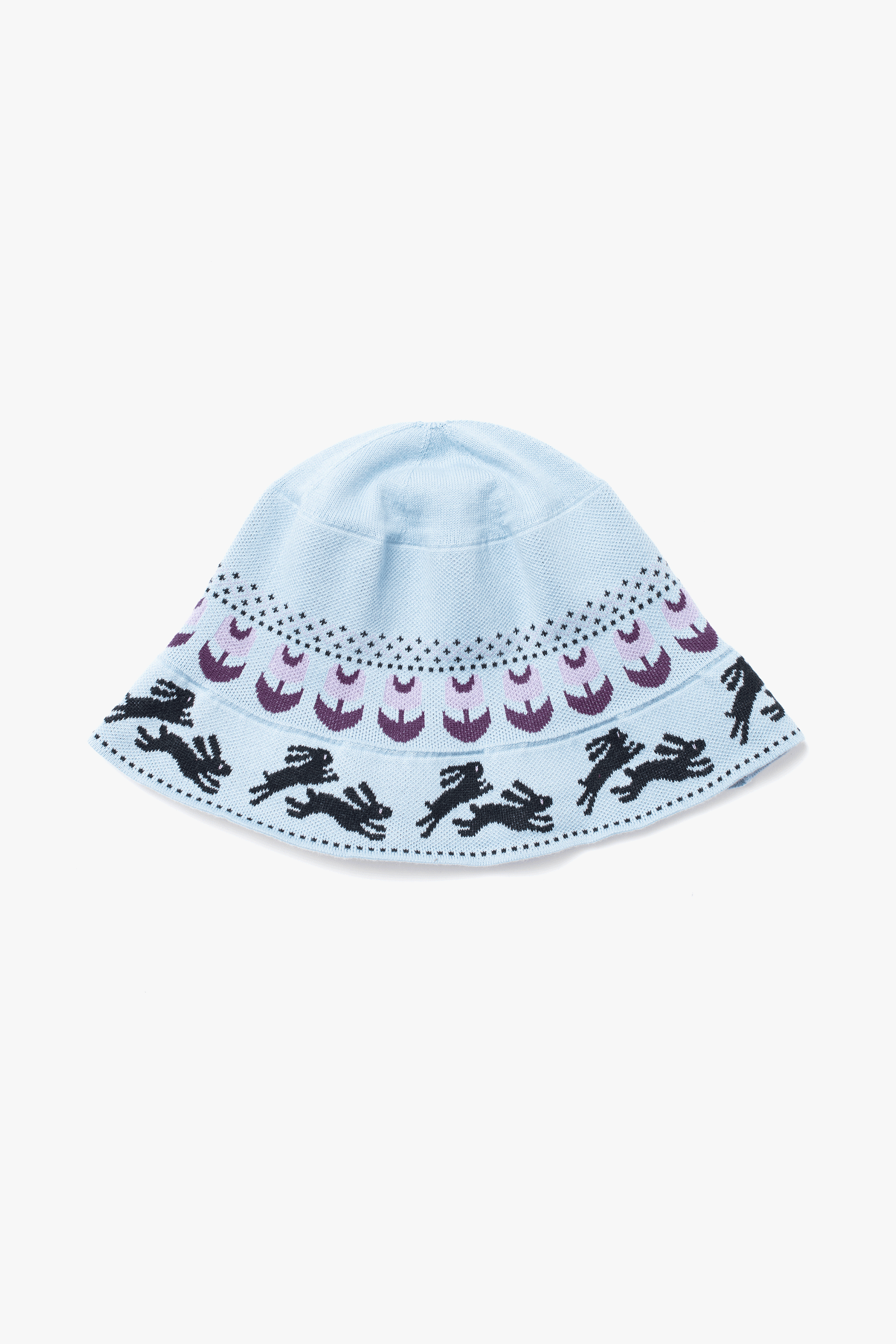 頭の周囲をぐるっと花畑を駆けるように配置されたアイコニックなウサギのデザインが可愛いです。
