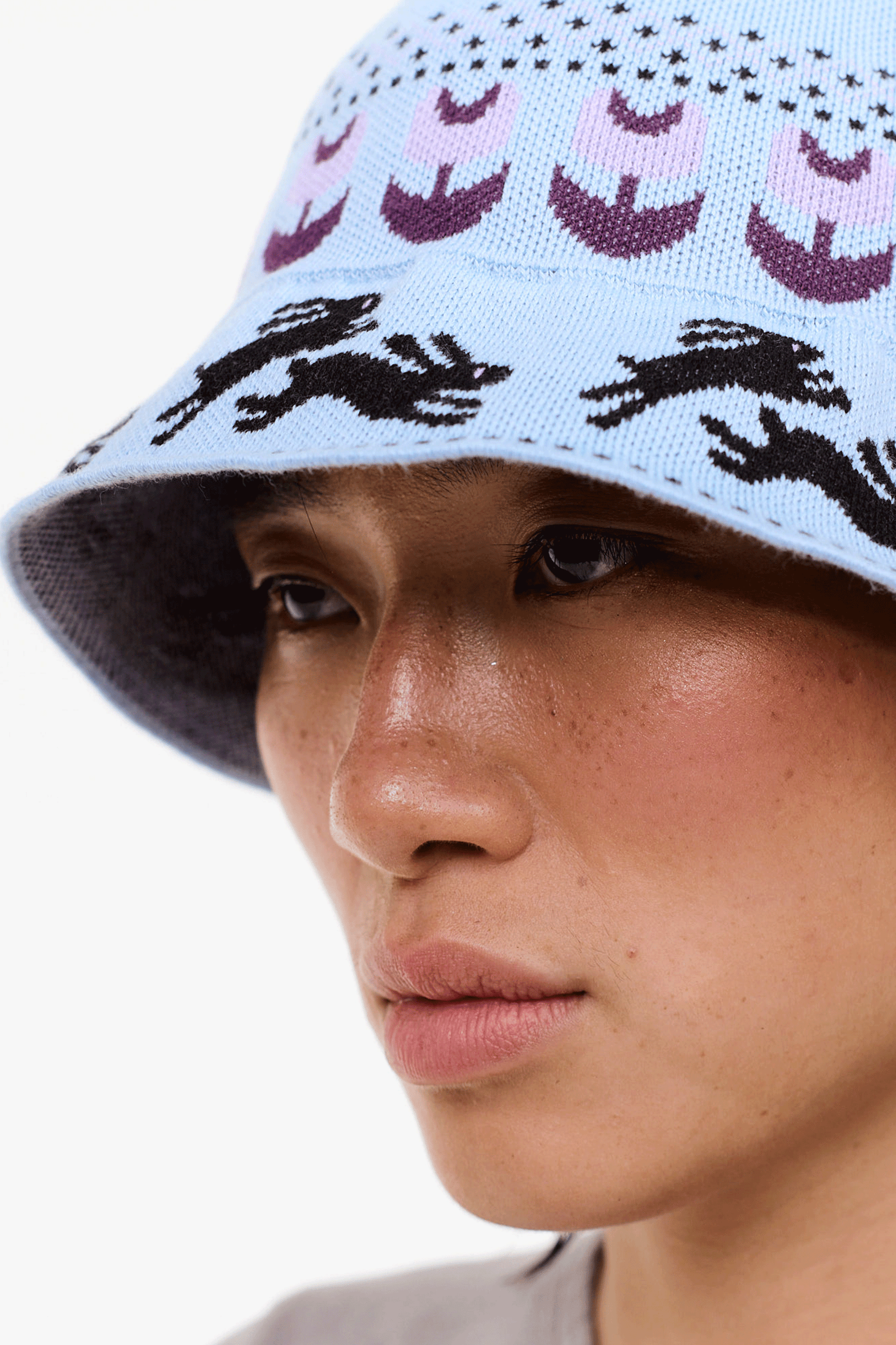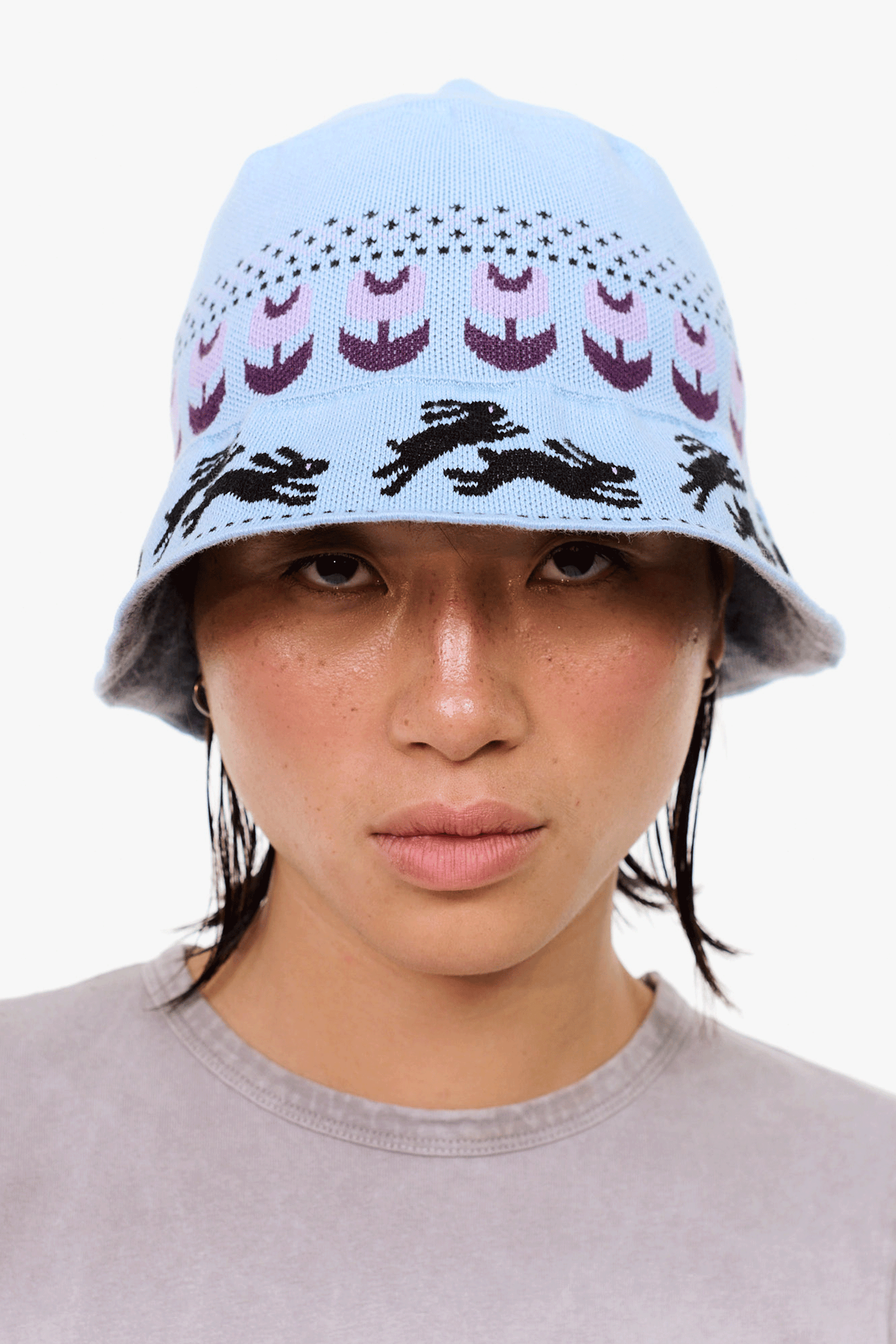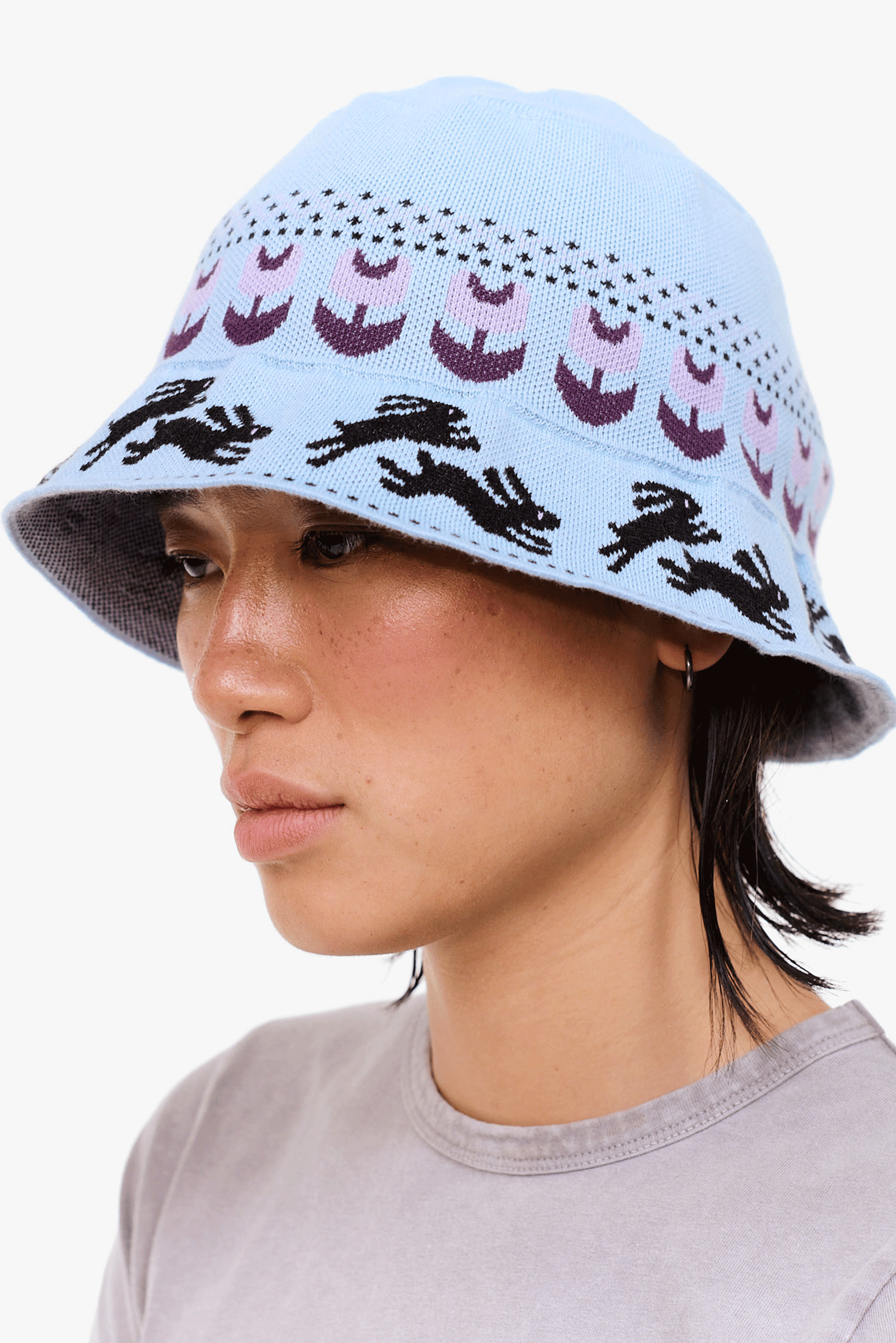 頭の周囲をぐるっと花畑を駆けるように配置されたアイコニックなウサギのデザインが可愛いです。