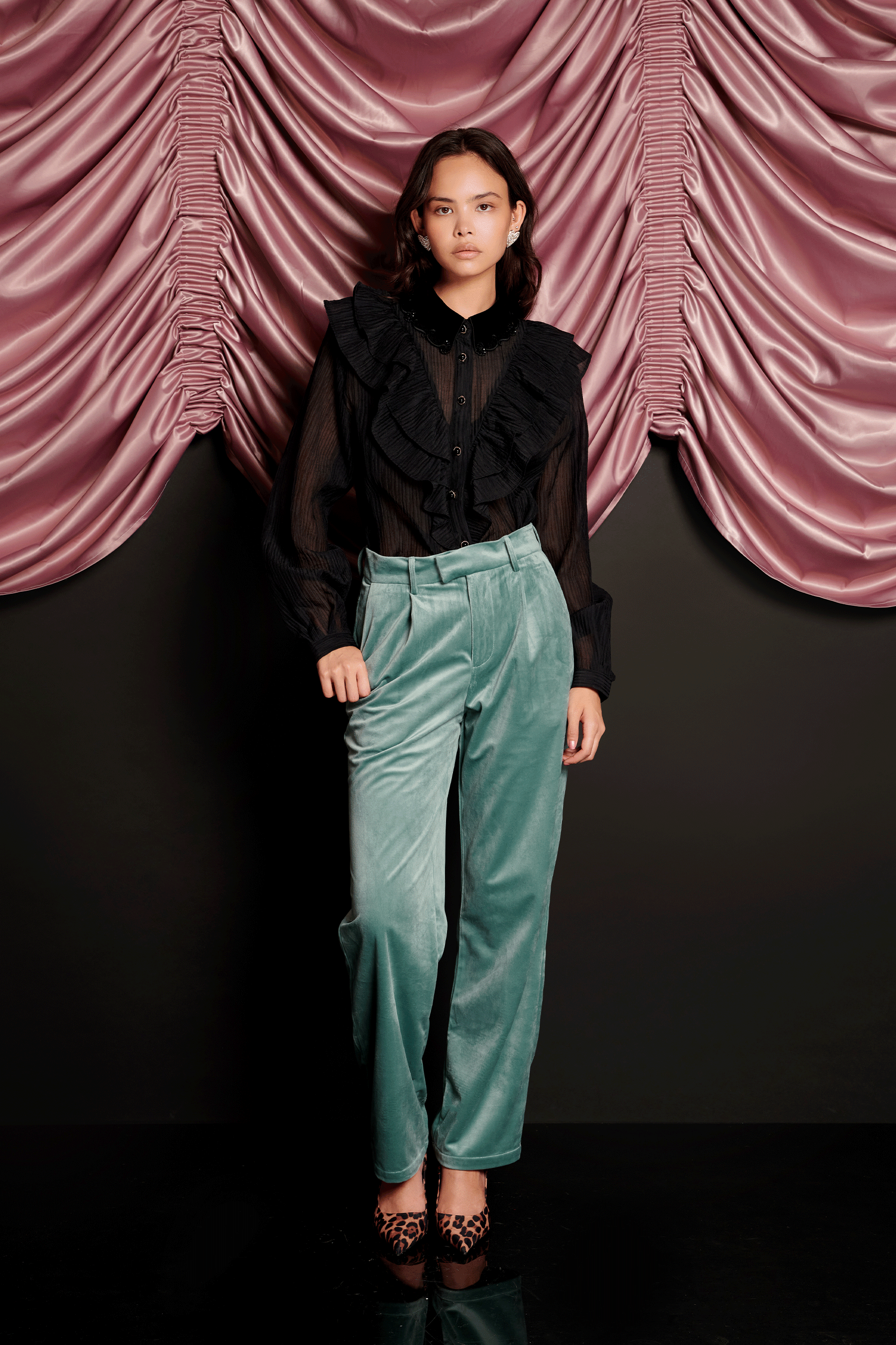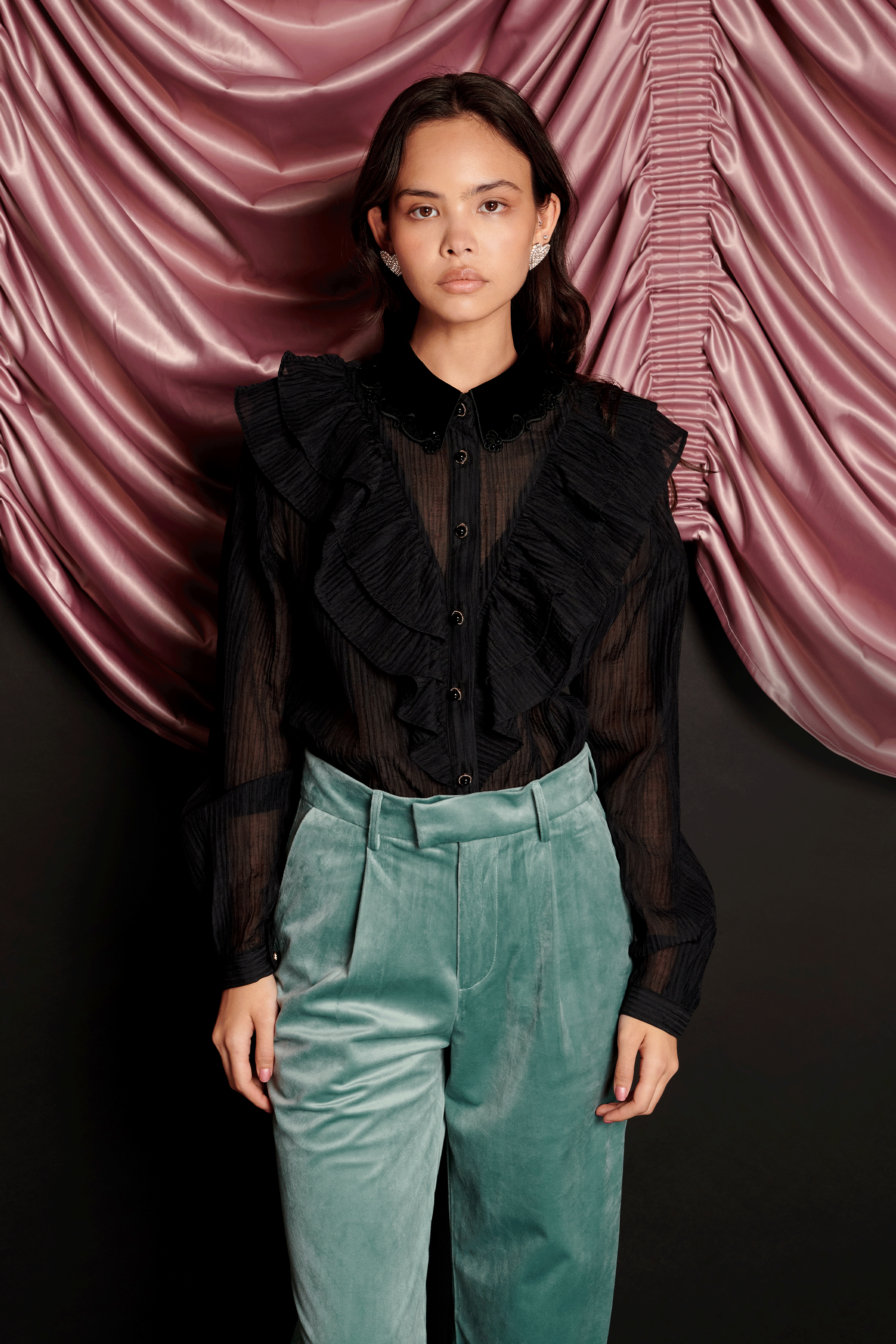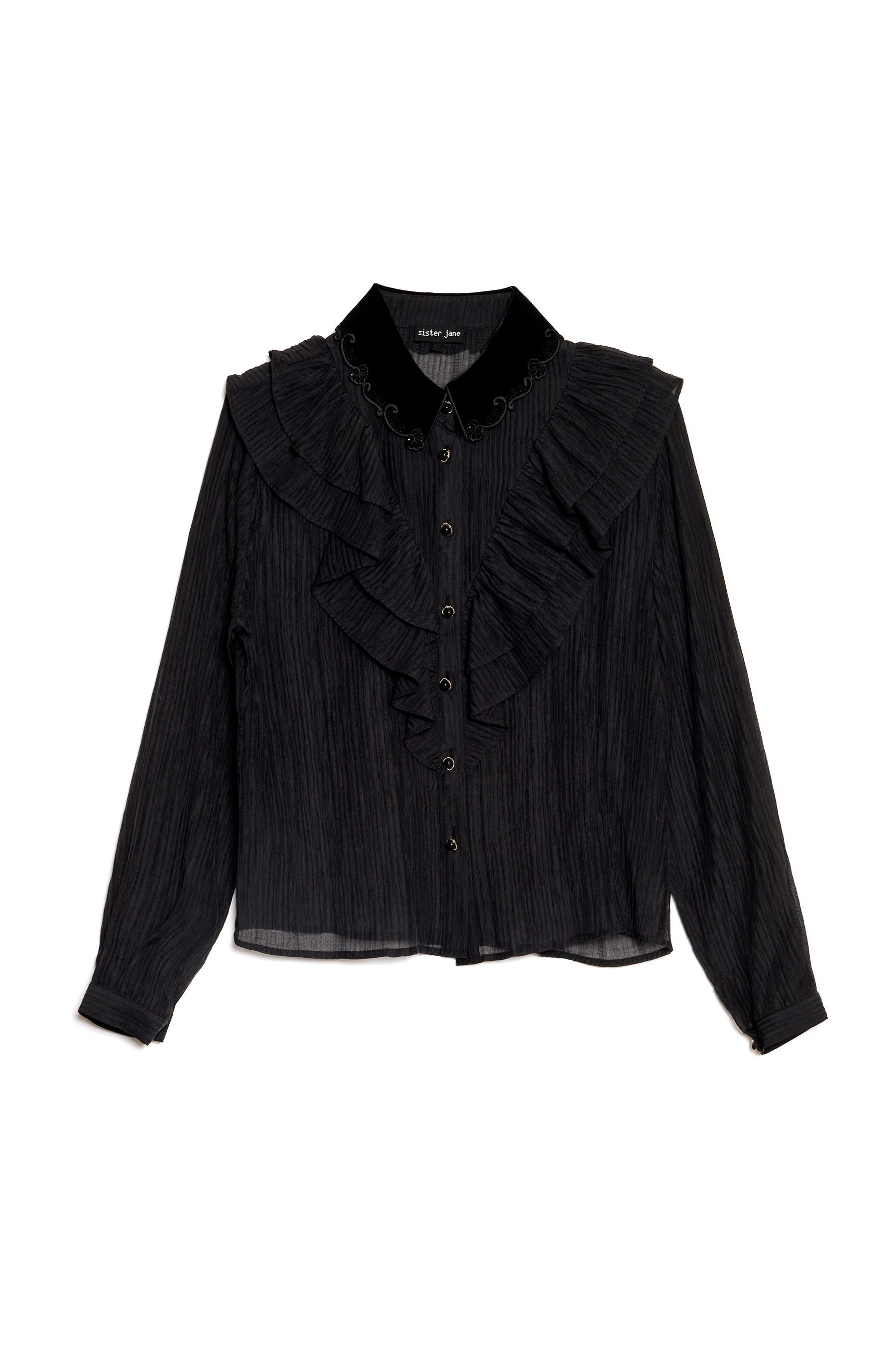 フリルに乗っかるようなベルベットの襟元には輝く装飾が施され、幻想的な可愛らしさとグラマラスな魅力が軽やかに表現されています。フロントや袖についた黒いガラスのようなボタンが上品でクラシックにまとめてくれます。