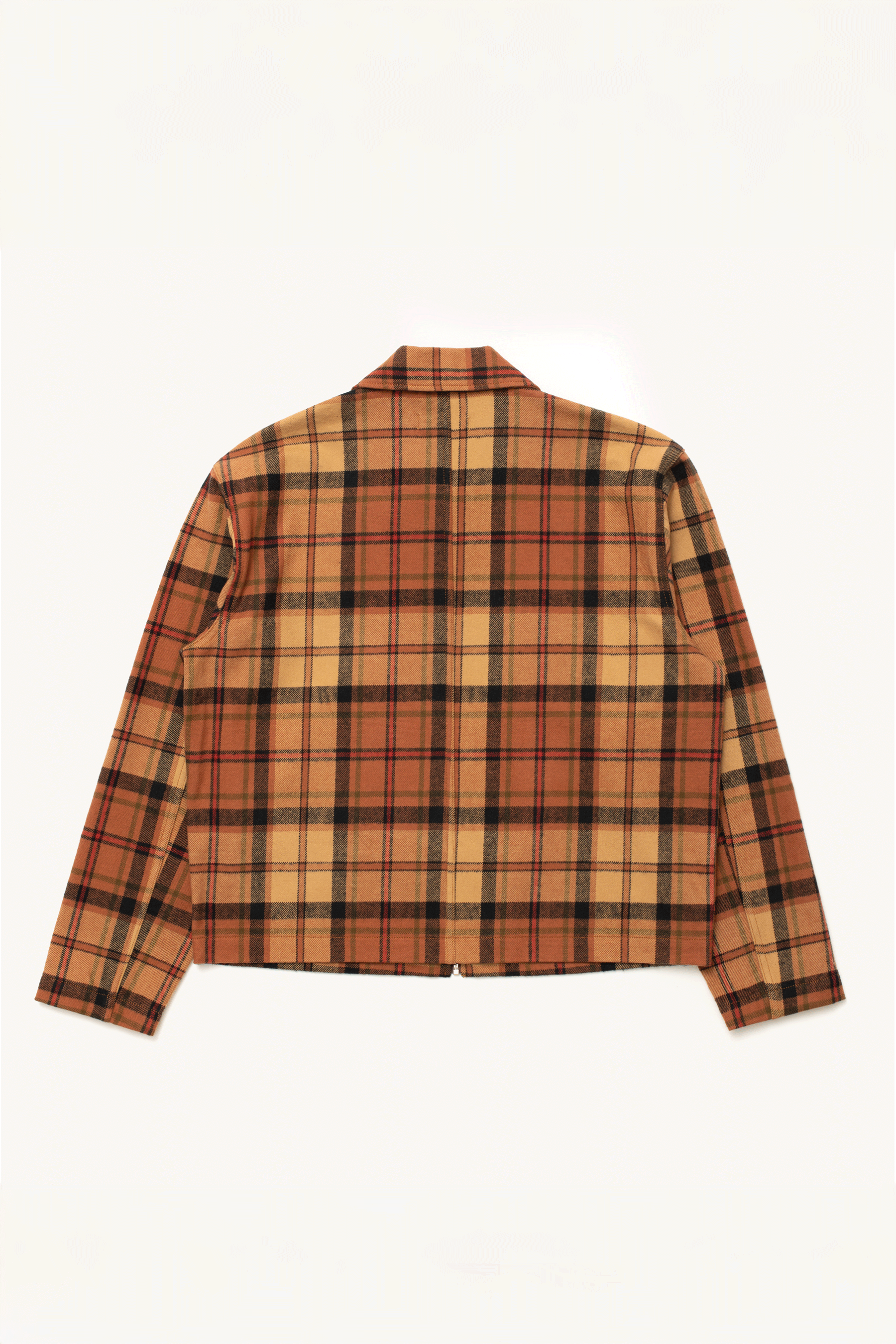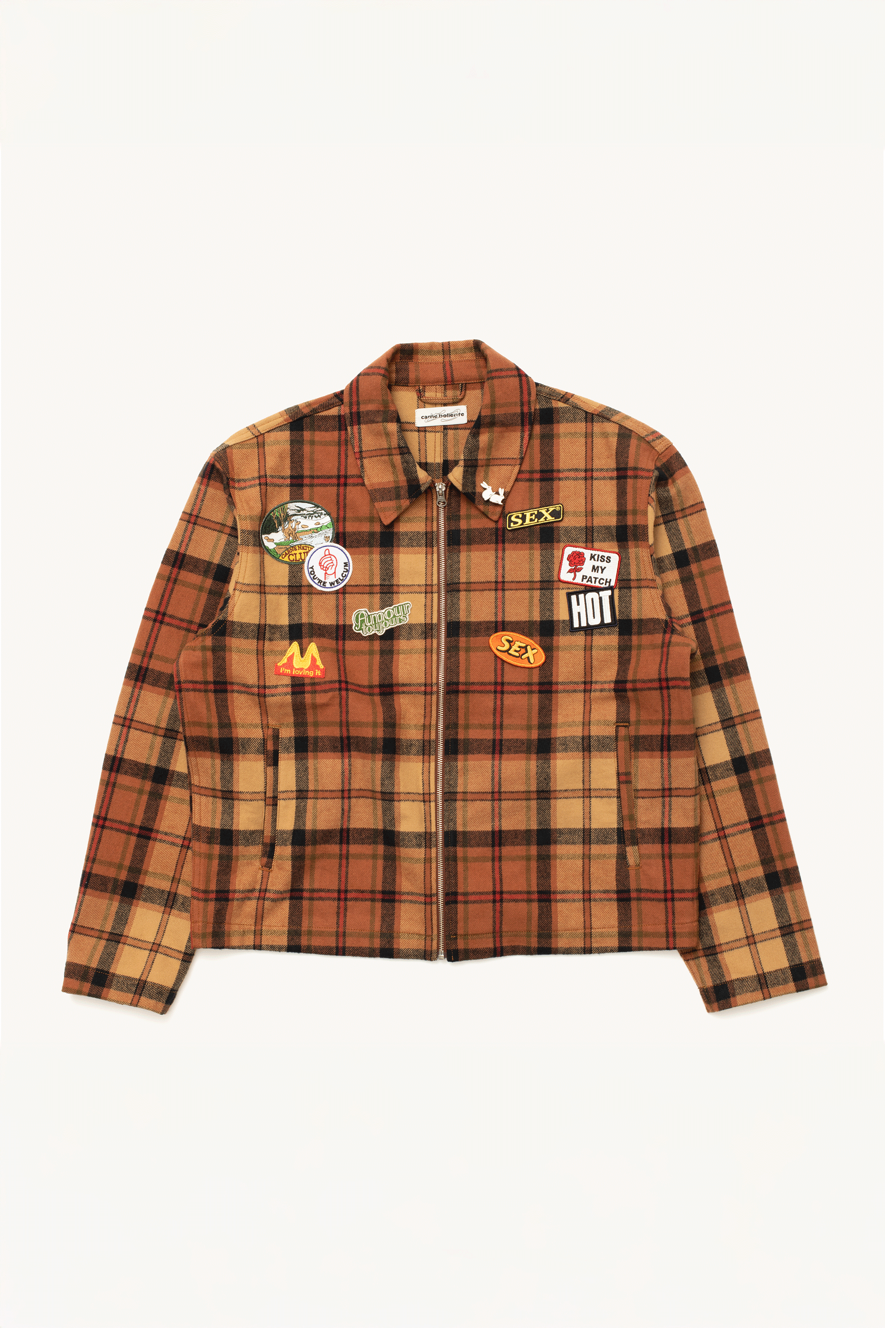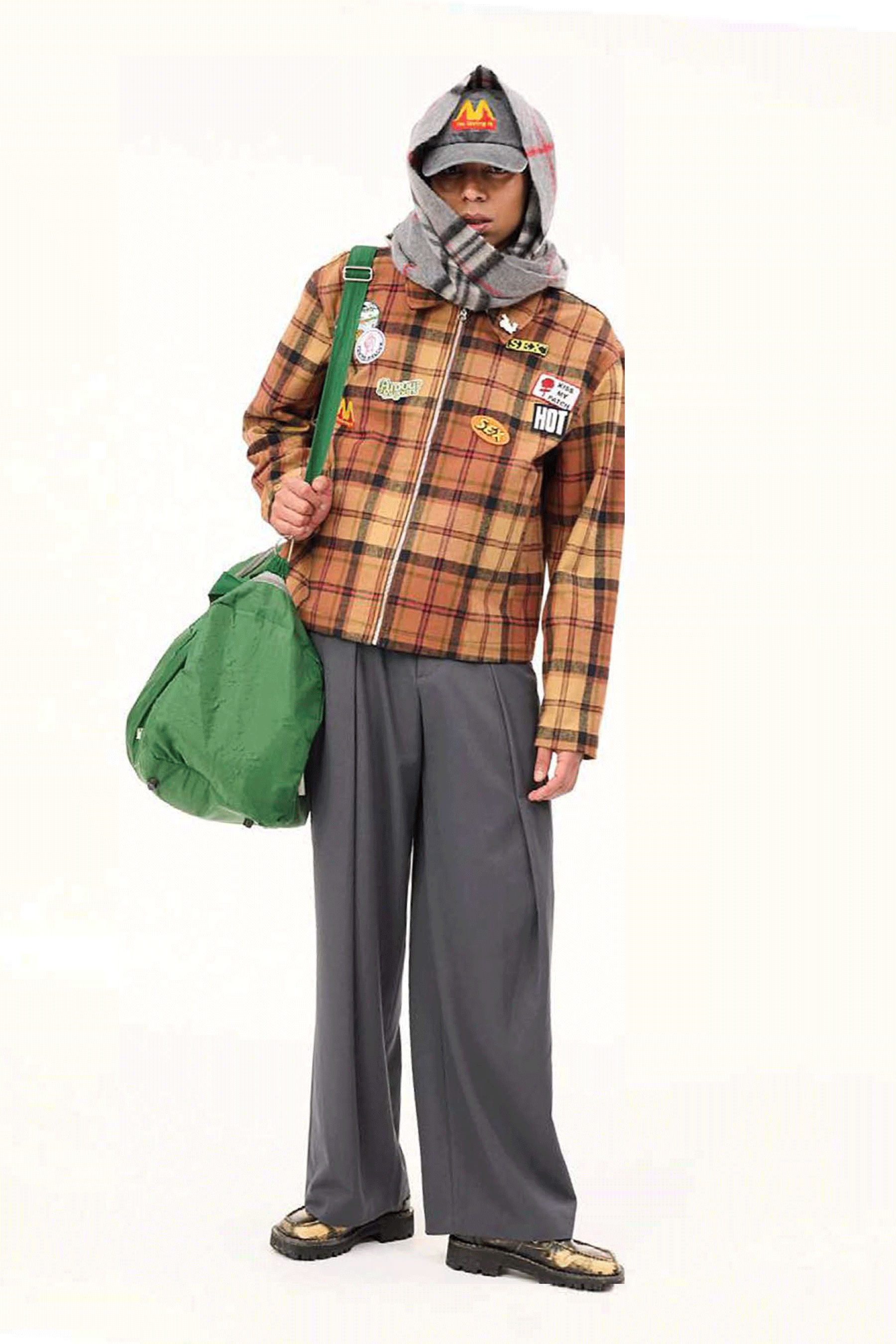 短めな着丈と程よい厚さでシャツのような着心地のアウターです。胸元に散りばめられたパッチは配置や色合いも主張しすぎずチェック柄とのバランス良く可愛いです。襟元にはバニーズにピンズが付いています。取り外し可能なのでお好みの位置につけて楽しんでみてください。