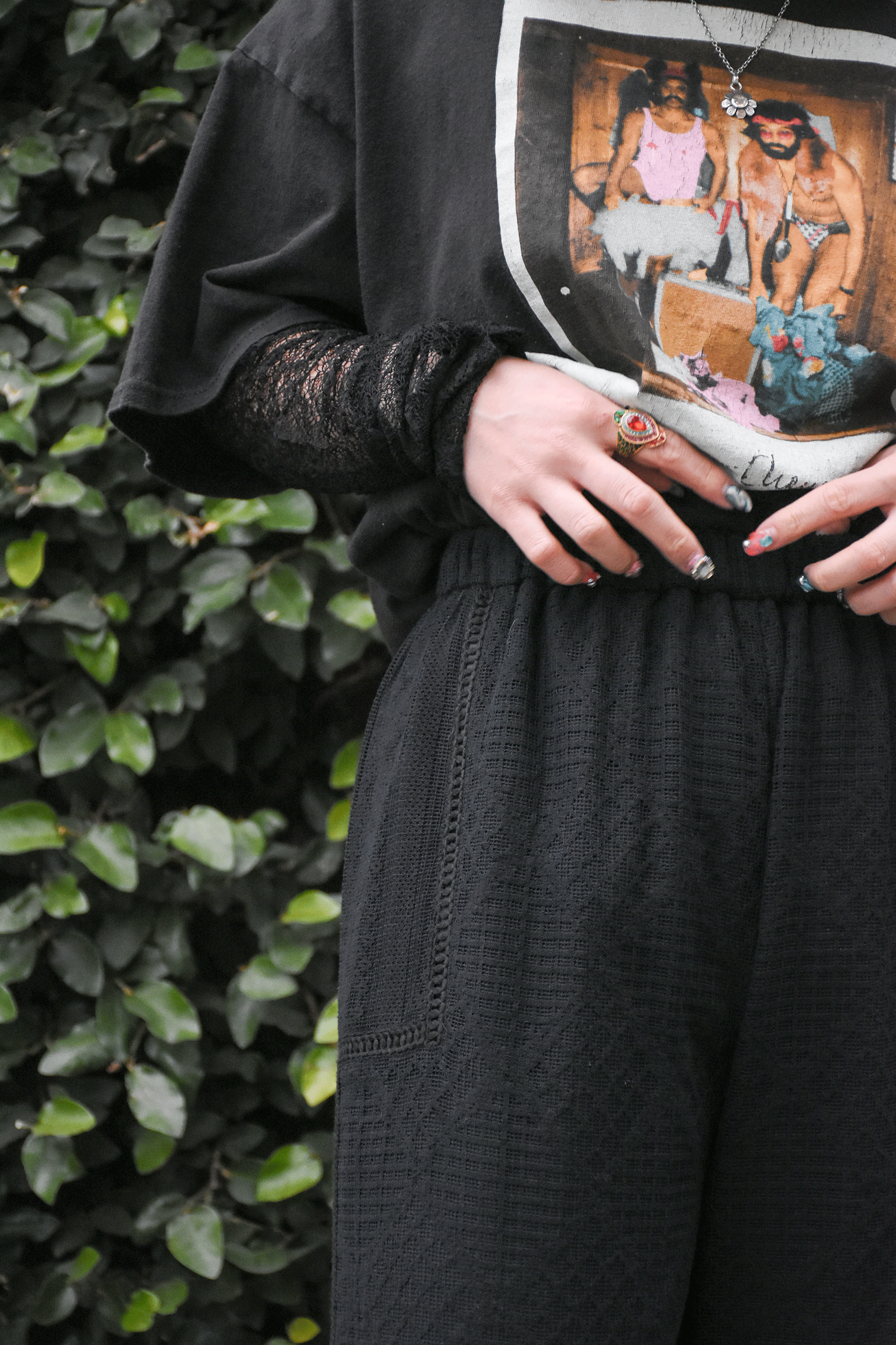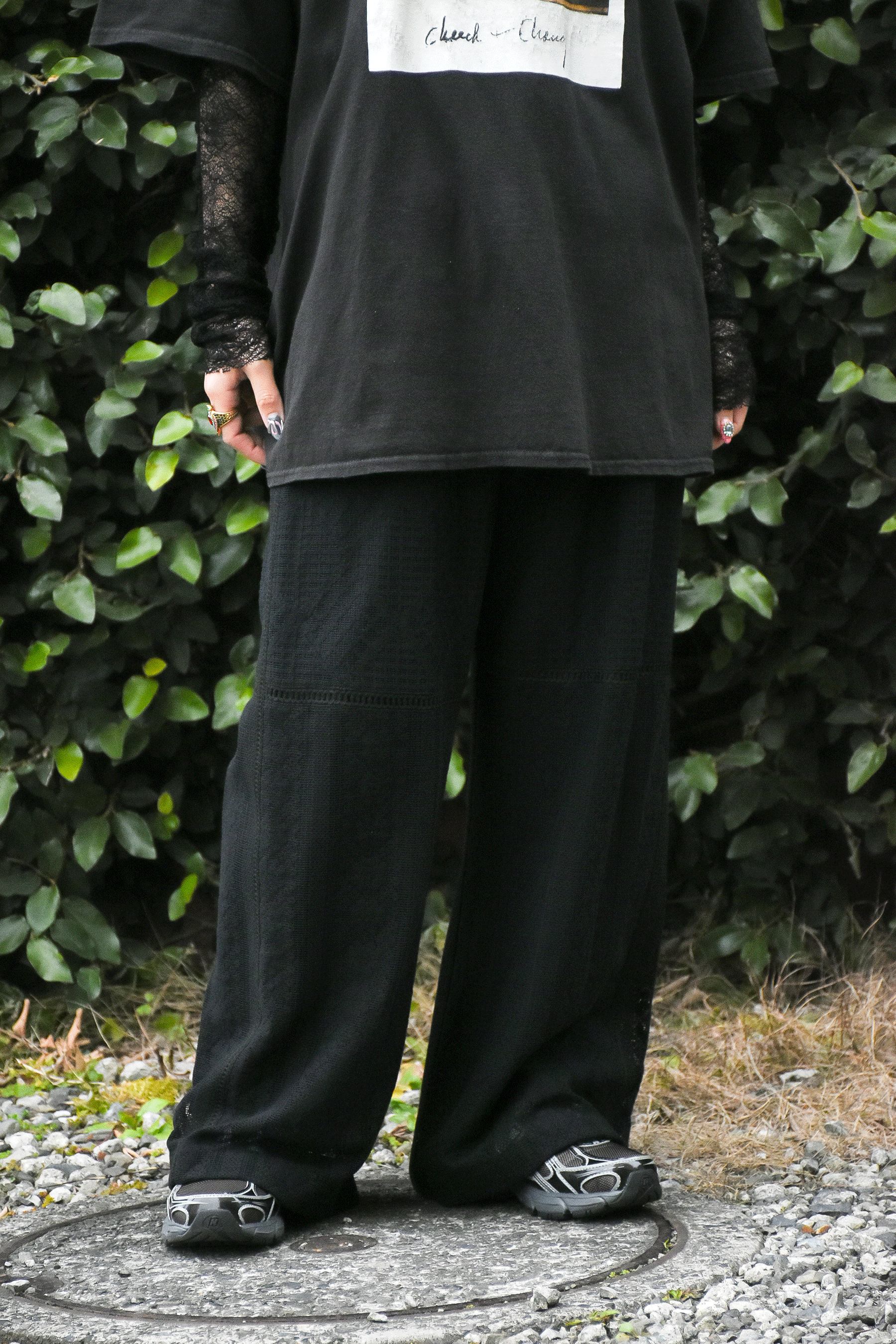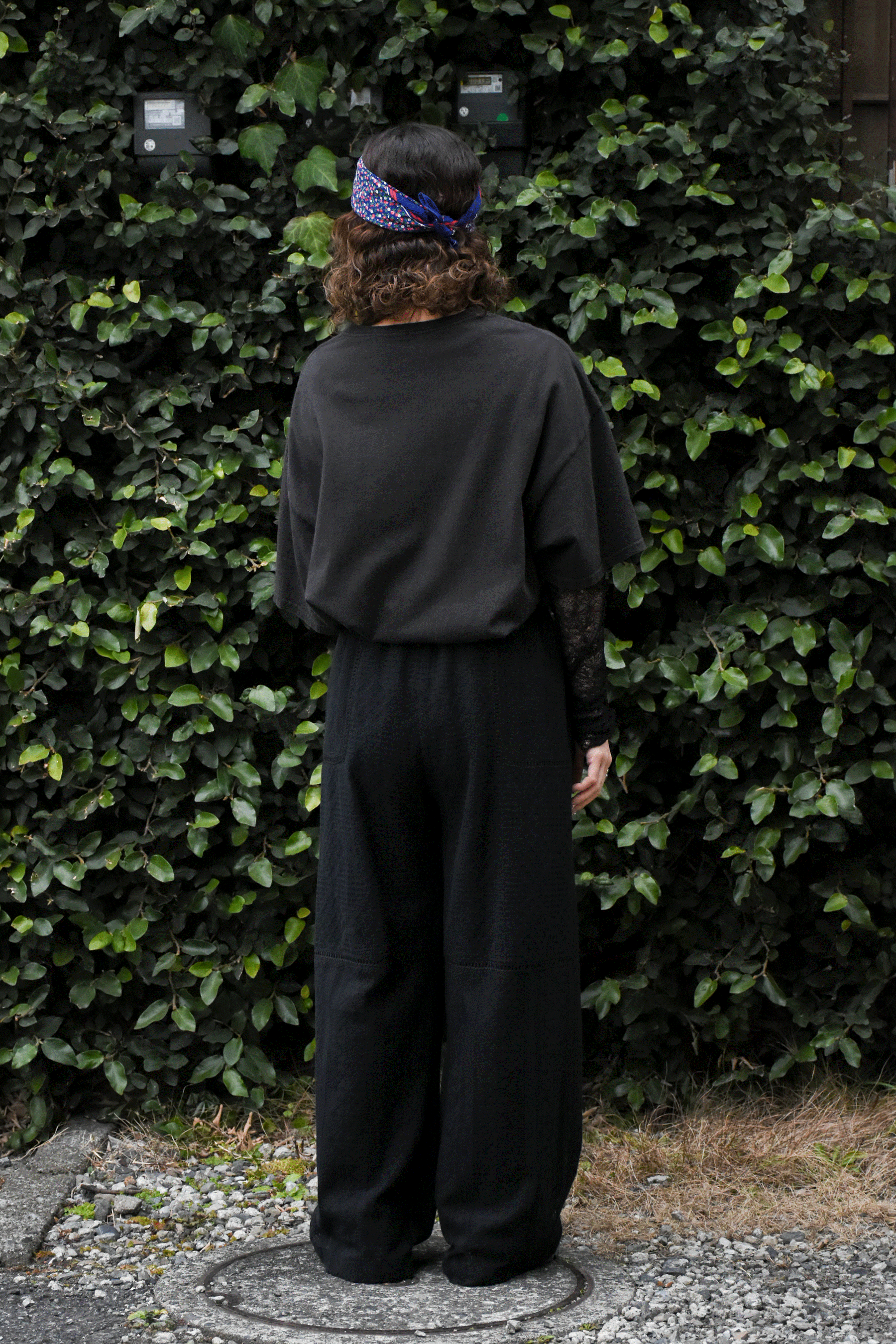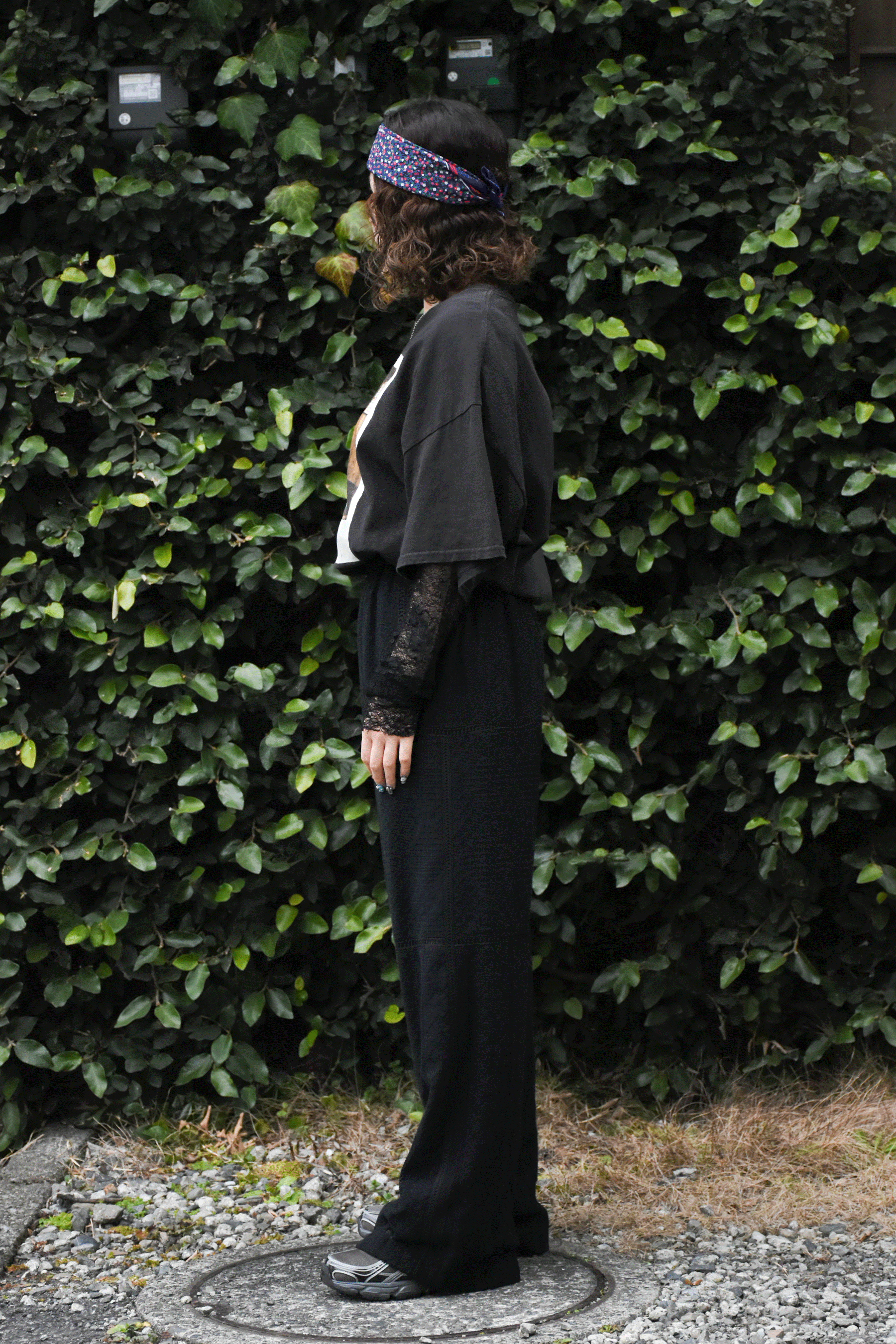 両サイドもラインパンツのように縦に段子レースが入っています。裾ギリギリまで裏地がついていて、さらっと肌あたりがいいのでトップスを選ばずスタイリングできます。綺麗めにも合わせられるパンツです。