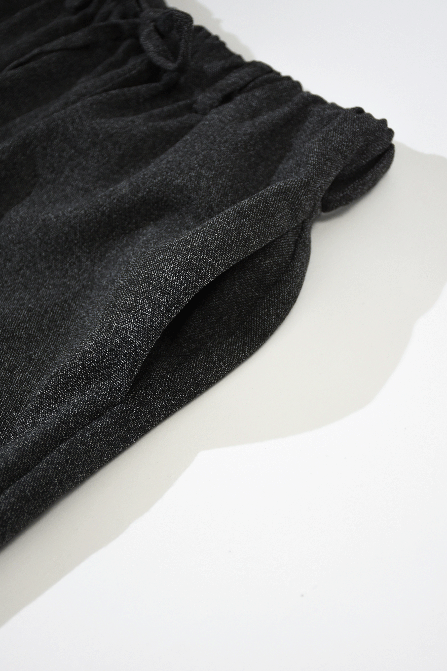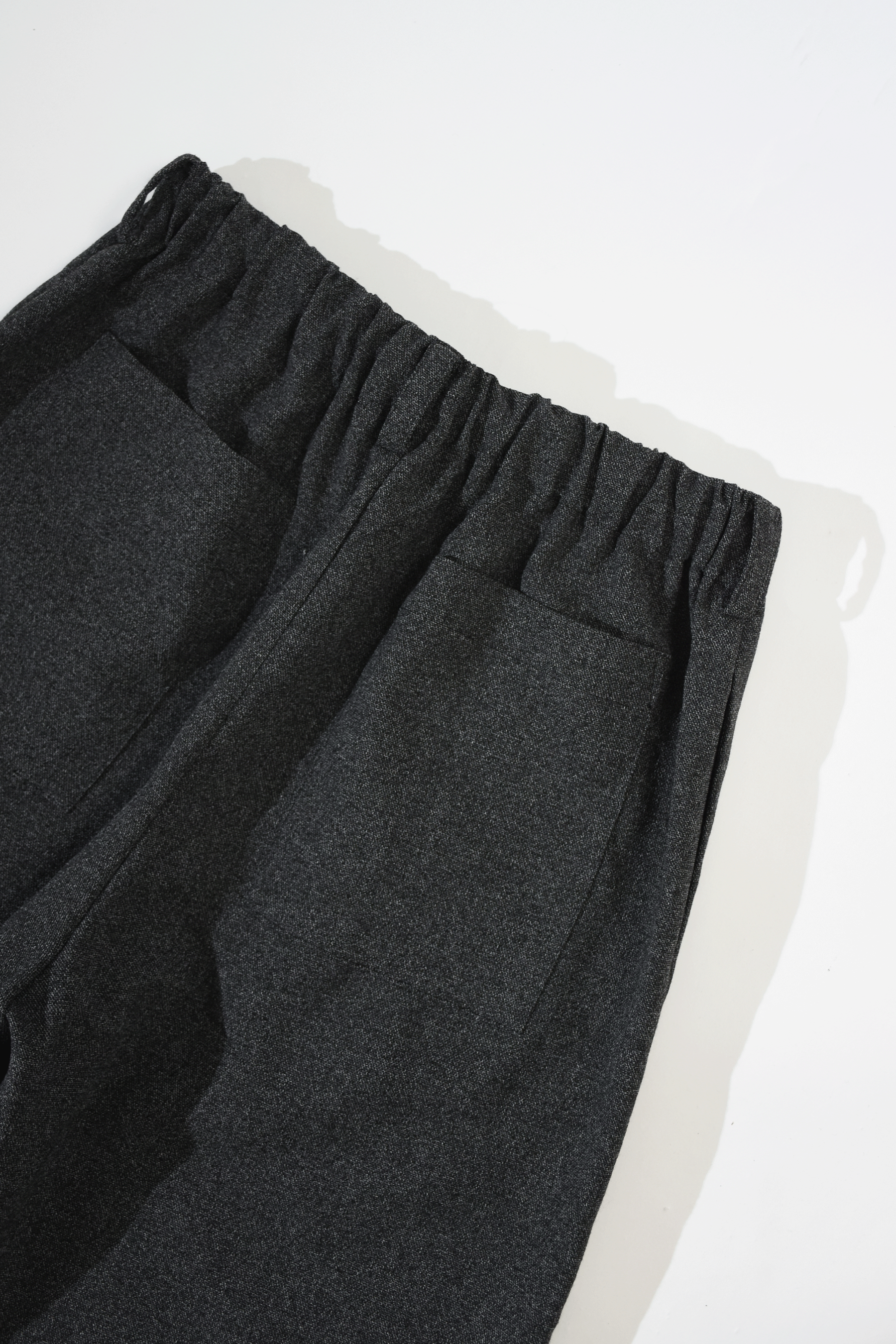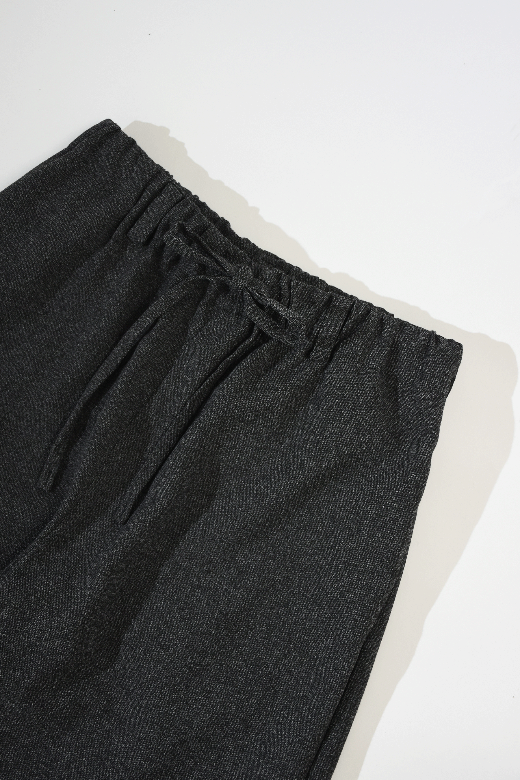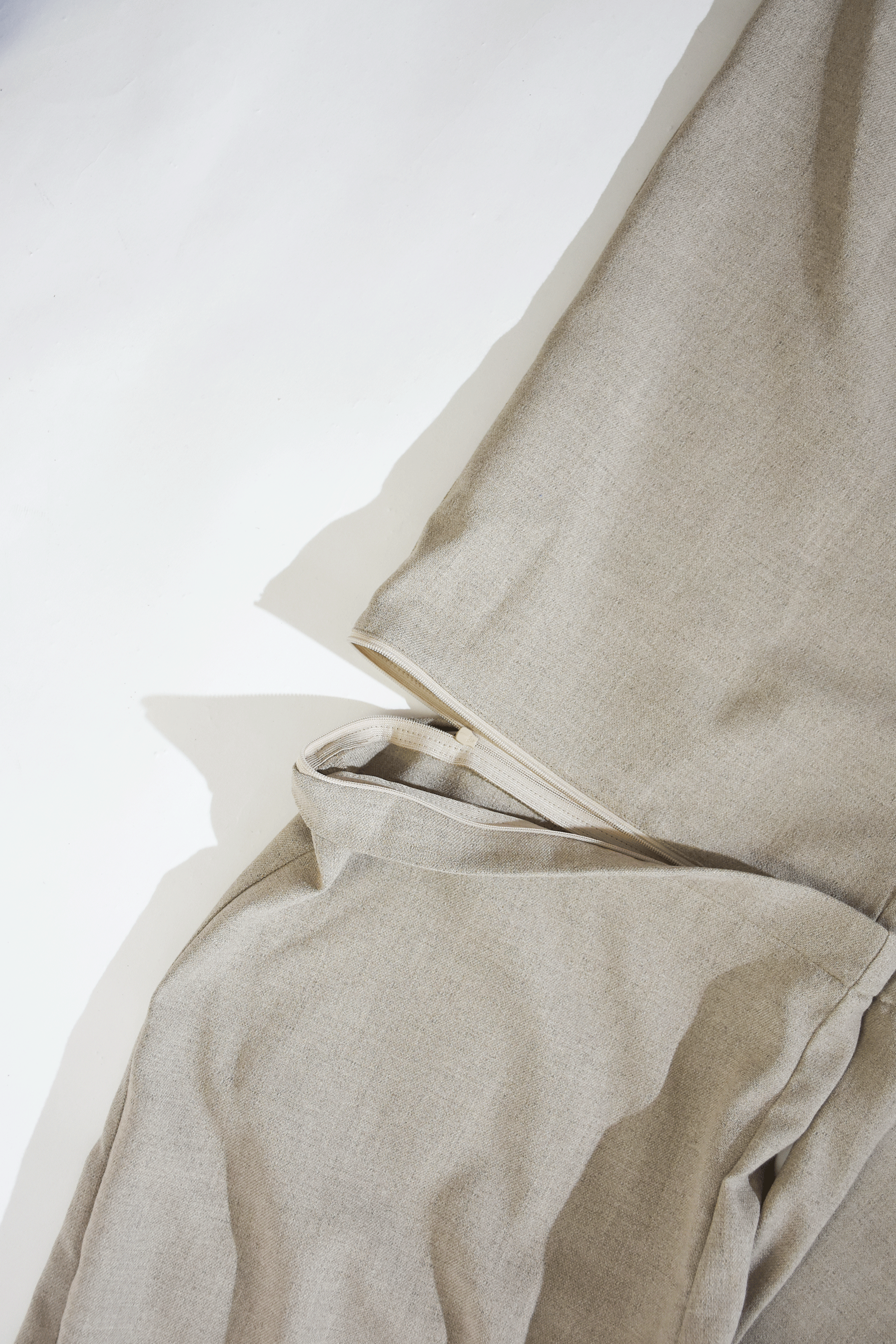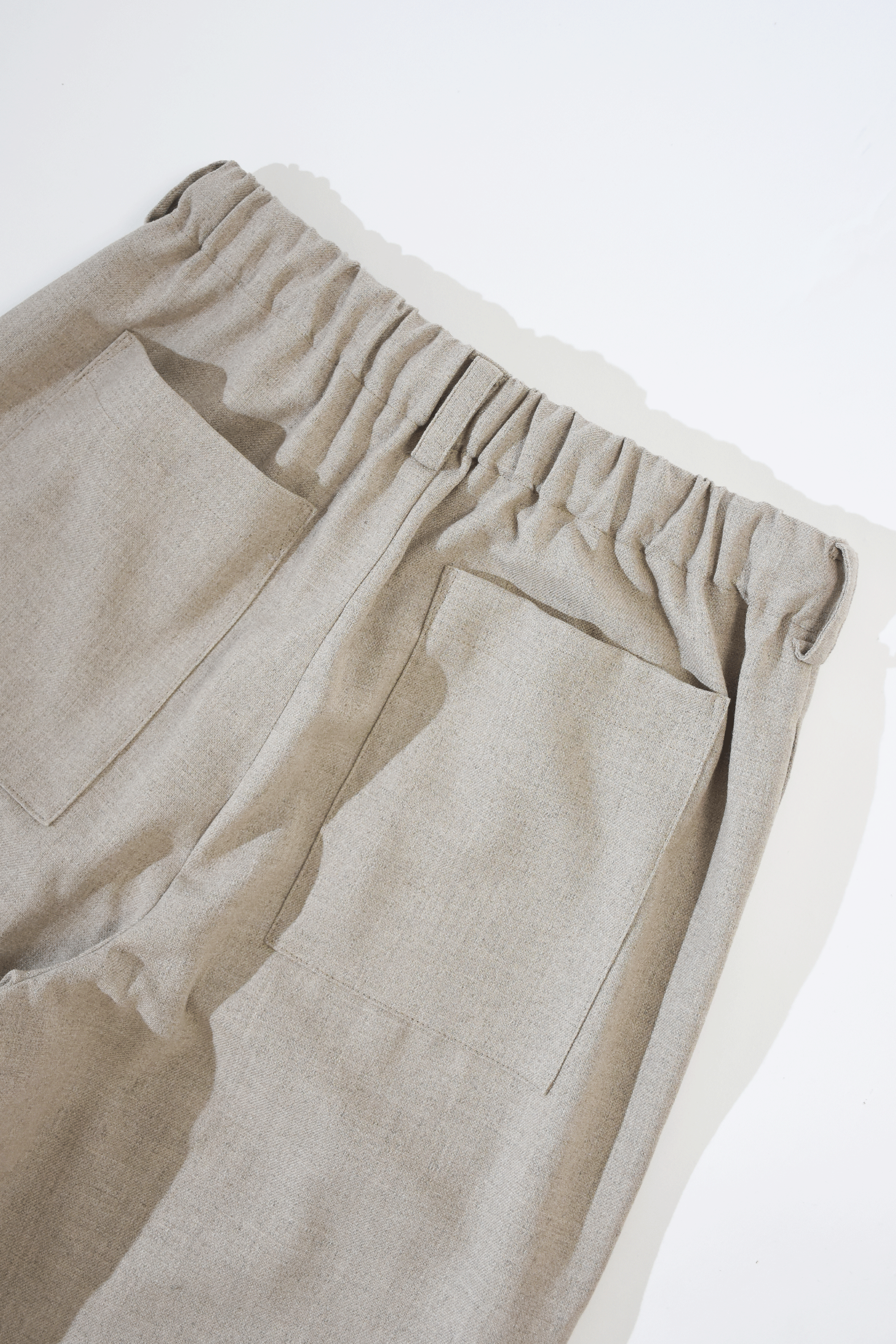シワを気にせず着用できる国産生地を使った履き心地抜群のイージーパンツ。 2色の異なる糸をインターレースしたスラブ調の糸を先染めで織り上げることで、リネンの亜麻色を表現しています。