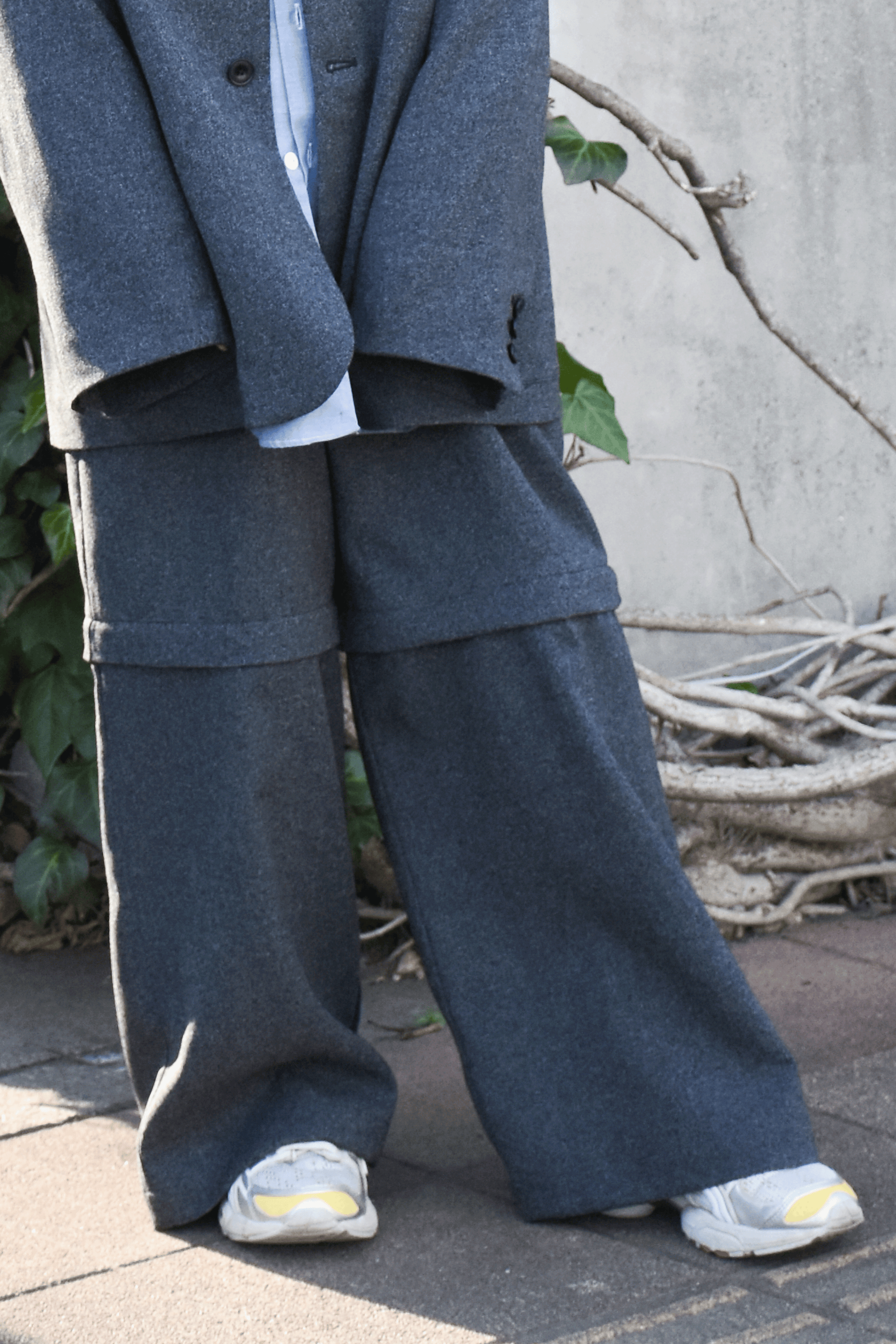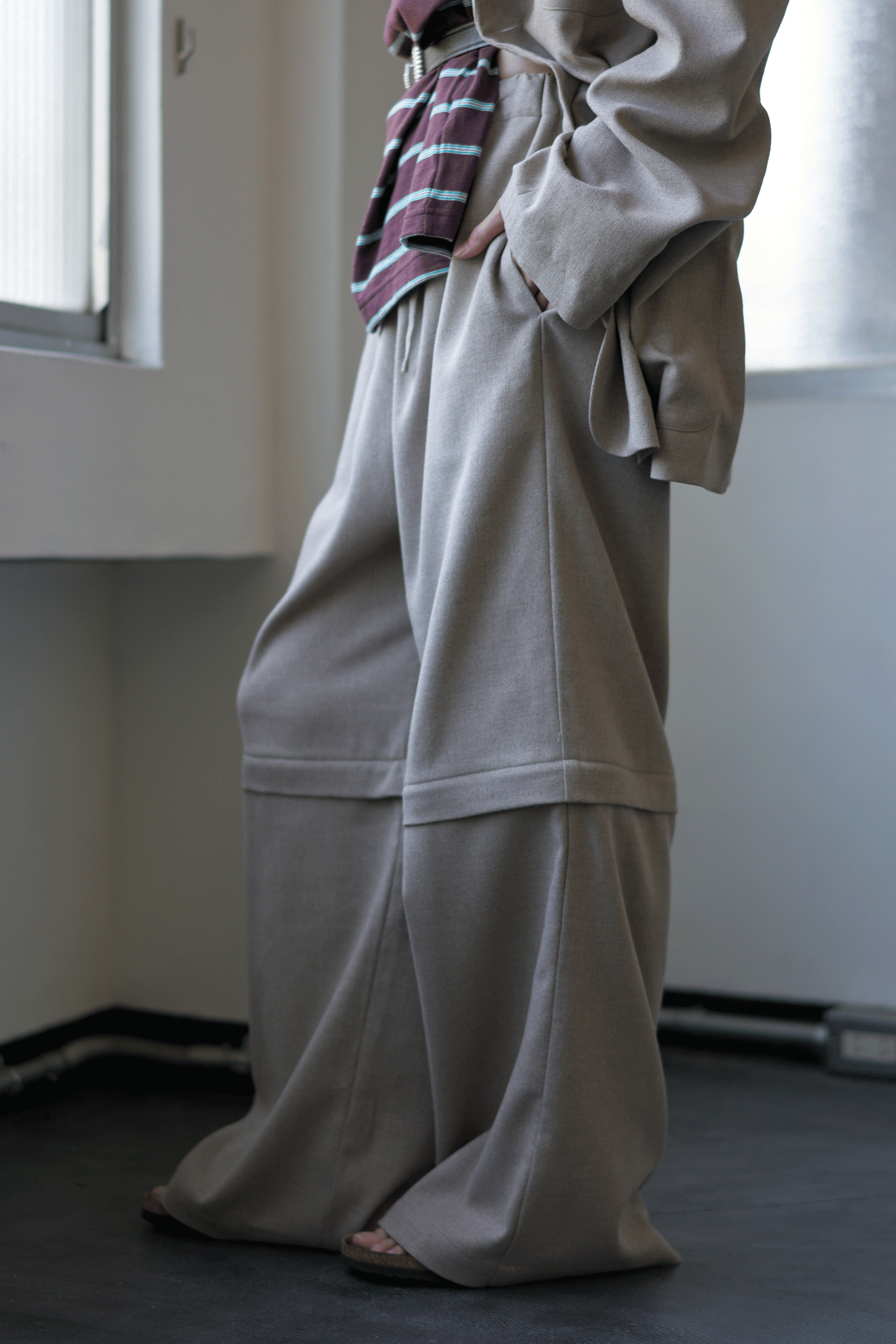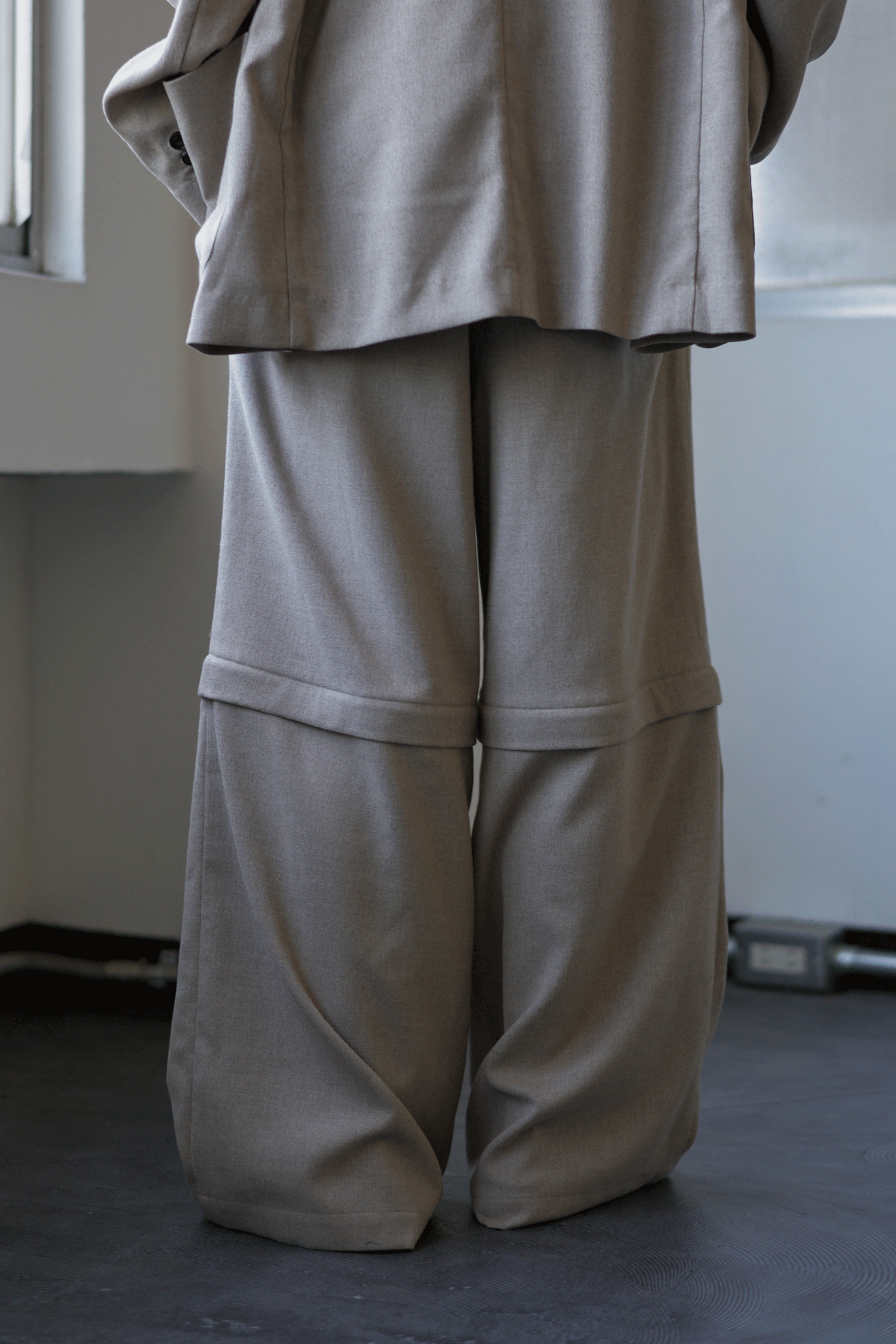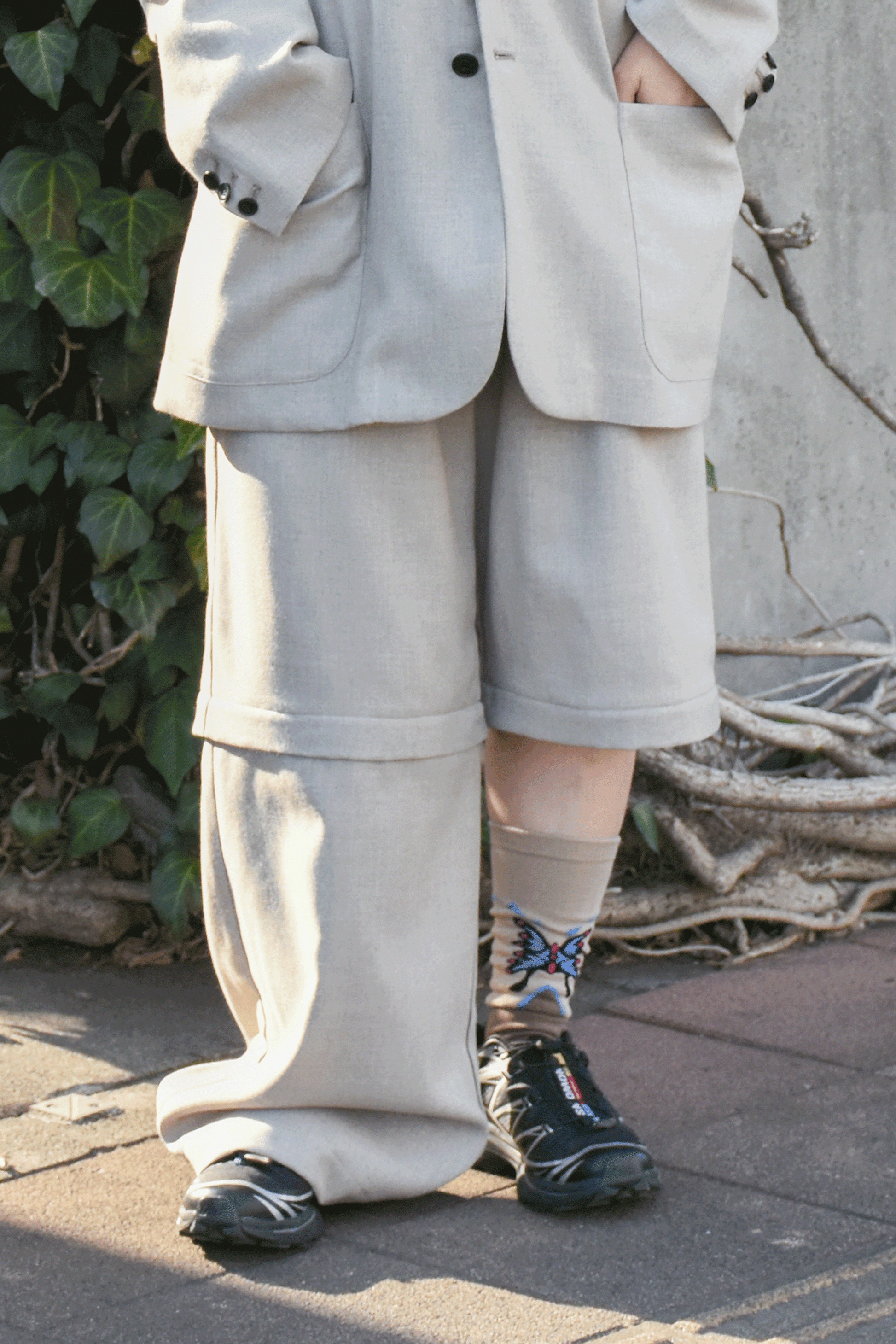 膝下部分を外すことでショートパンツとしても着用できる2way仕様のデザインになっています。ショートパンツは膝がでないバランスでつくられています。