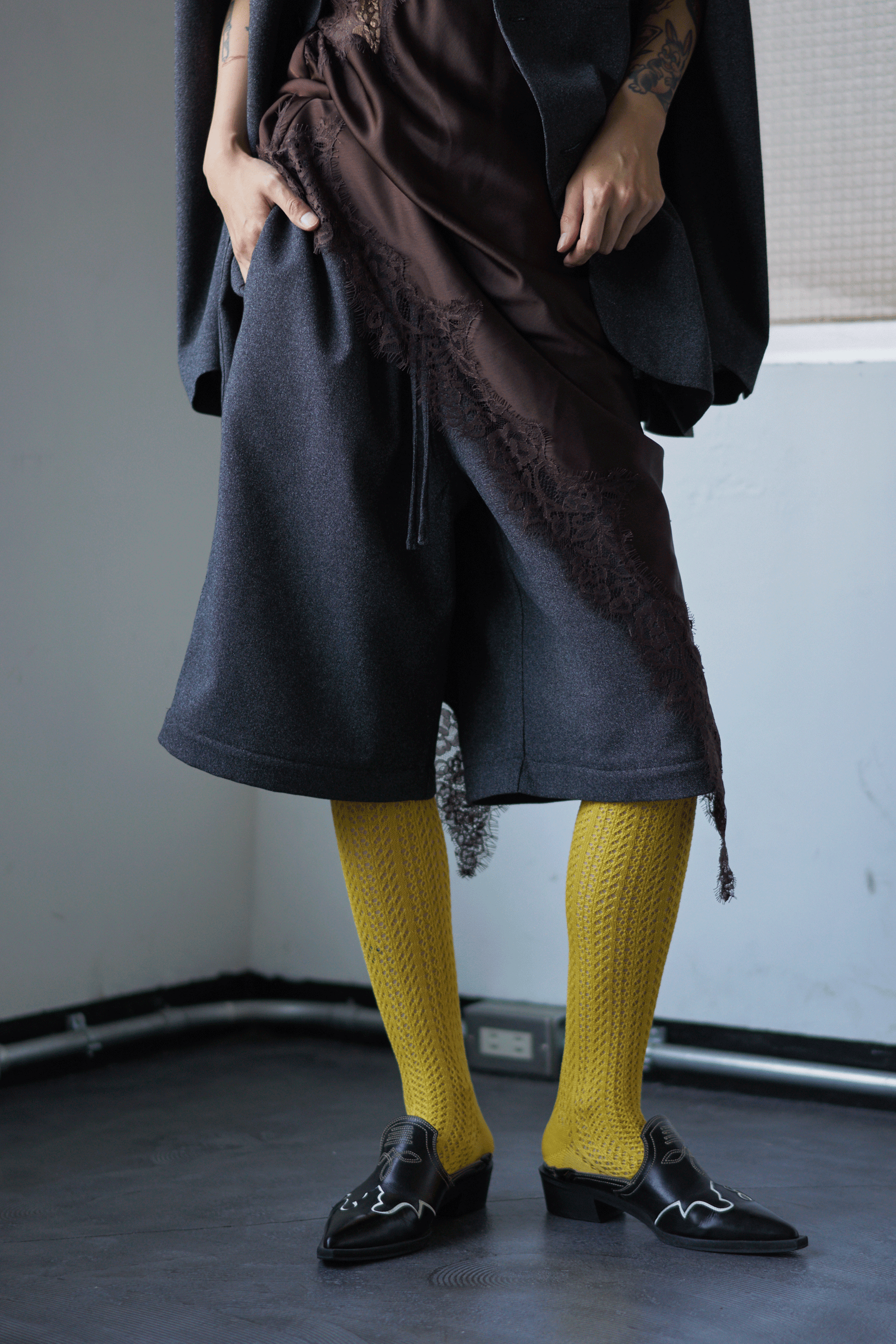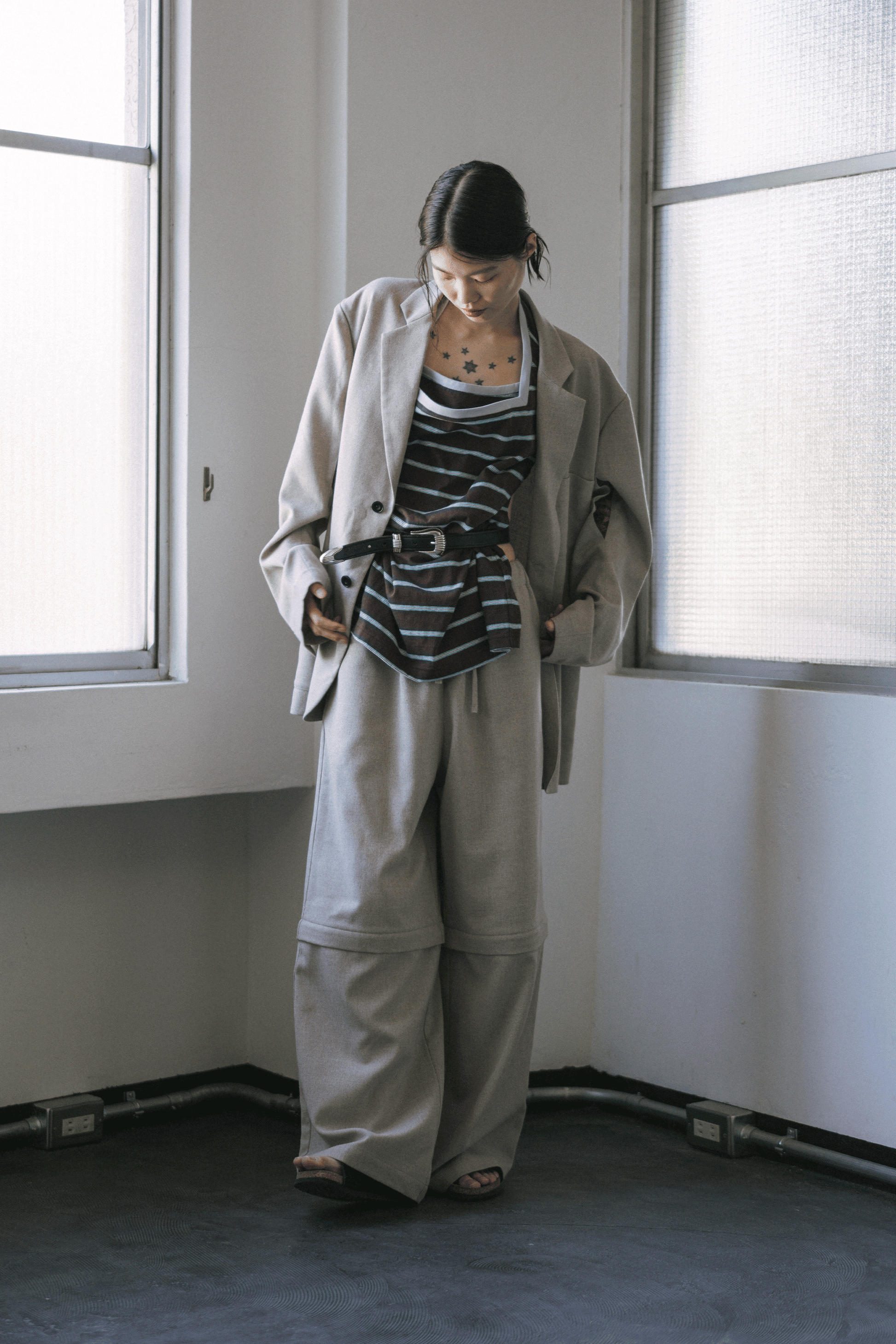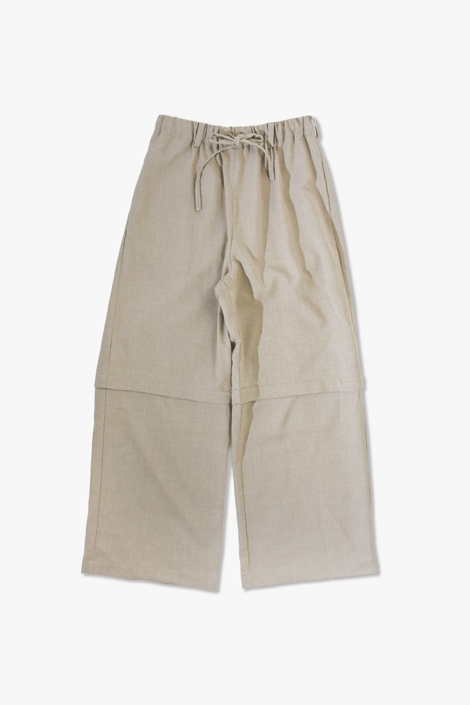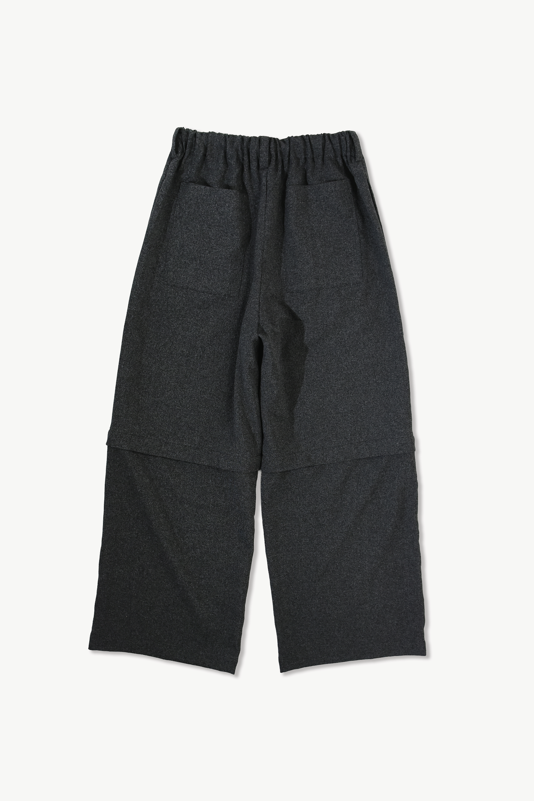 膝下部分を外すことでショートパンツとしても着用できる2way仕様のデザインになっています。ショートパンツは膝がでないバランスでつくられています。