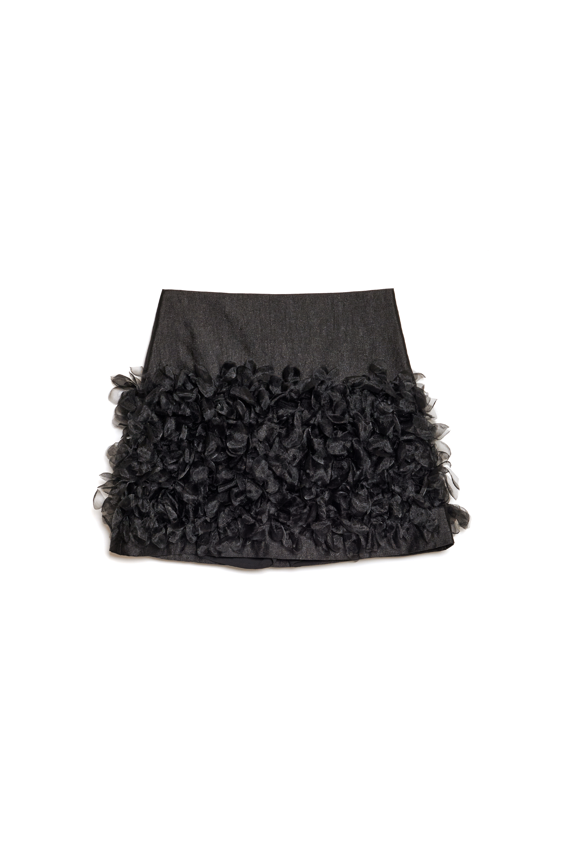 裾に咲くオーガンジーの花々が遊び心を添える華やかなミニスカート。