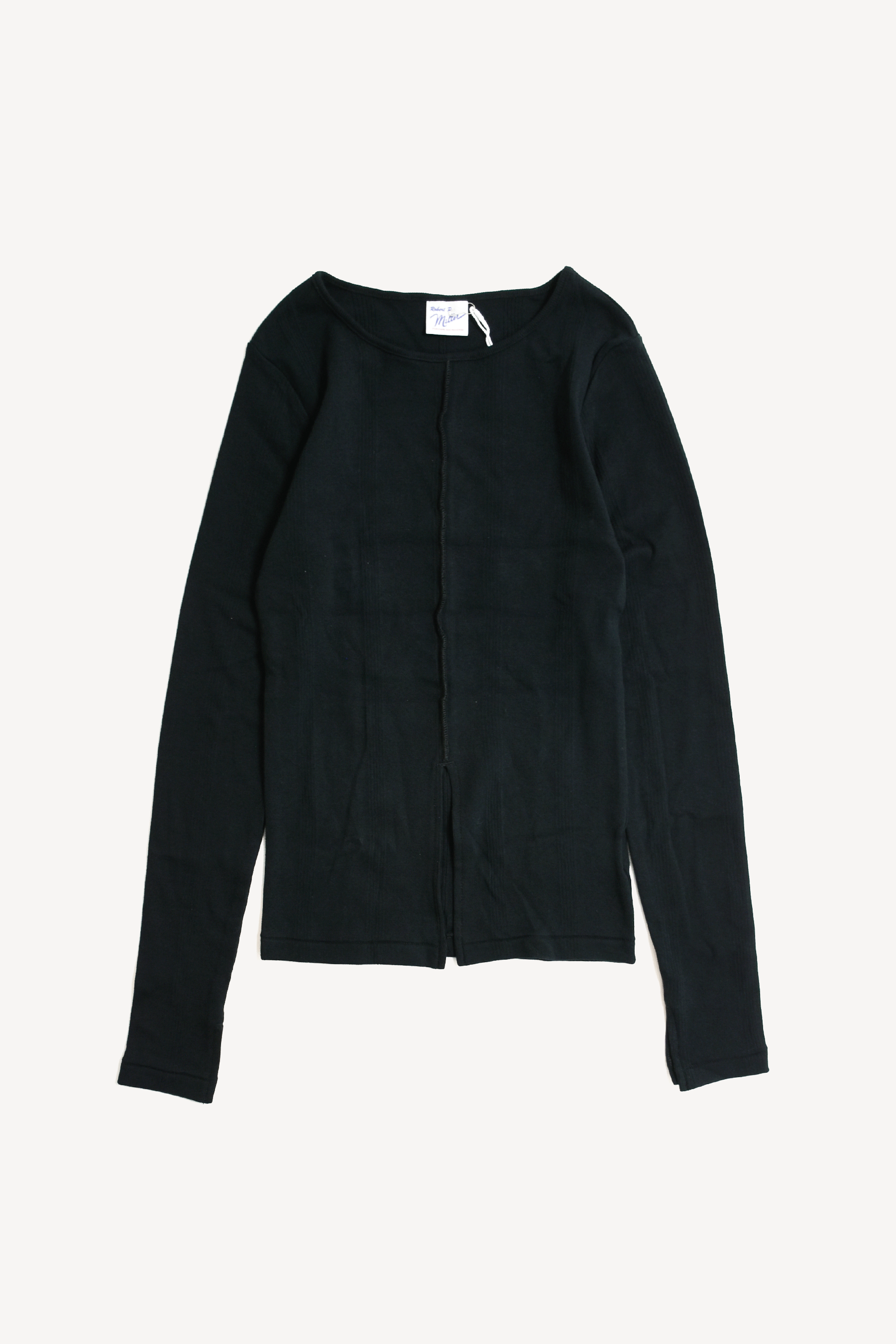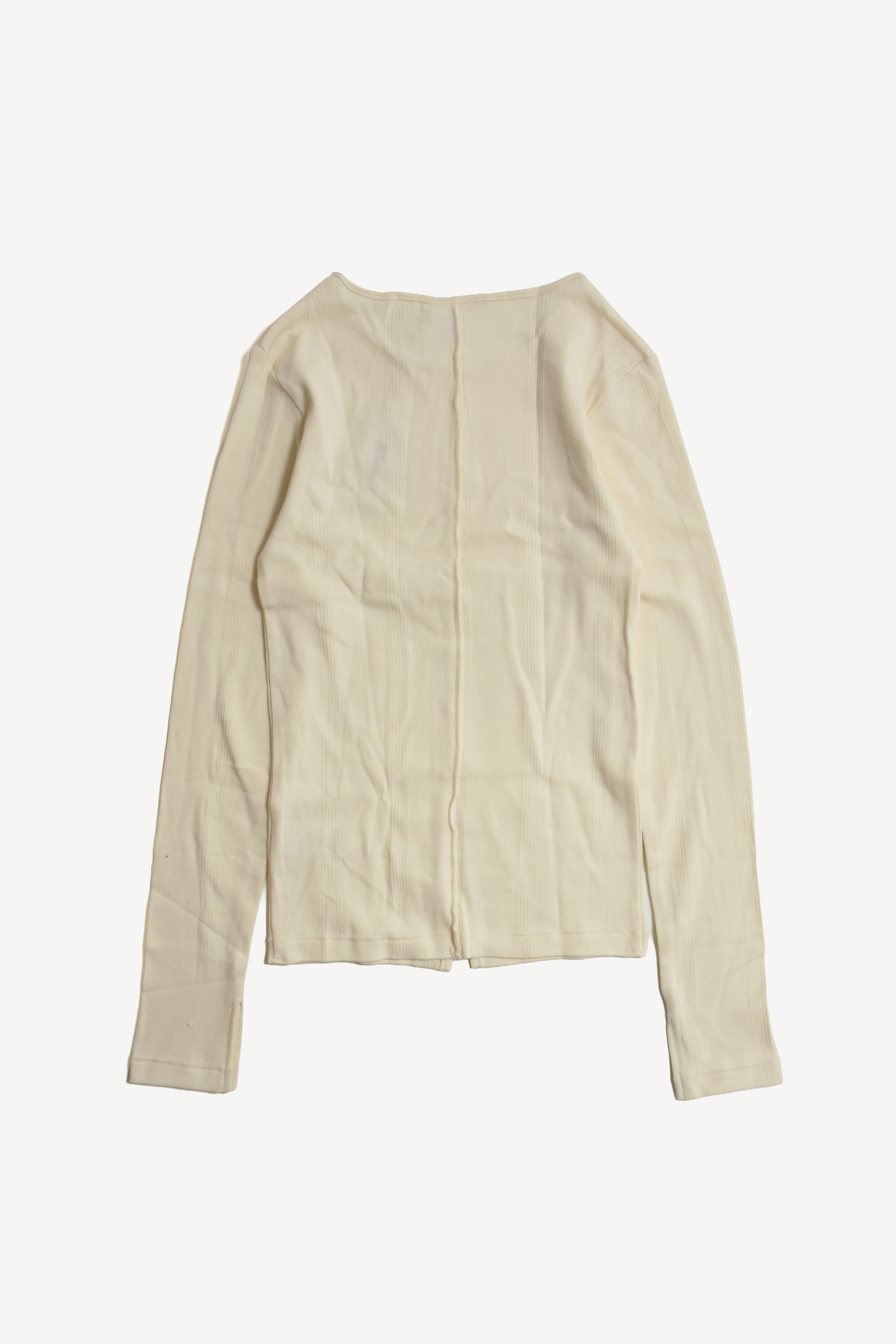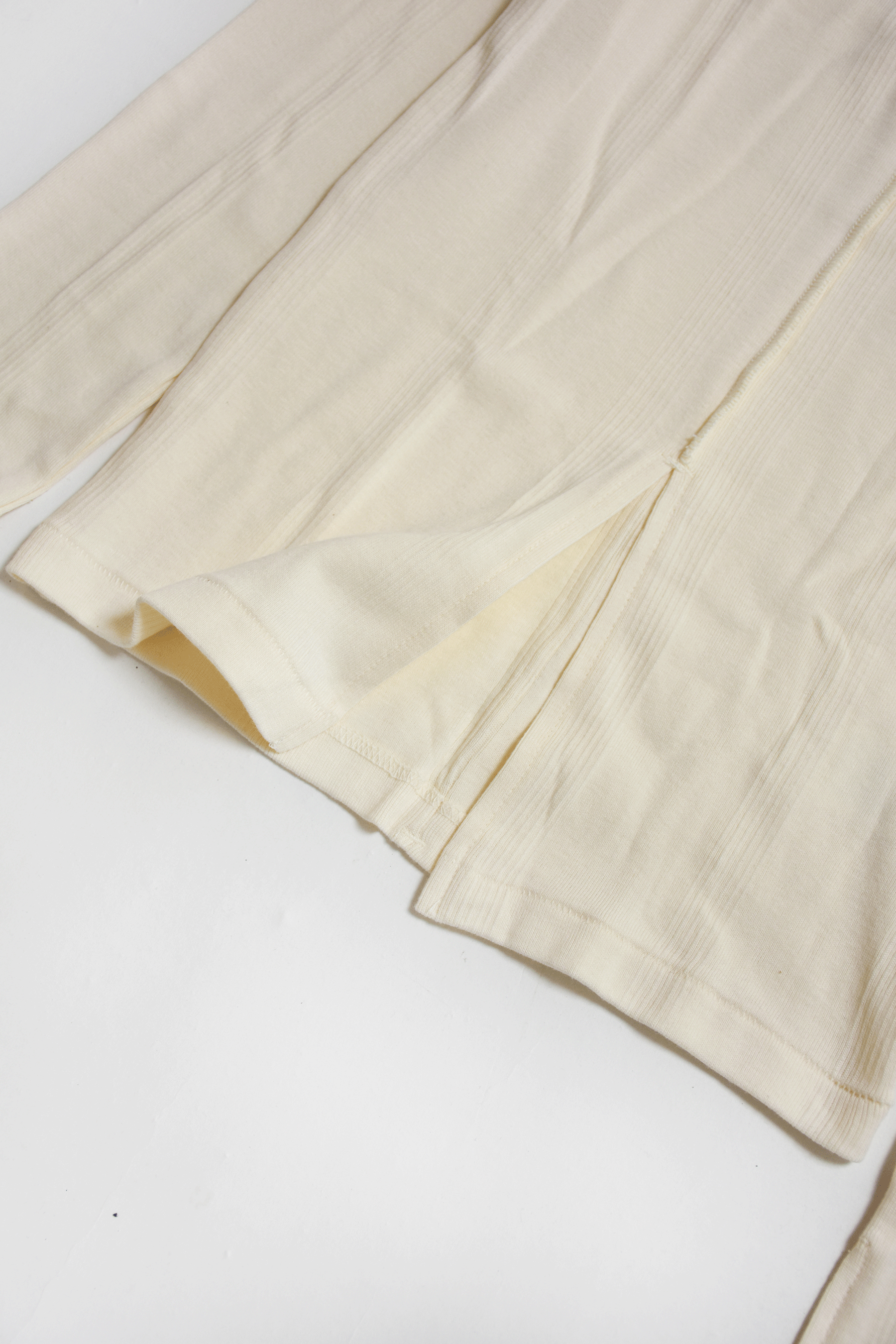 ニットのように凹凸のある柄のような編み地のパネルリブを採用した程よい厚さがいいロングスリーブトップス。 センター裾にスリットが入っているのがバランスとりやすいです。 ピタッとしすぎない程よいフィット感と厚さが何枚持っていたい気持ちいい素材です。