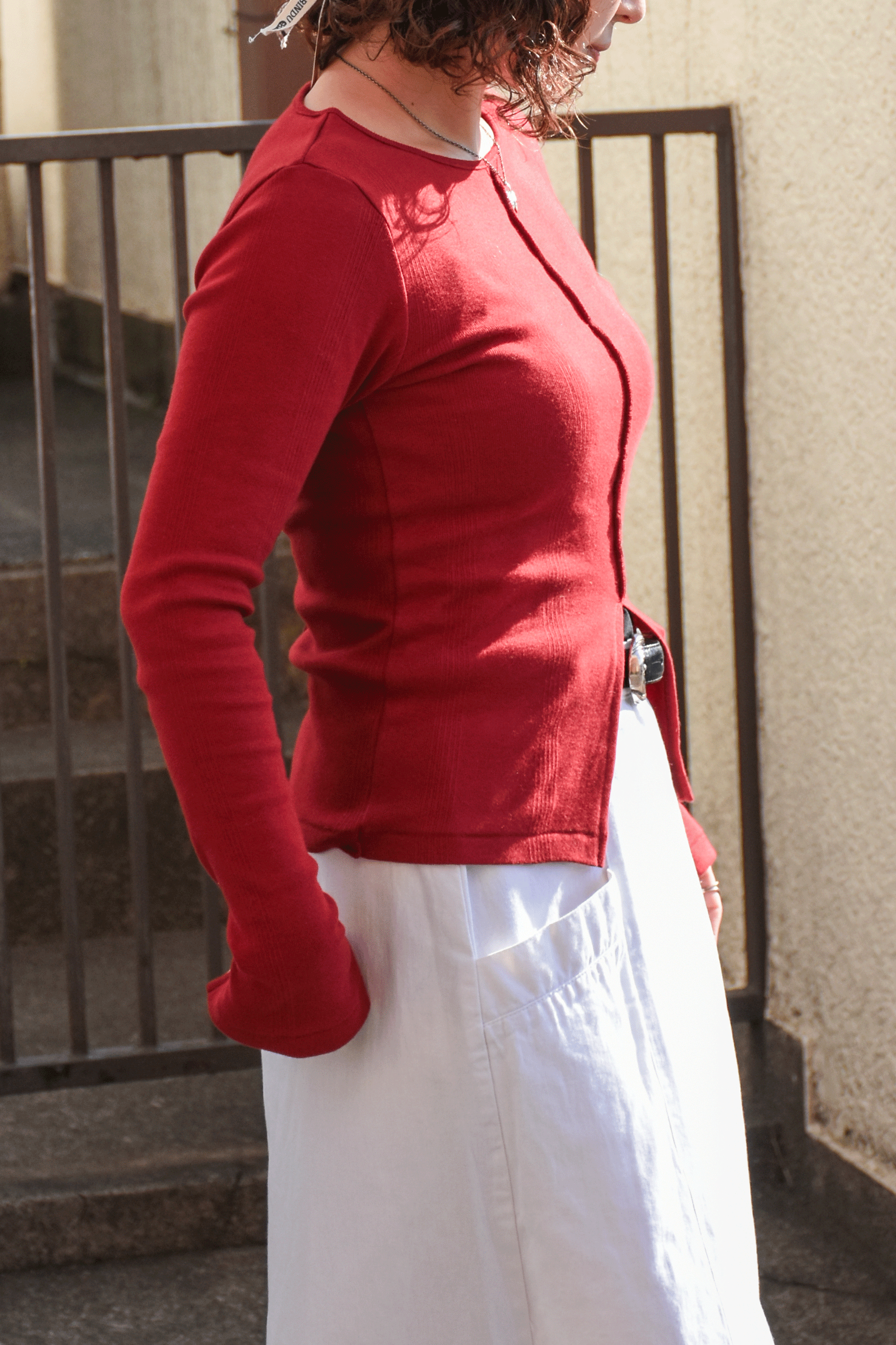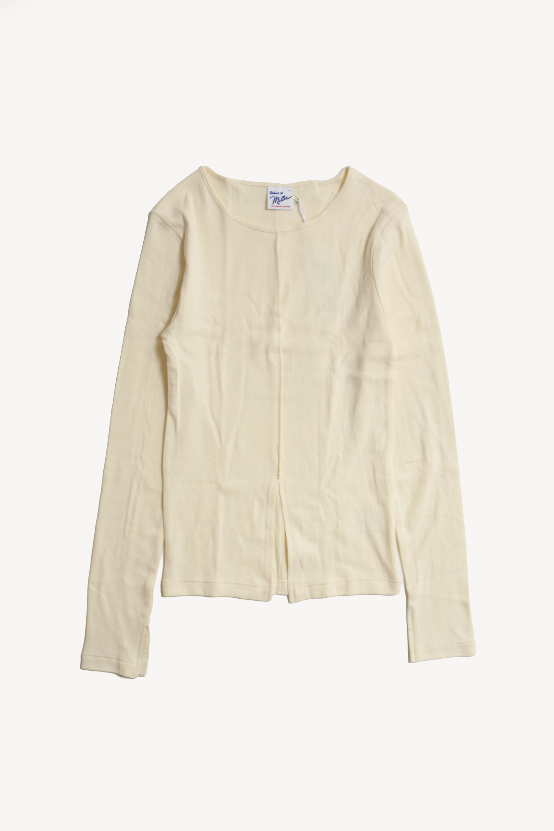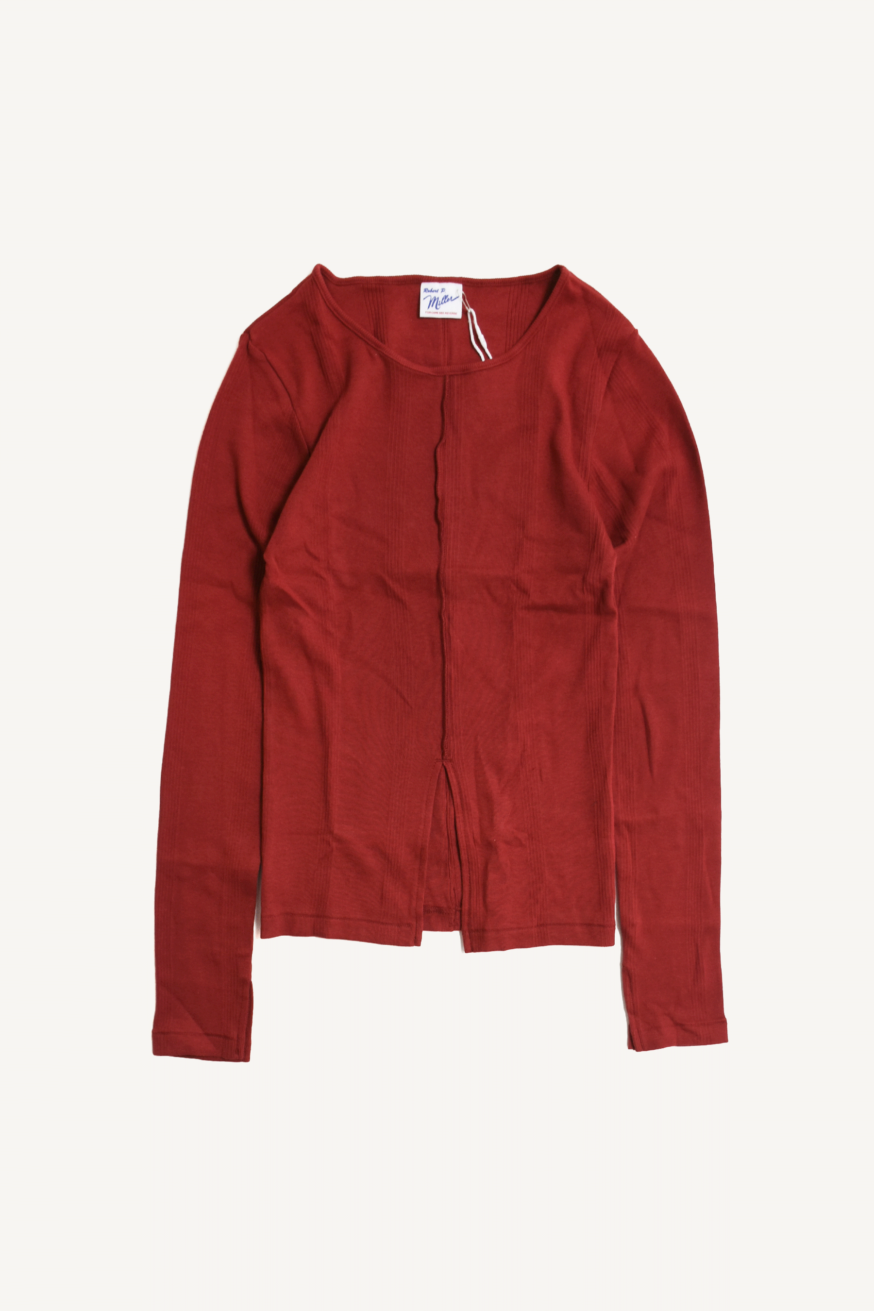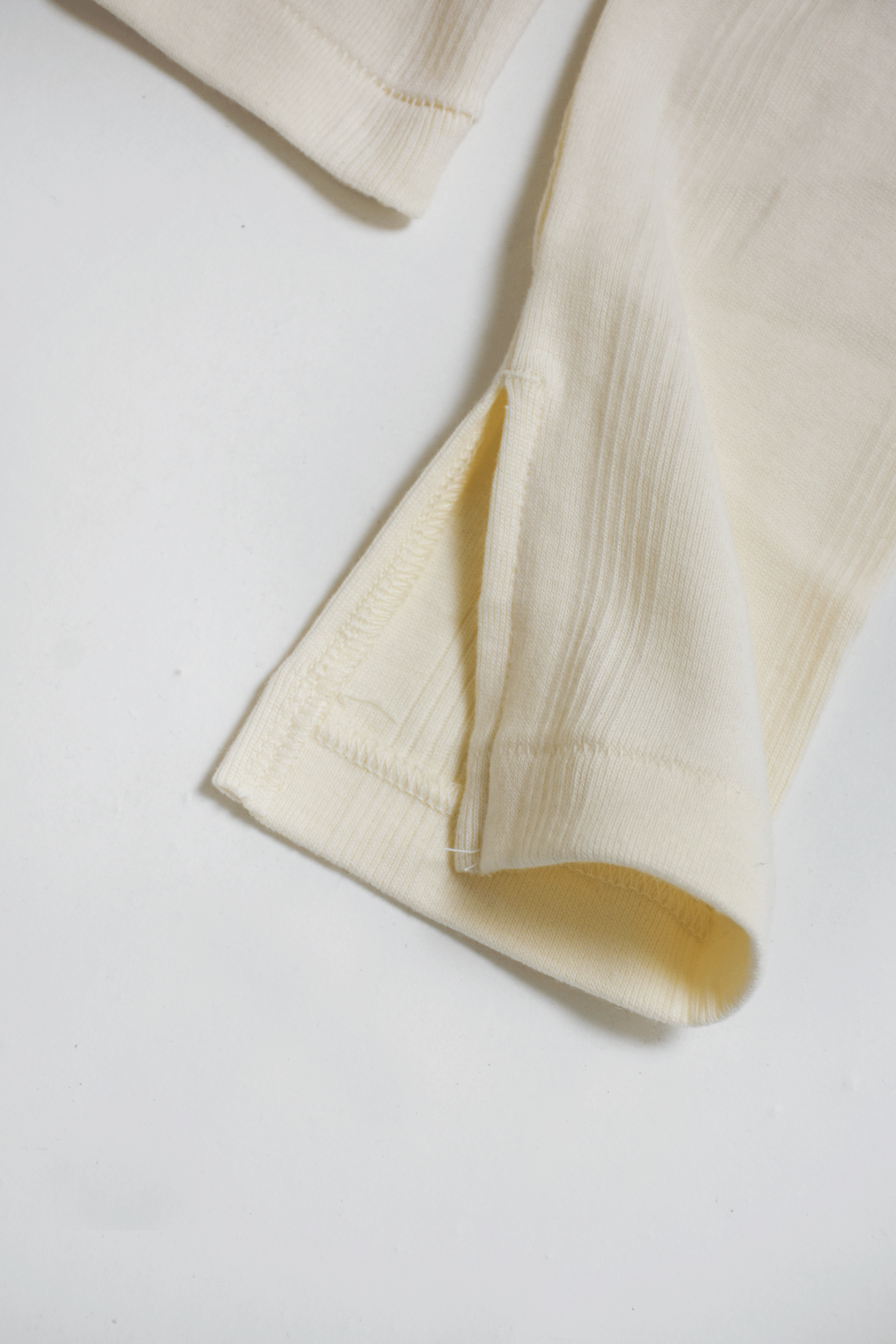 ニットのように凹凸のある柄のような編み地のパネルリブを採用した程よい厚さがいいロングスリーブトップス。 センター裾にスリットが入っているのがバランスとりやすいです。 ピタッとしすぎない程よいフィット感と厚さが何枚持っていたい気持ちいい素材です。