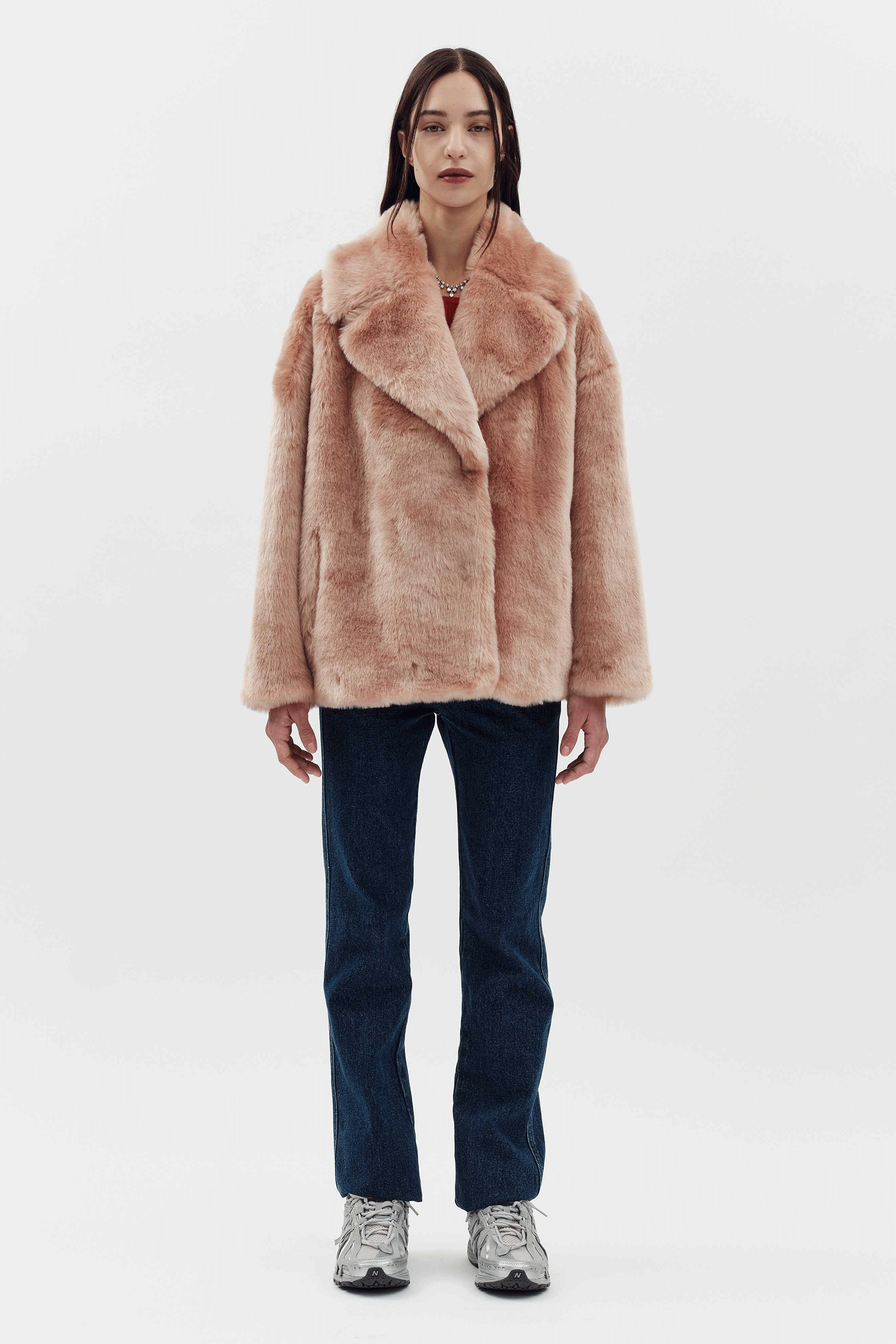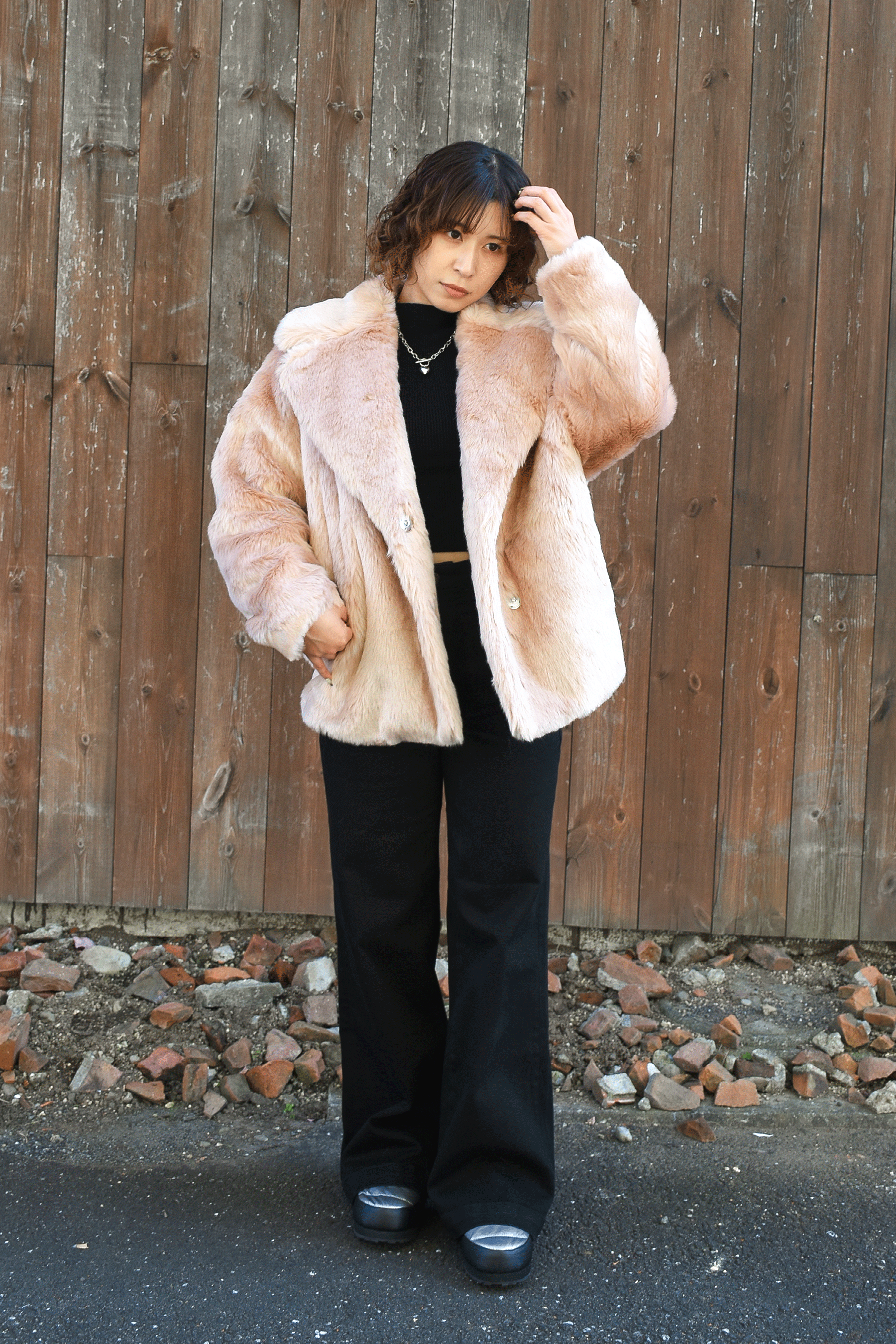 肩を落としたボックスシェーブシルエットの淡いピンクのジャケット