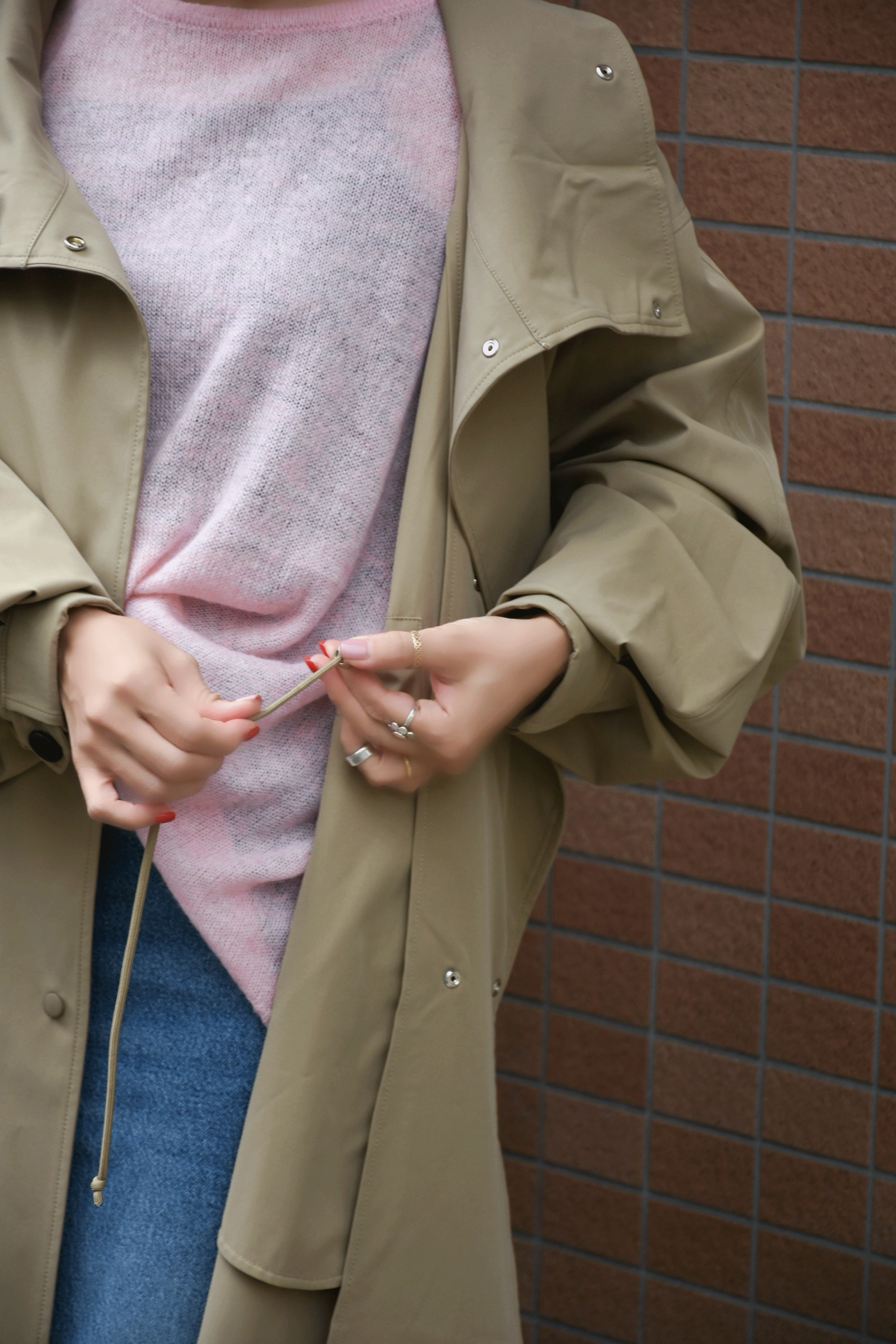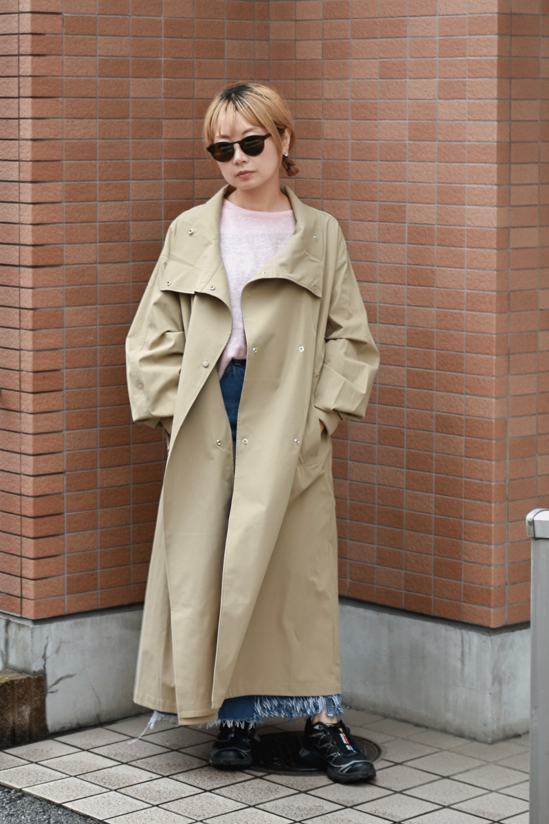 大きめのスタンドカラーが特徴のトレンチとウインドブレーカーの要素を掛け合わせたロングコート。シワになりにくく扱いやすい素材を使用していて軽量感のある着心地です。