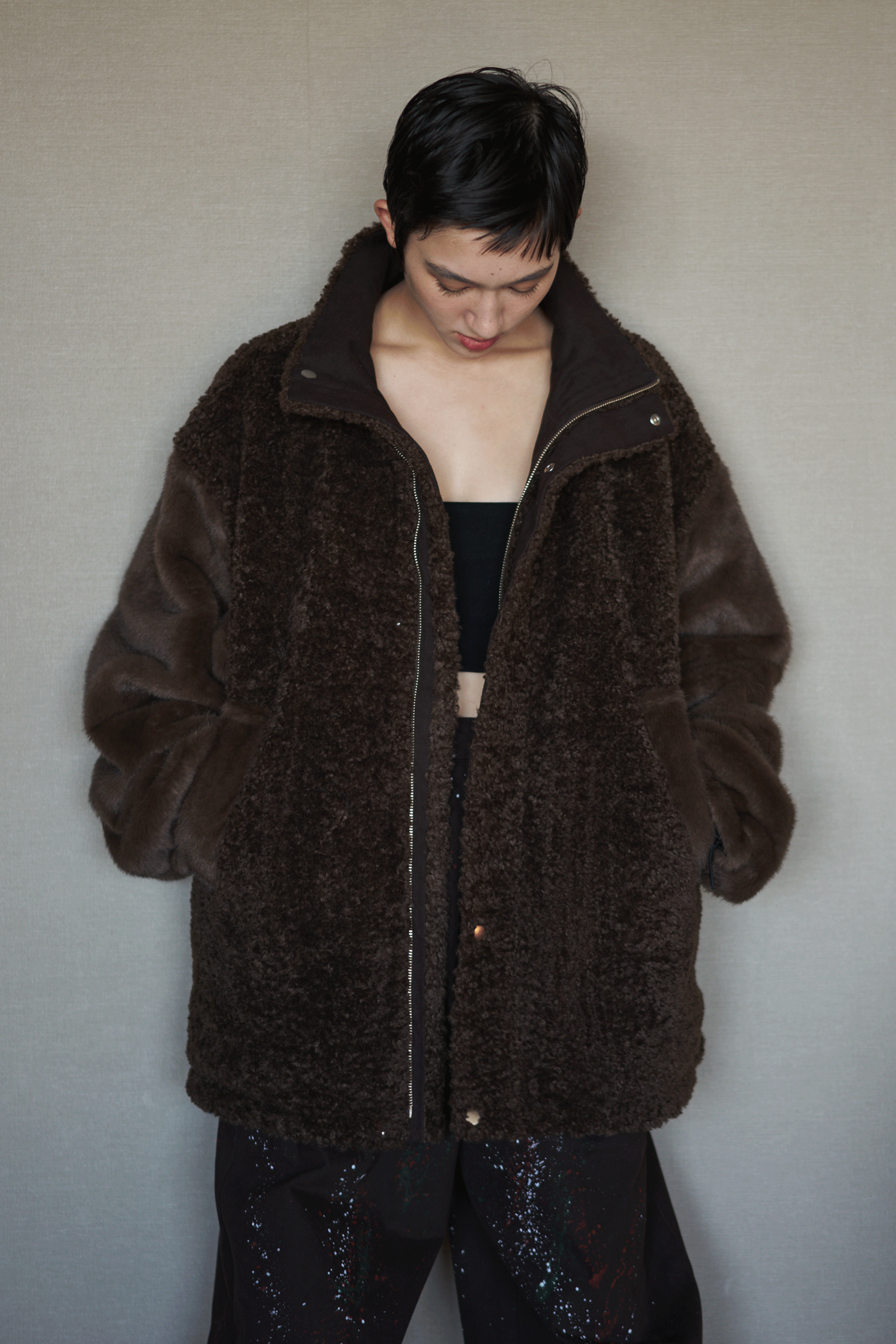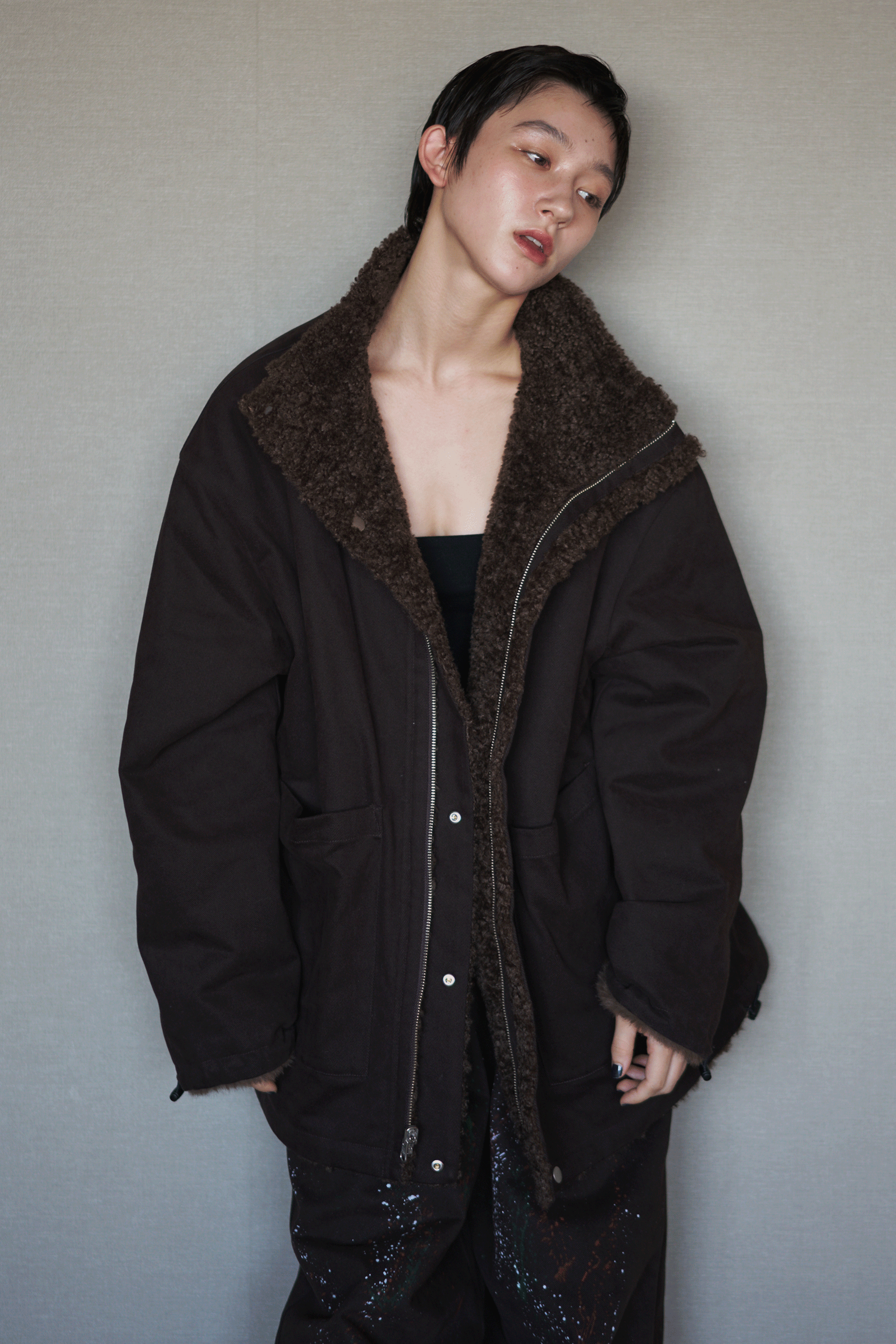 ファーとボアが組み合わさった面と、少し起毛感のあるコットンチノ素材面をリバーシブルで楽しめるブルゾンコート。