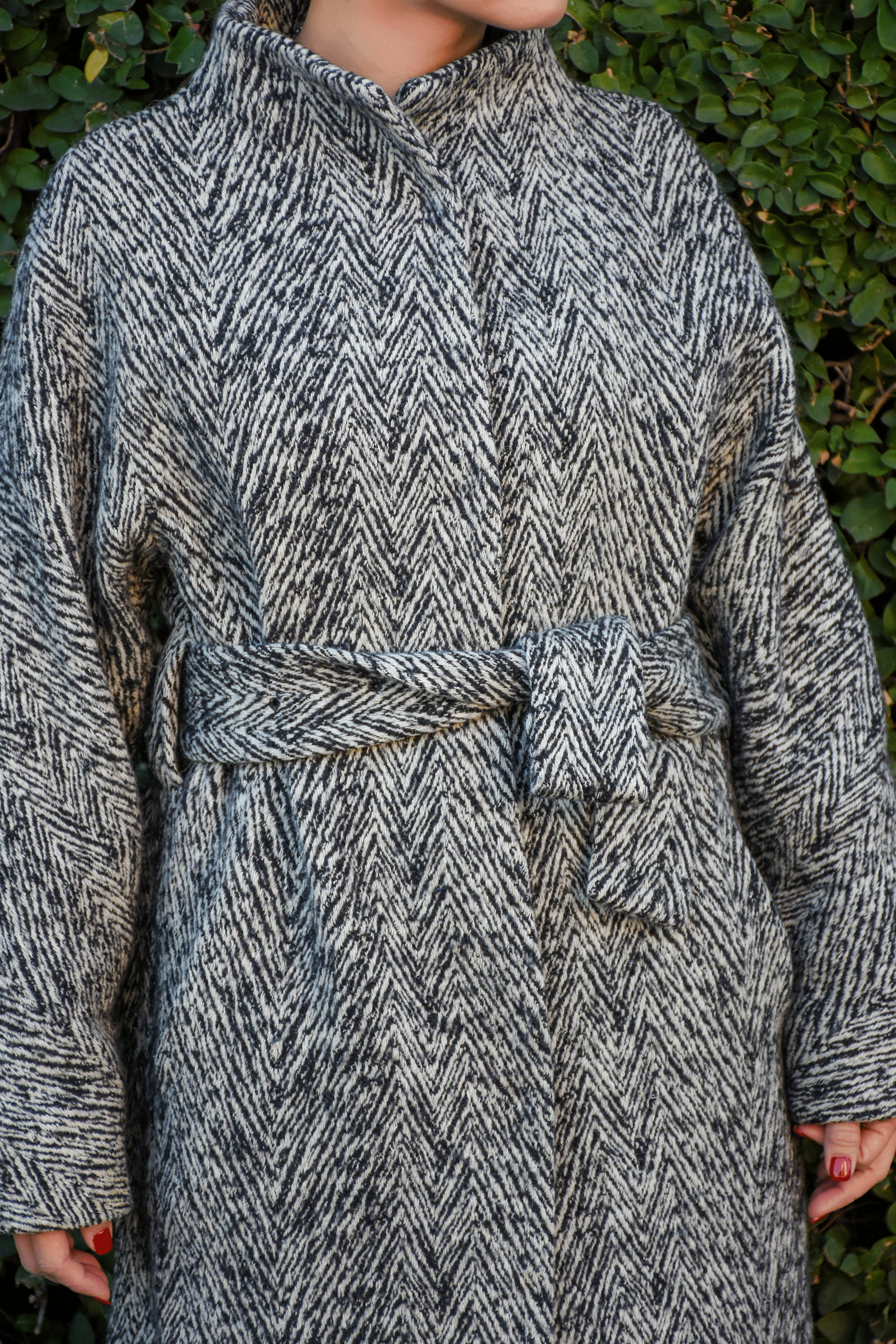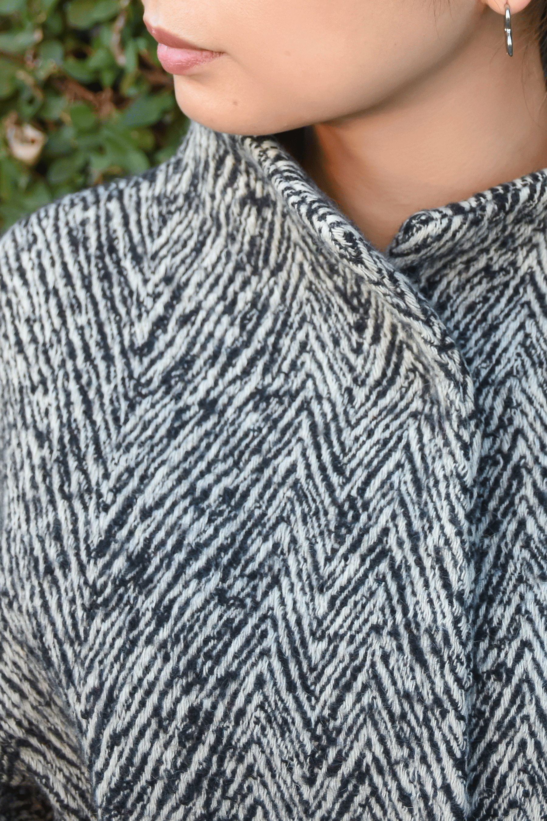 ヴィンテージのアドルフォドミンゲのロングコート。ビックヘリンボーンのような柄で着られると話題のようなデザインです。周りの襟がつかない低めのスタンドカラーでシンプルにもまとめてくれます。